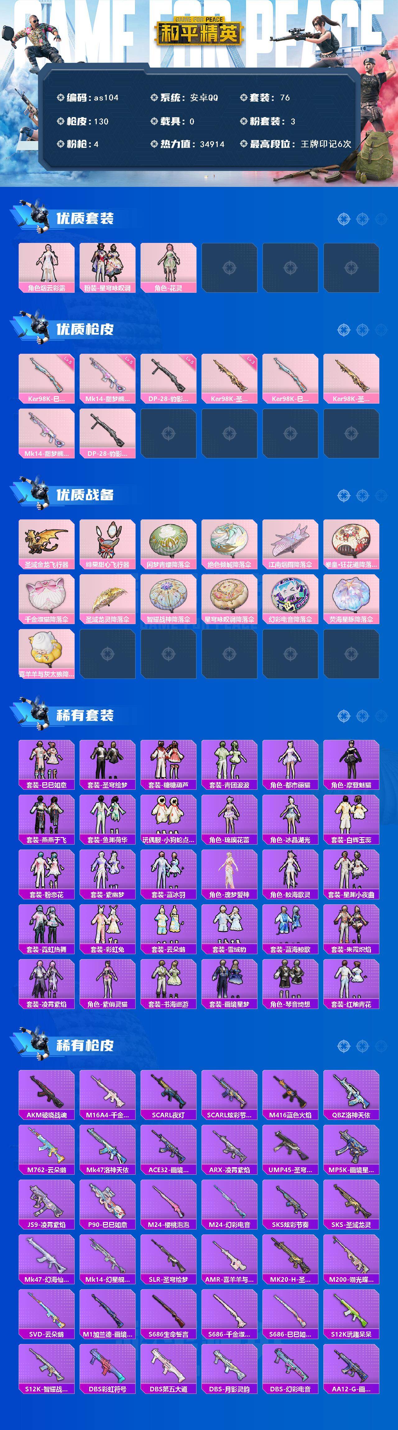安卓 手q-3粉装-4特效呛-0载具-3粉色飞行器-34914热力值-6王牌印记-76套装-130呛皮 【粉色套装】:角色-烟云彩露,粉装-星穹咏叹调,角色-花灵 【粉色呛皮等级】:kar98k-巳巳如意五级,kar98k-圣域龙灵三级,mk14-甜梦熊击五级,dp-28-豹影疾电五级