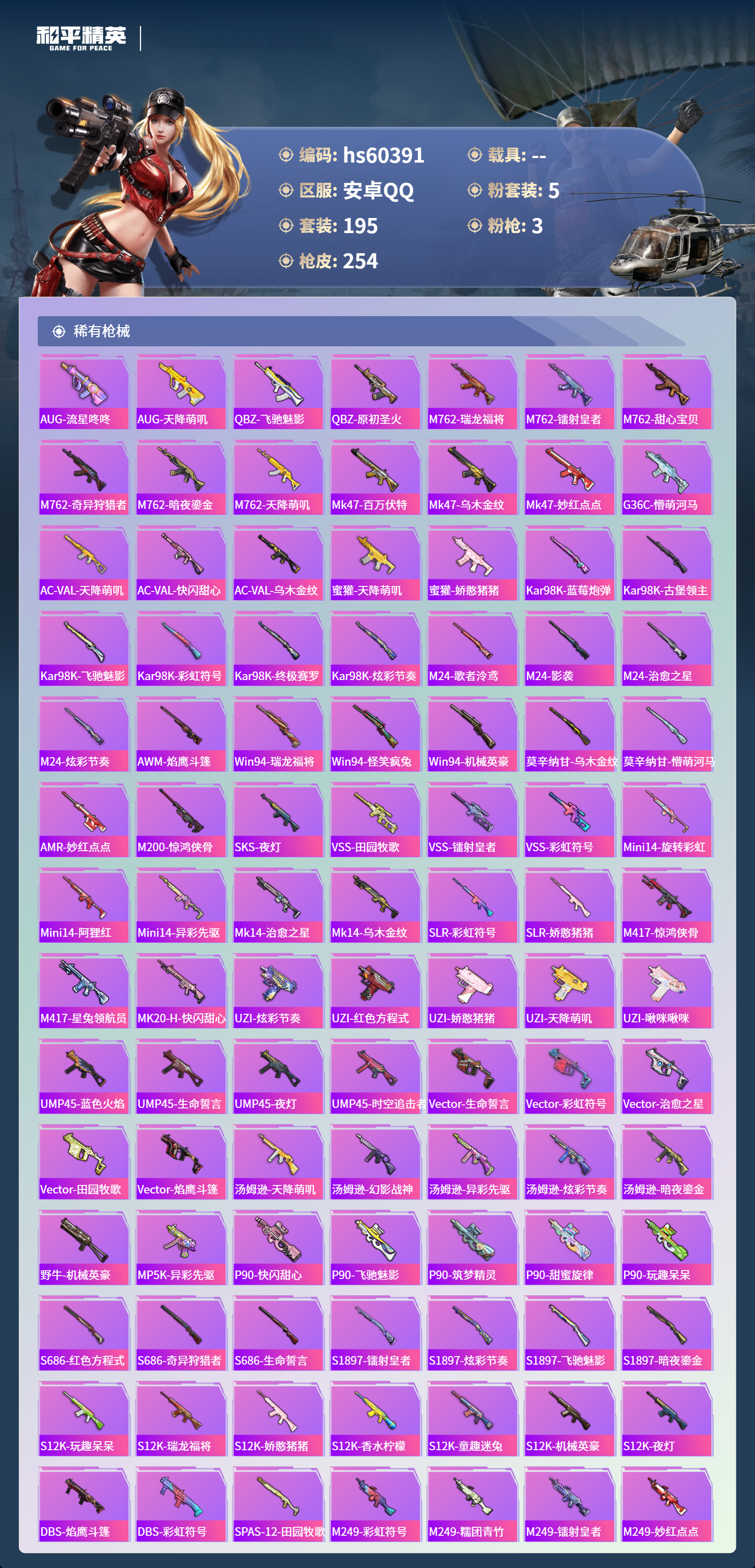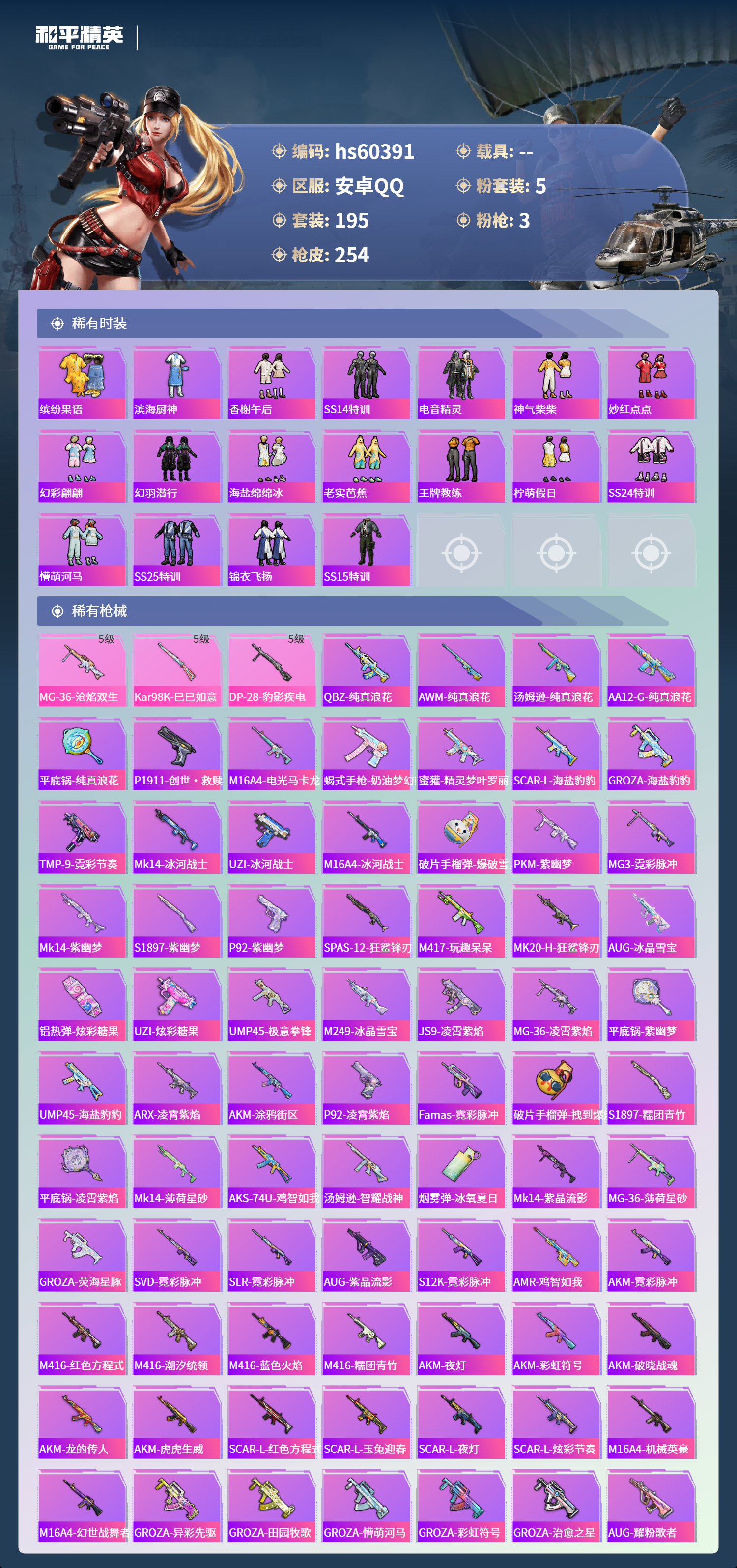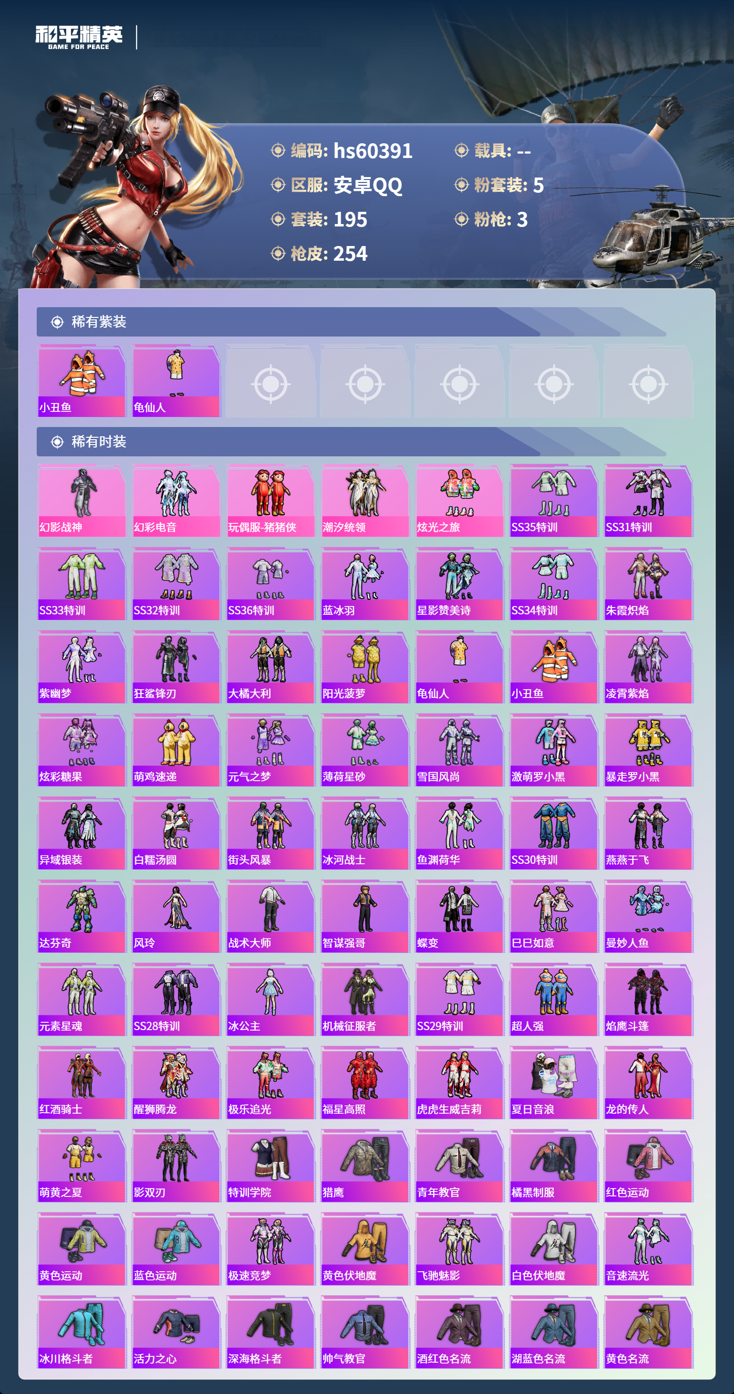 hs60391 安卓手q-6王牌印记-5粉装-3特效呛-74932热力值-195套装-254呛皮【5粉装】玩偶服-猪猪侠套装-潮汐统领套装-幻彩电音套装-炫光之旅套装-幻影战神【3特效呛】mg-36-沧焰双生/5级dp-28-豹影疾电/5级kar98k-巳巳如意/5级【2稀有紫装】小丑鱼龟仙人【193稀有时装】幻影战神幻彩电音ss35特训ss31特训ss33特训ss