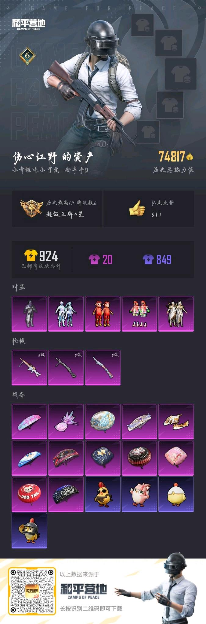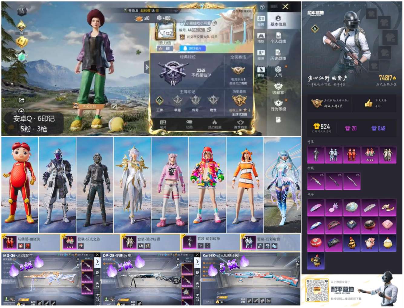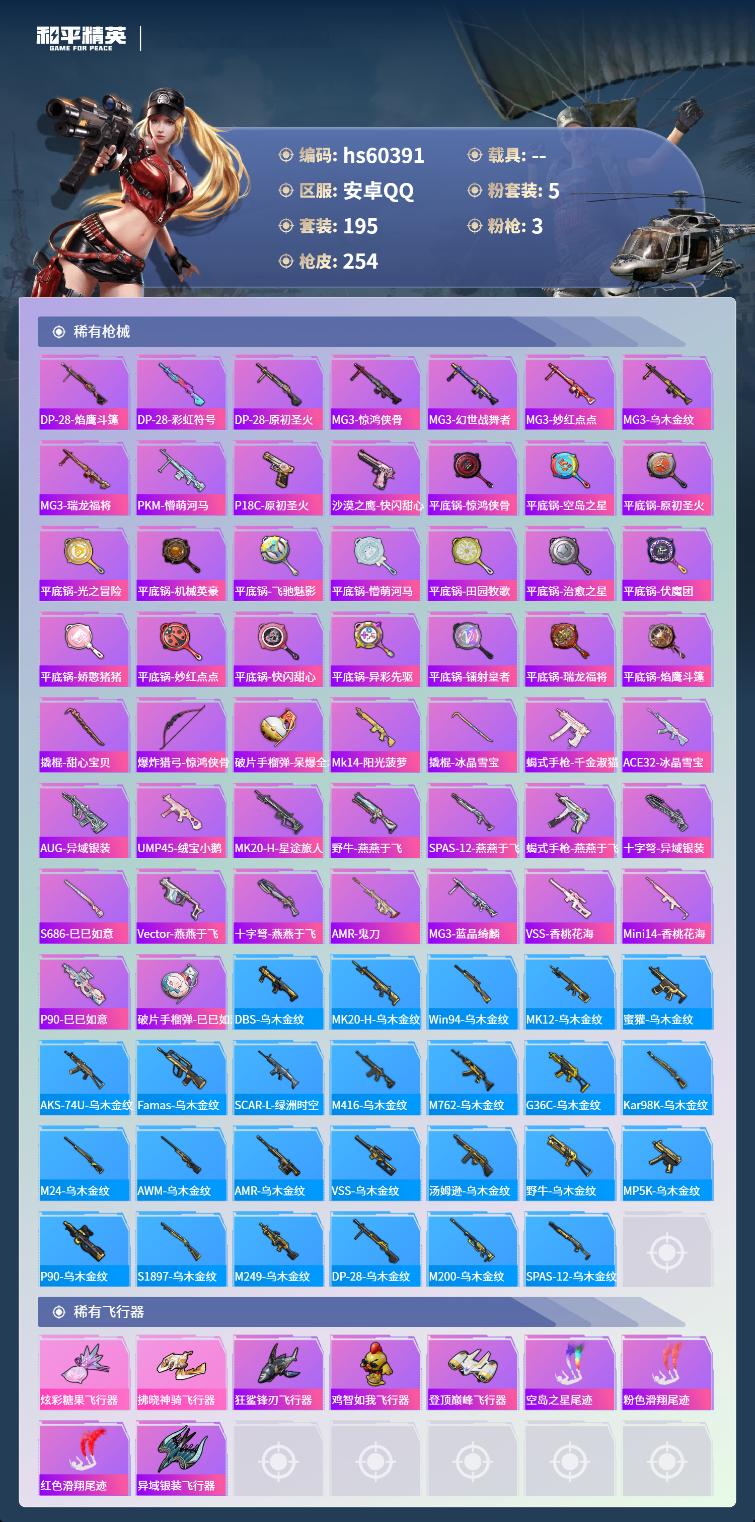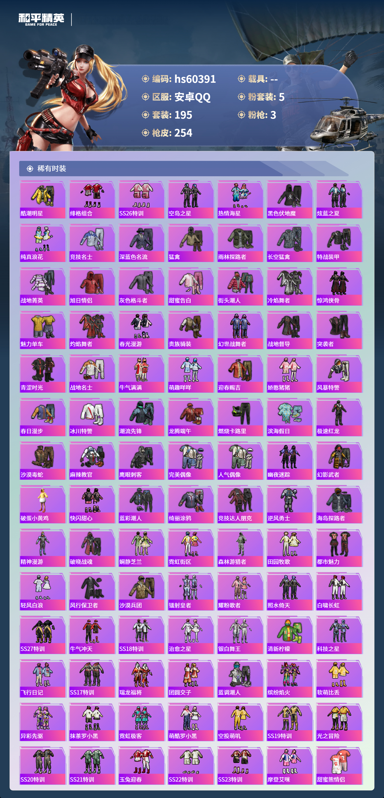 hs60391 安卓手q-6王牌印记-5粉装-3特效呛-74932热力值-195套装-254呛皮【5粉装】玩偶服-猪猪侠套装-潮汐统领套装-幻彩电音套装-炫光之旅套装-幻影战神【3特效呛】mg-36-沧焰双生/5级dp-28-豹影疾电/5级kar98k-巳巳如意/5级【2稀有紫装】小丑鱼龟仙人【193稀有时装】幻影战神幻彩电音ss35特训ss31特训ss33特训ss
