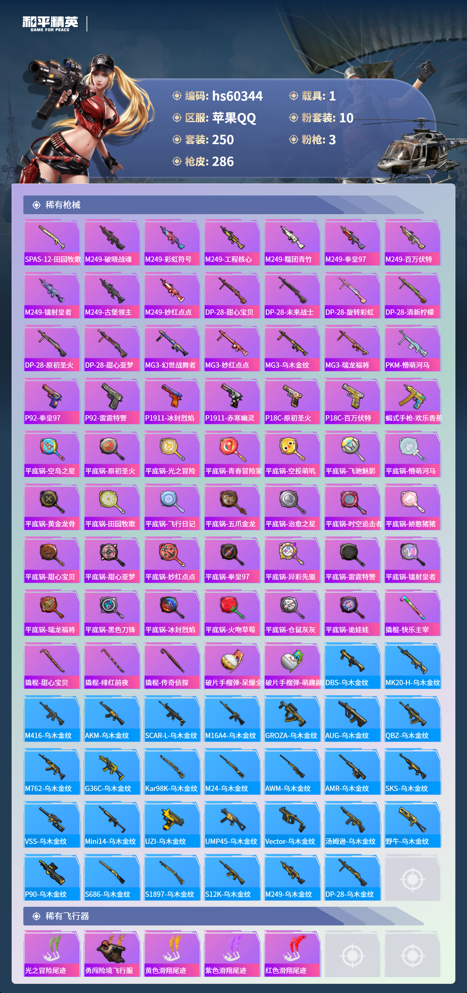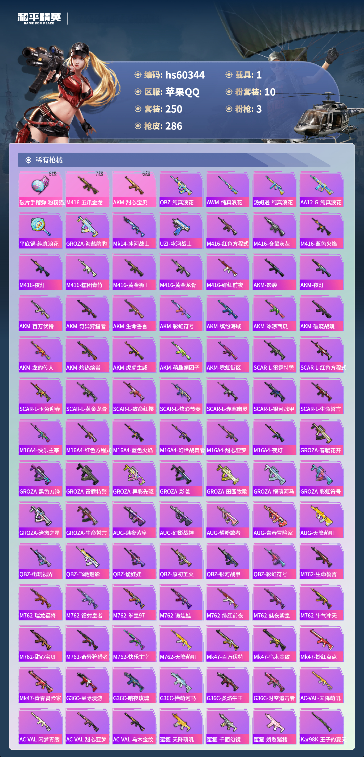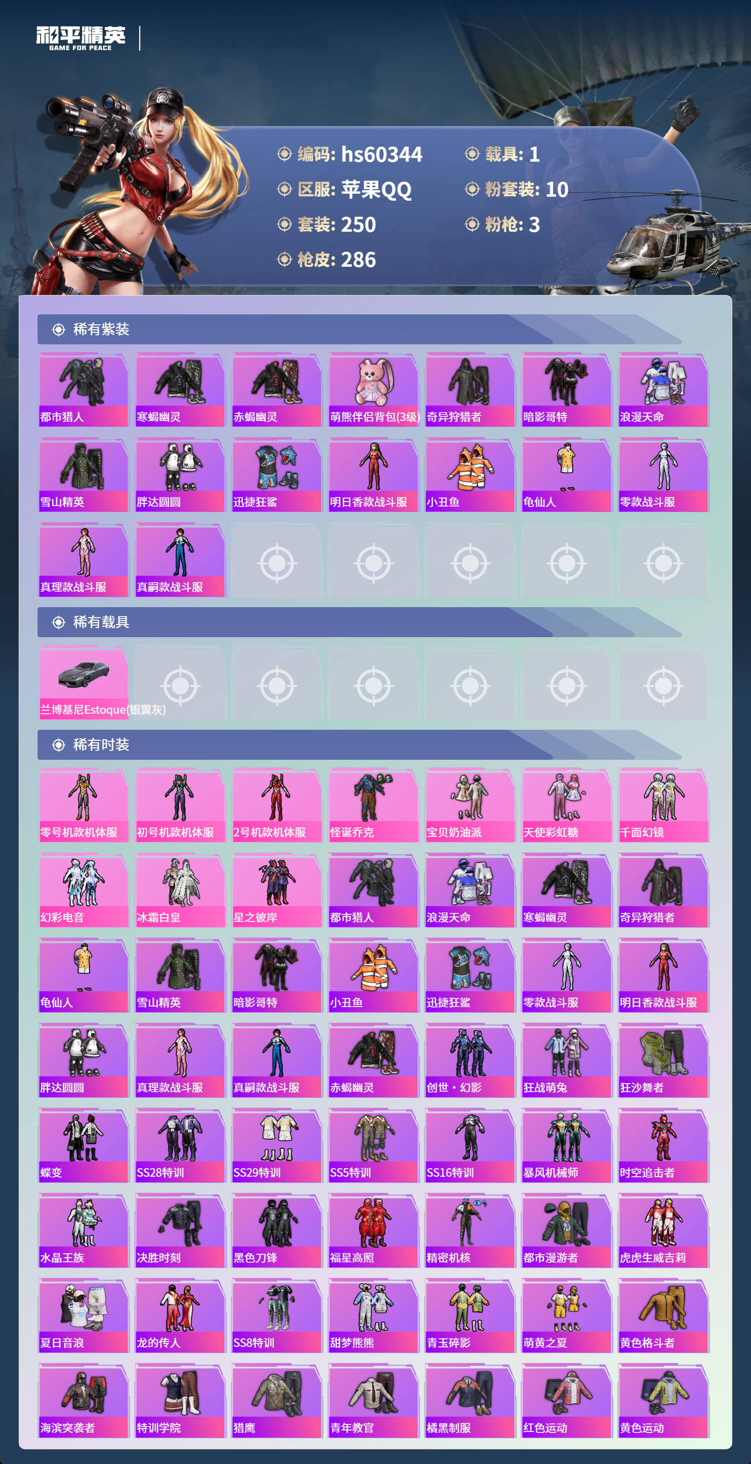 1载具-250套装-286呛皮-hs60344 苹果手q-11王牌印记-有战神框-10粉装-3特效呛-1载具-93105热力值-250套装-286呛皮-1卓越印记-1传奇印记【10粉装】套装-星之彼岸套装-千面幻镜角色-零号机款机体服套装-冰霜白皇套装-天使彩虹糖角色-初号机款机体服套装-宝贝奶油派套装-幻彩电音角色-2号机款机体服套装-怪诞乔克【3特效呛】破片手留单-粉粉猫爪/6级m416-五爪金龙/7
