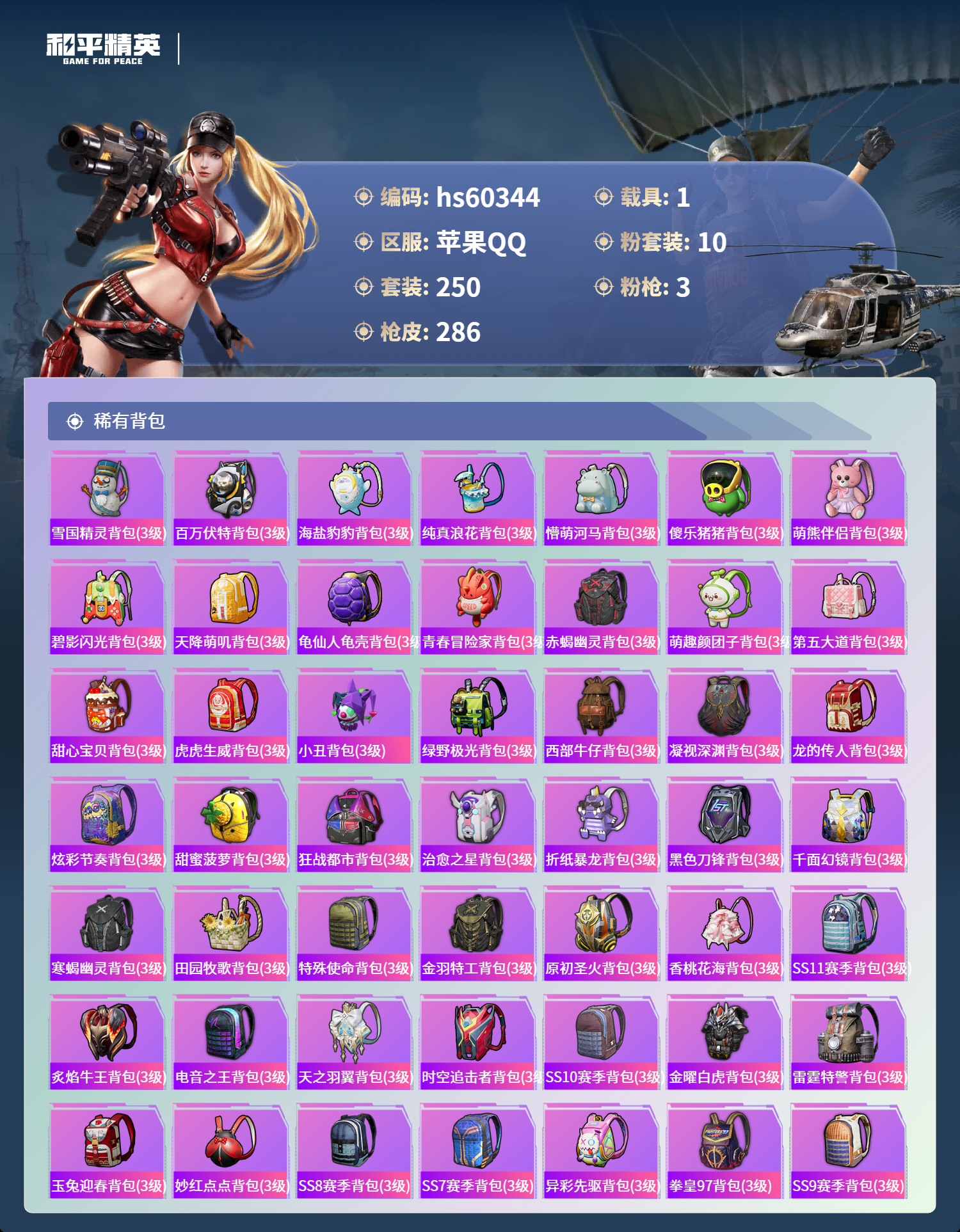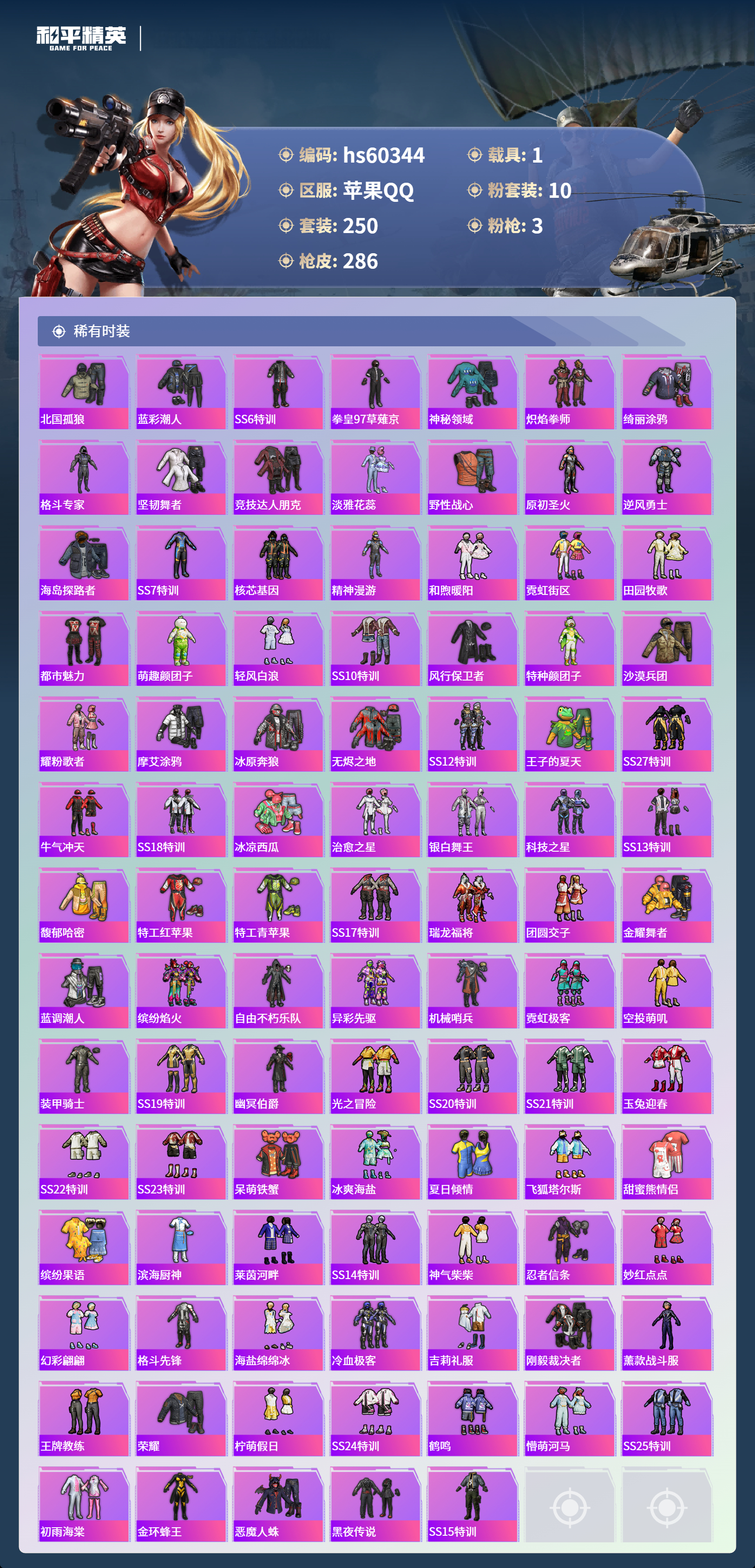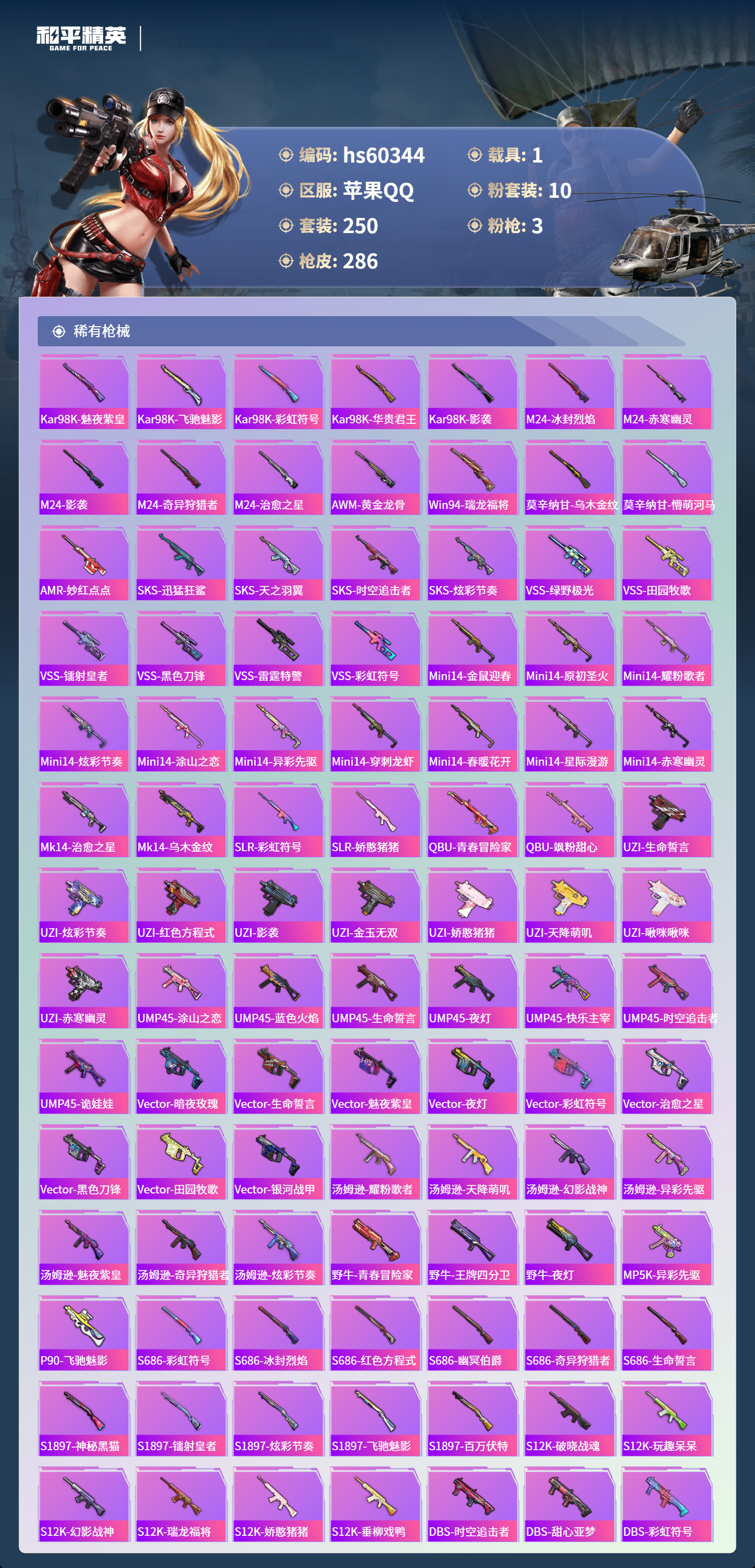 1载具-250套装-286呛皮-hs60344 苹果手q-11王牌印记-有战神框-10粉装-3特效呛-1载具-93105热力值-250套装-286呛皮-1卓越印记-1传奇印记【10粉装】套装-星之彼岸套装-千面幻镜角色-零号机款机体服套装-冰霜白皇套装-天使彩虹糖角色-初号机款机体服套装-宝贝奶油派套装-幻彩电音角色-2号机款机体服套装-怪诞乔克【3特效呛】破片手留单-粉粉猫爪/6级m416-五爪金龙/7