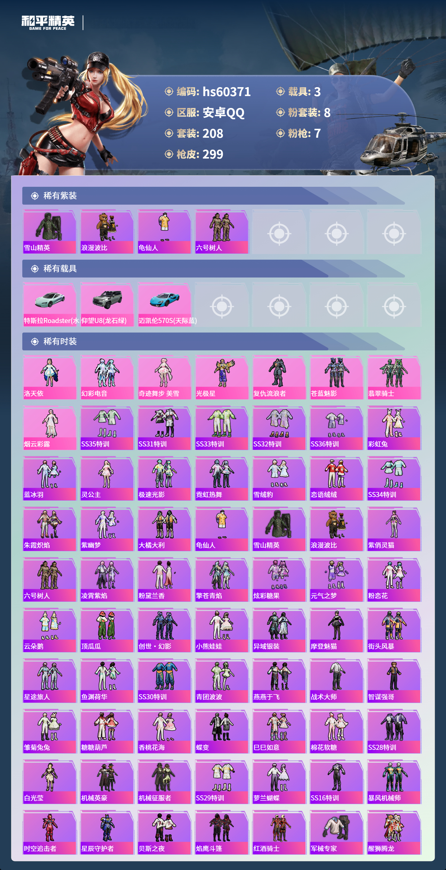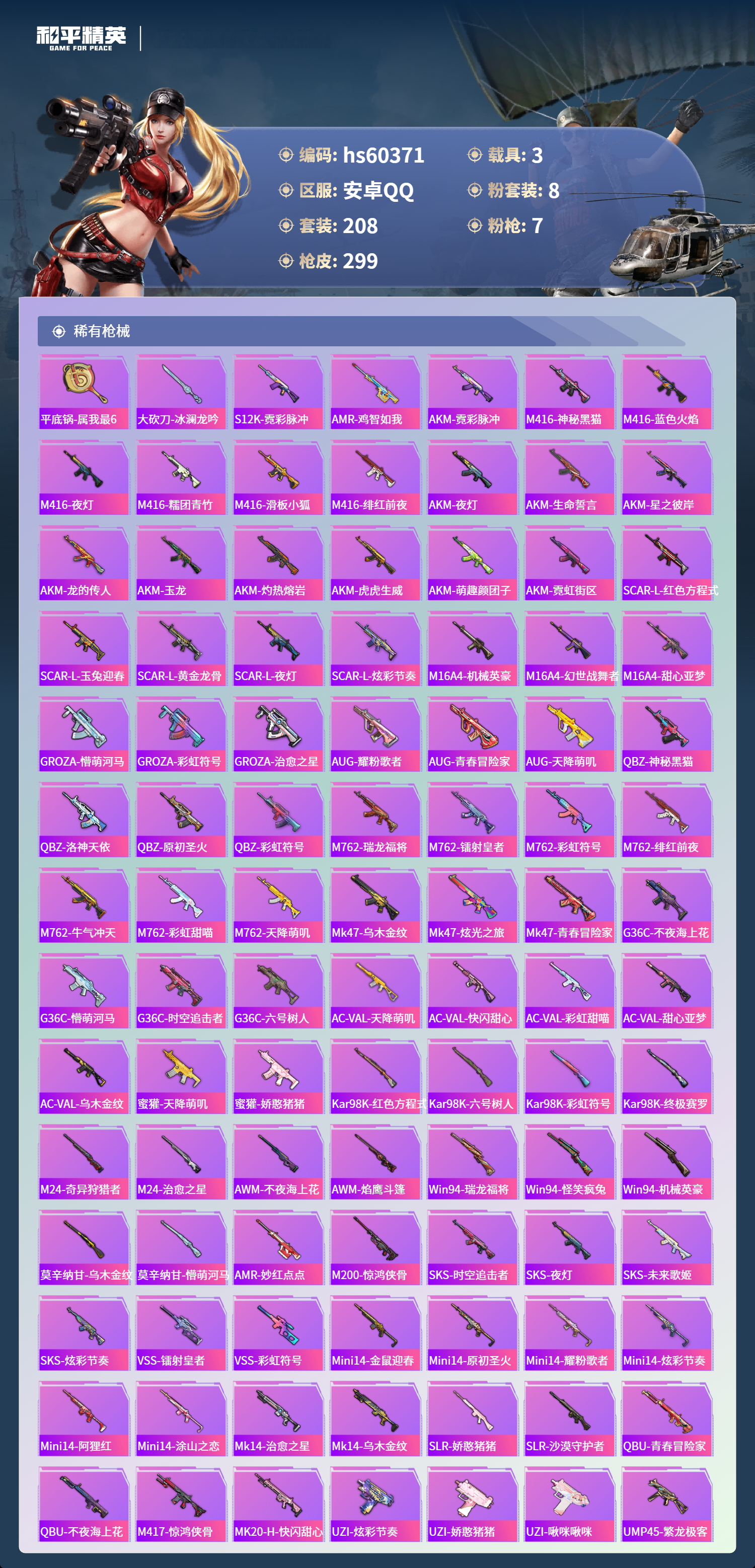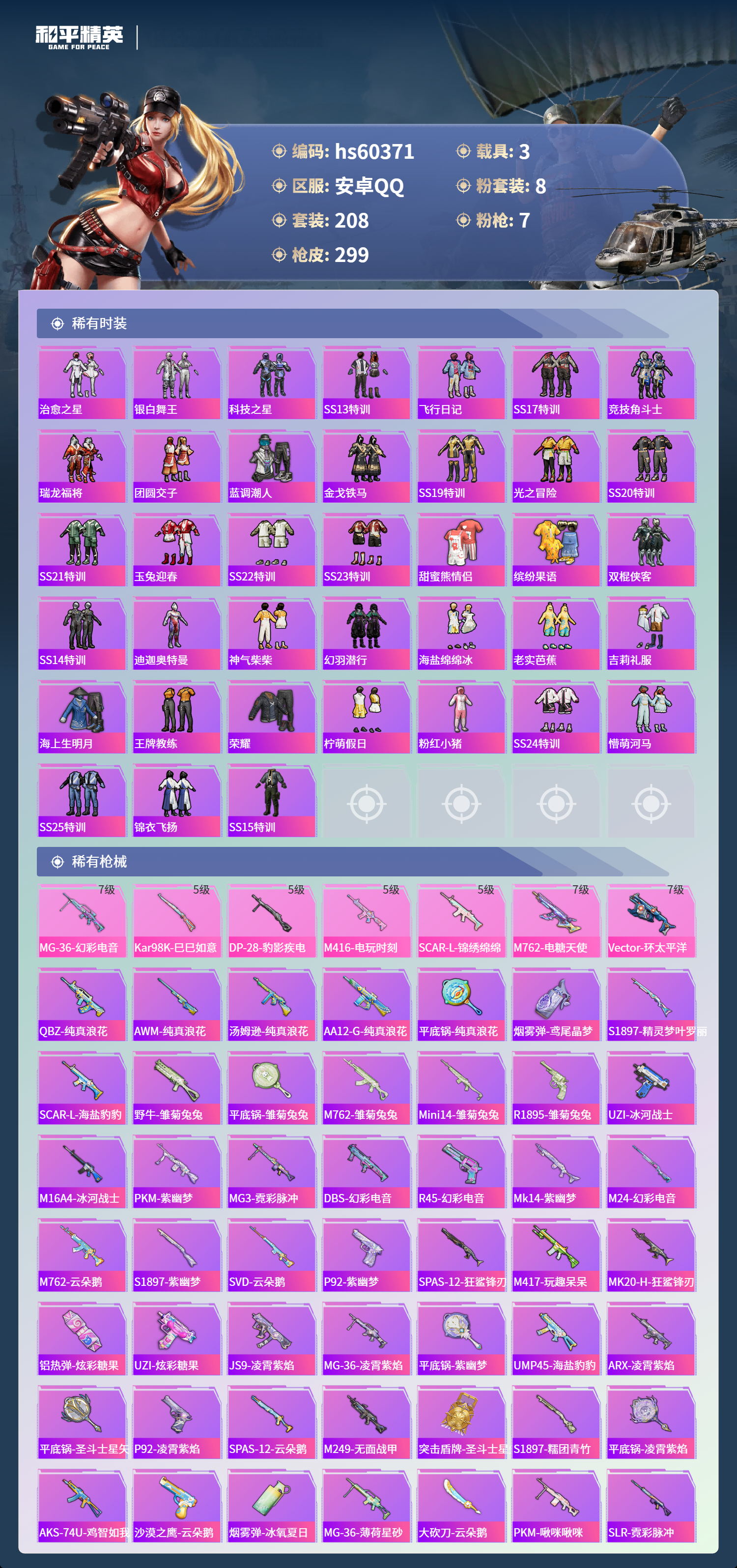 3载具-208套装-299呛皮-hs60371 安卓手q-6王牌印记-8粉装-7特效呛-3载具-热力值-208套装-299呛皮-3卓越印记-1传奇印记【8粉装】角色-光极星套装-幻彩电音角色-复仇流浪者套装-翡翠骑士套装-苍蓝魅影角色-烟云彩露角色-奇迹舞步 美雪角色-洛天依【7特效呛】vect-环太平洋/7级m762-电糖天使/7级scar-l-锦绣绵绵/5级mg-36-幻彩电音/7级