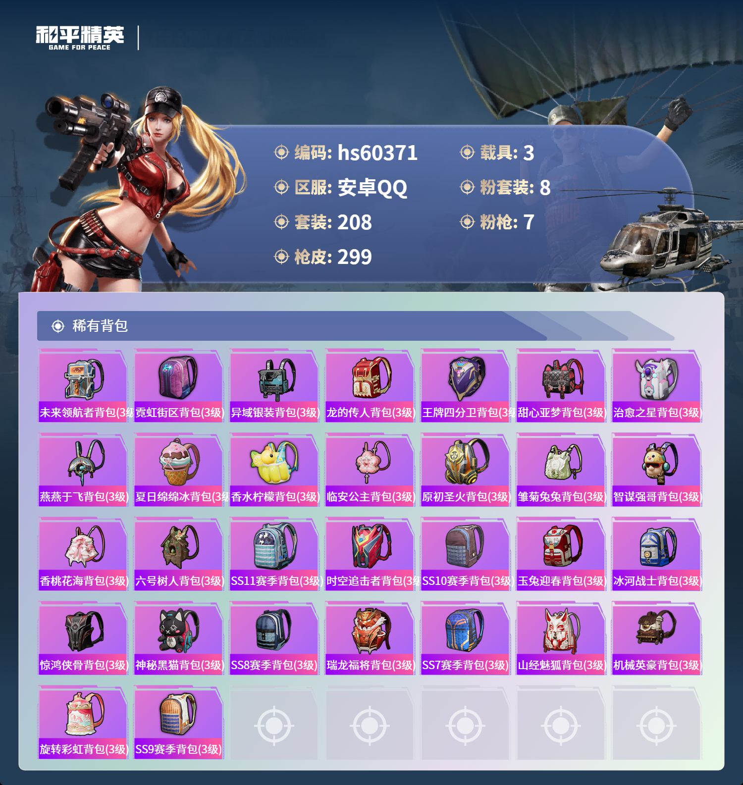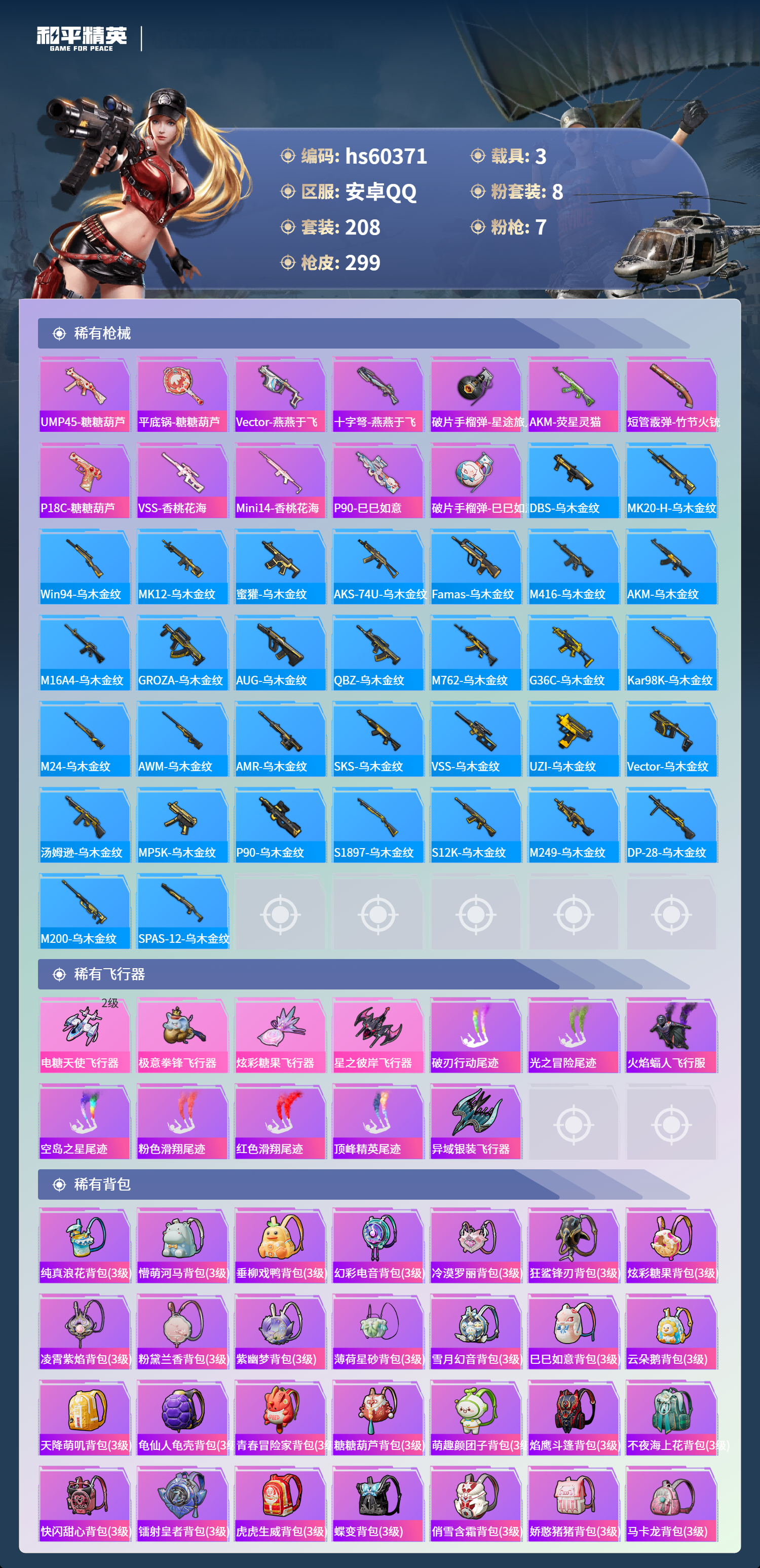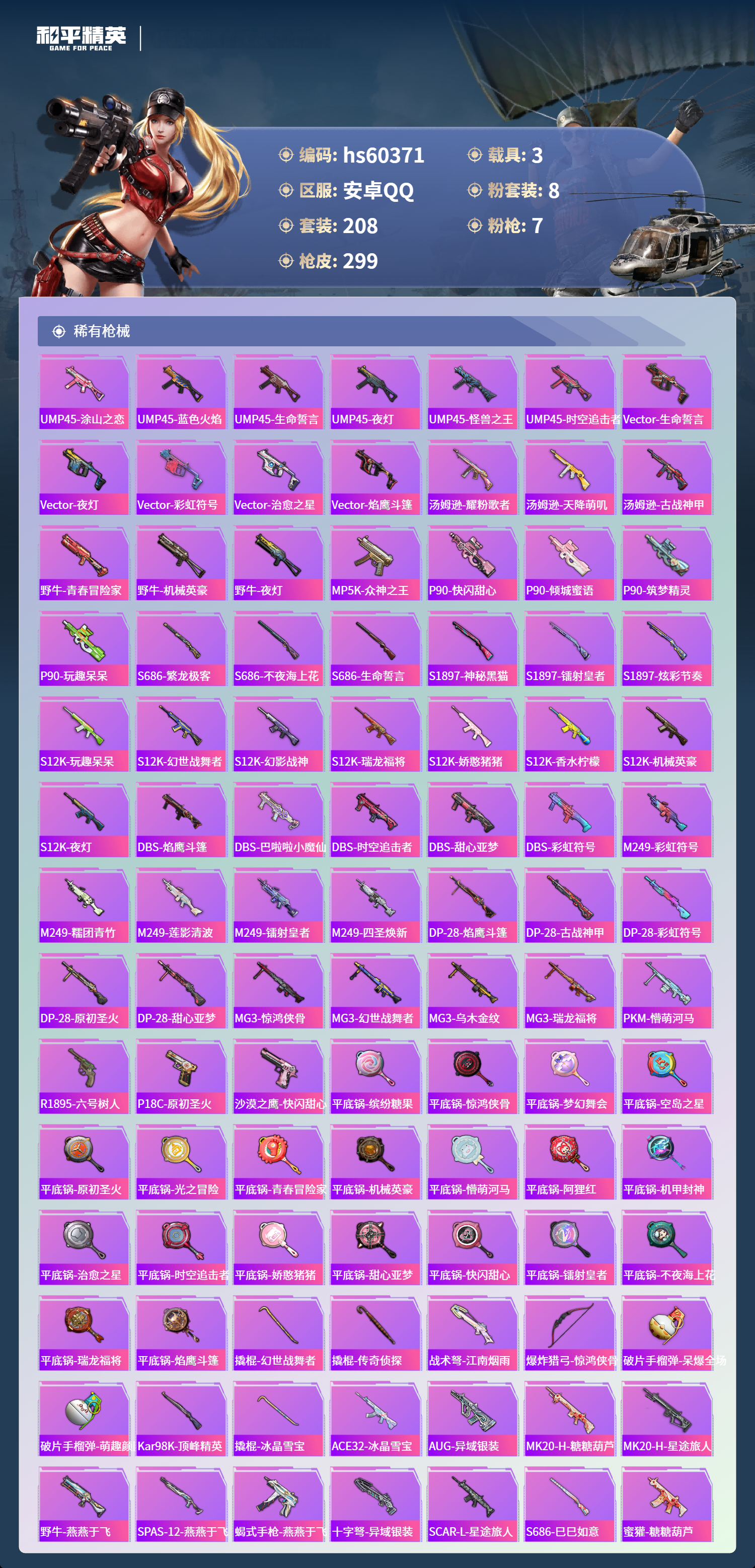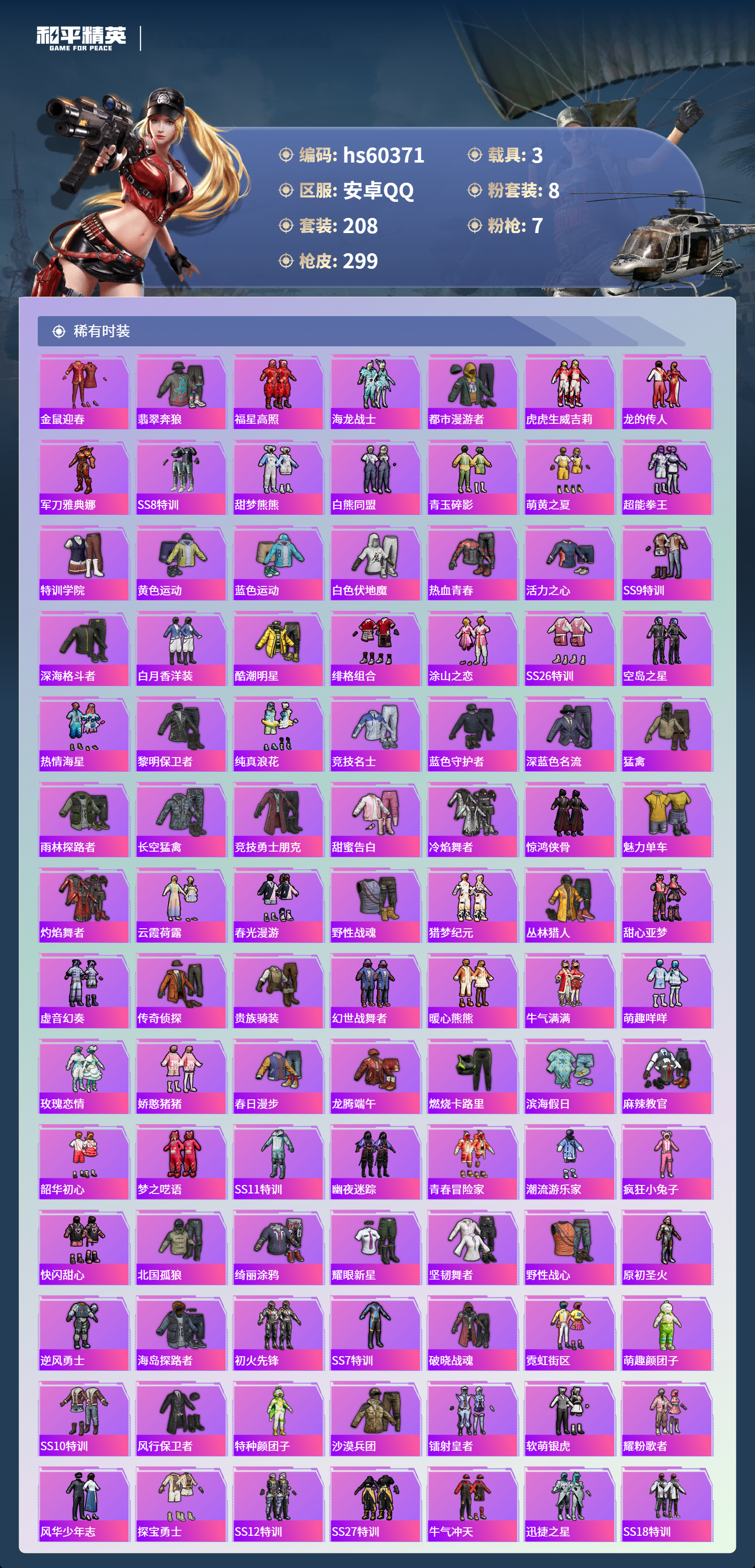 3载具-208套装-299呛皮-hs60371 安卓手q-6王牌印记-8粉装-7特效呛-3载具-热力值-208套装-299呛皮-3卓越印记-1传奇印记【8粉装】角色-光极星套装-幻彩电音角色-复仇流浪者套装-翡翠骑士套装-苍蓝魅影角色-烟云彩露角色-奇迹舞步 美雪角色-洛天依【7特效呛】vect-环太平洋/7级m762-电糖天使/7级scar-l-锦绣绵绵/5级mg-36-幻彩电音/7级