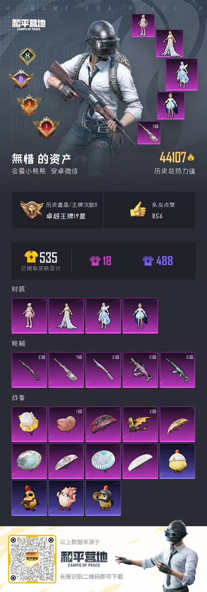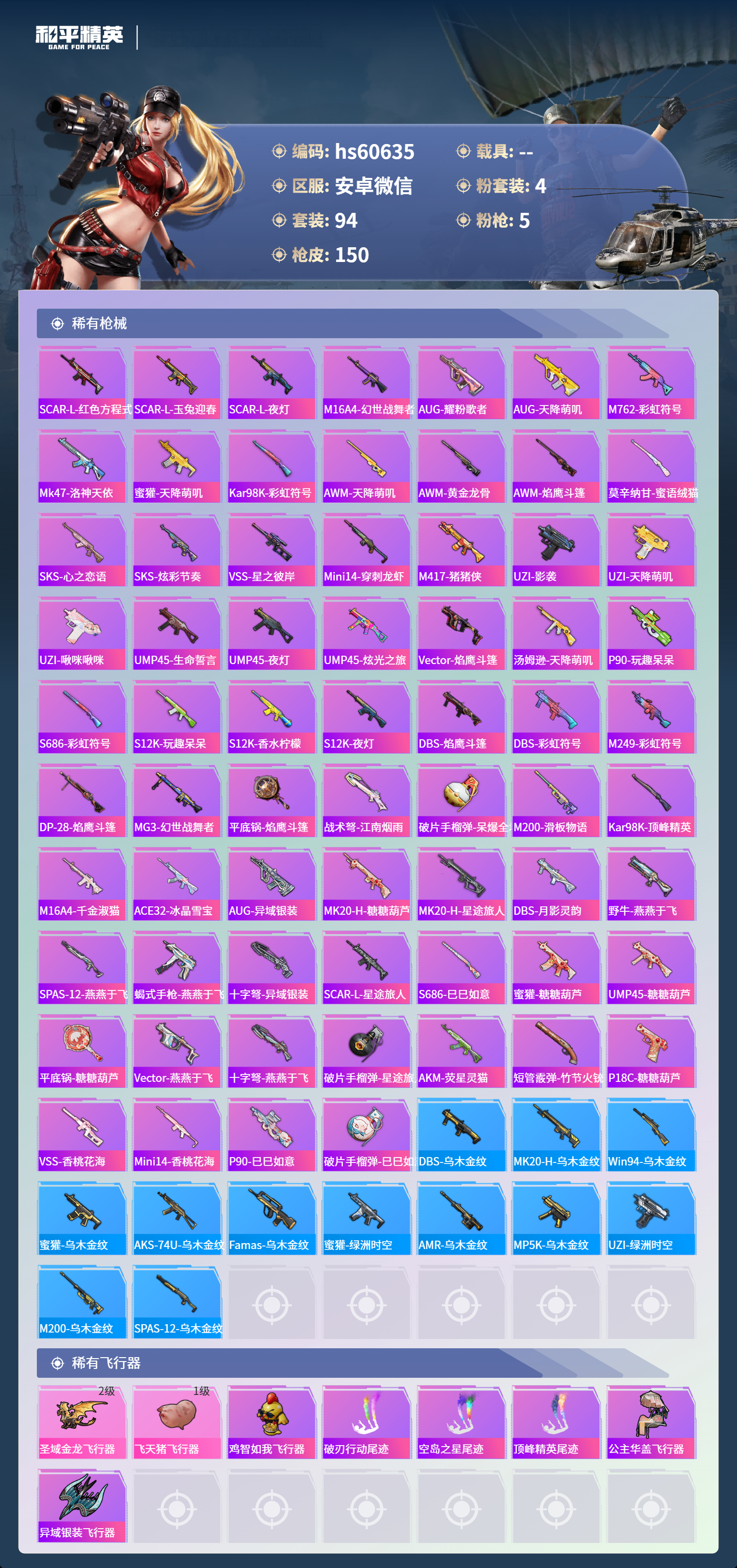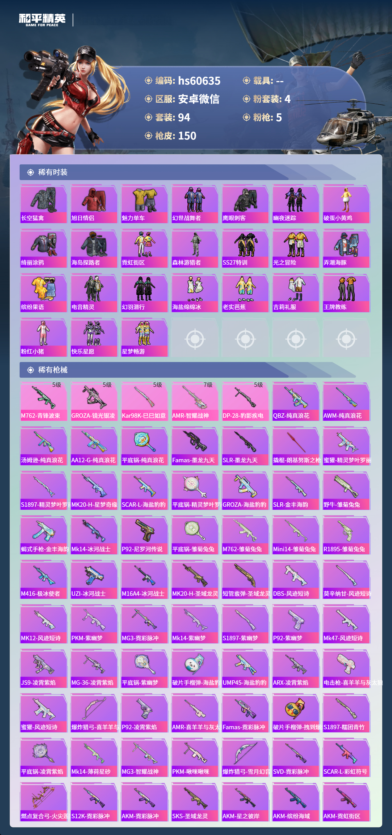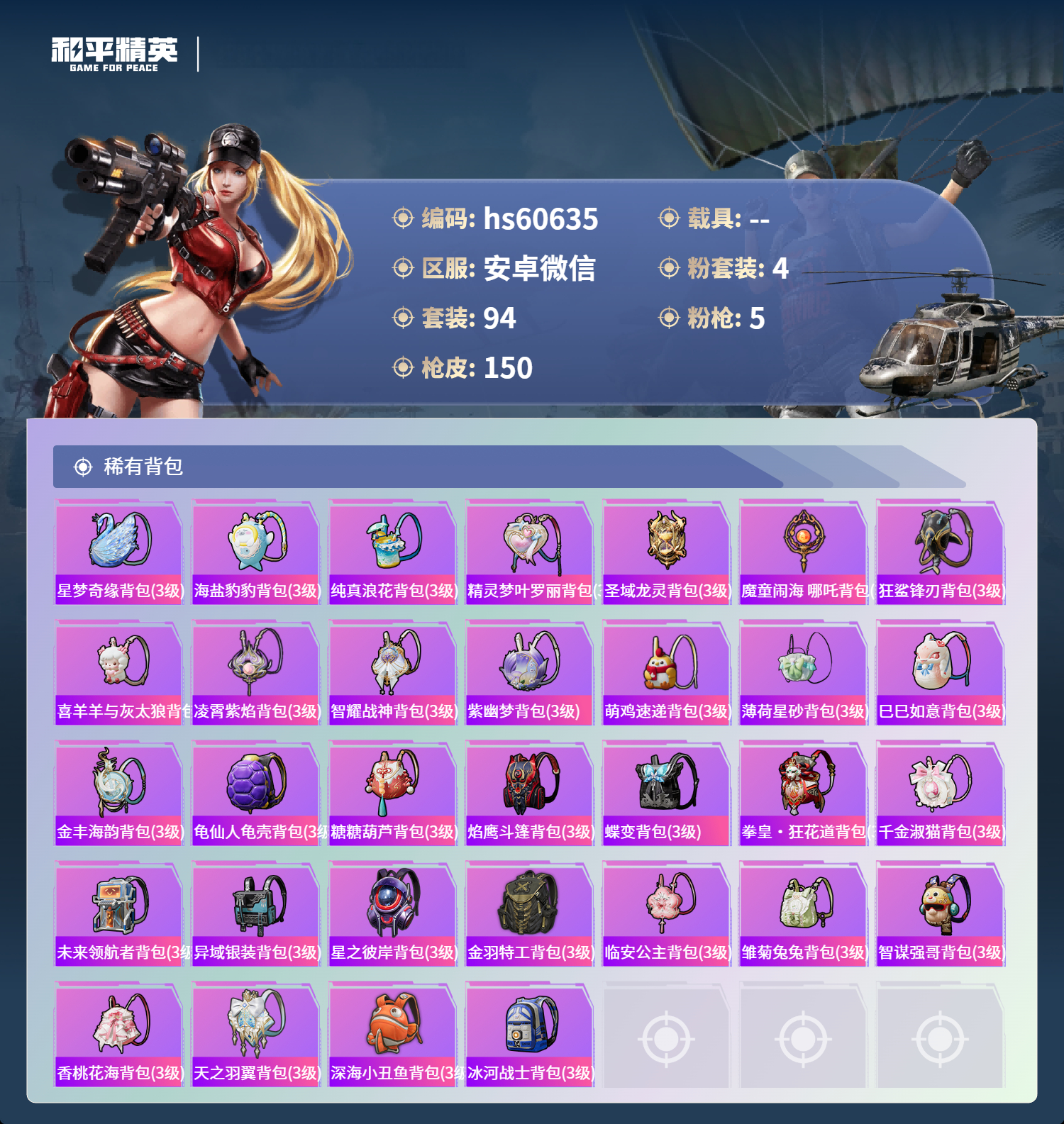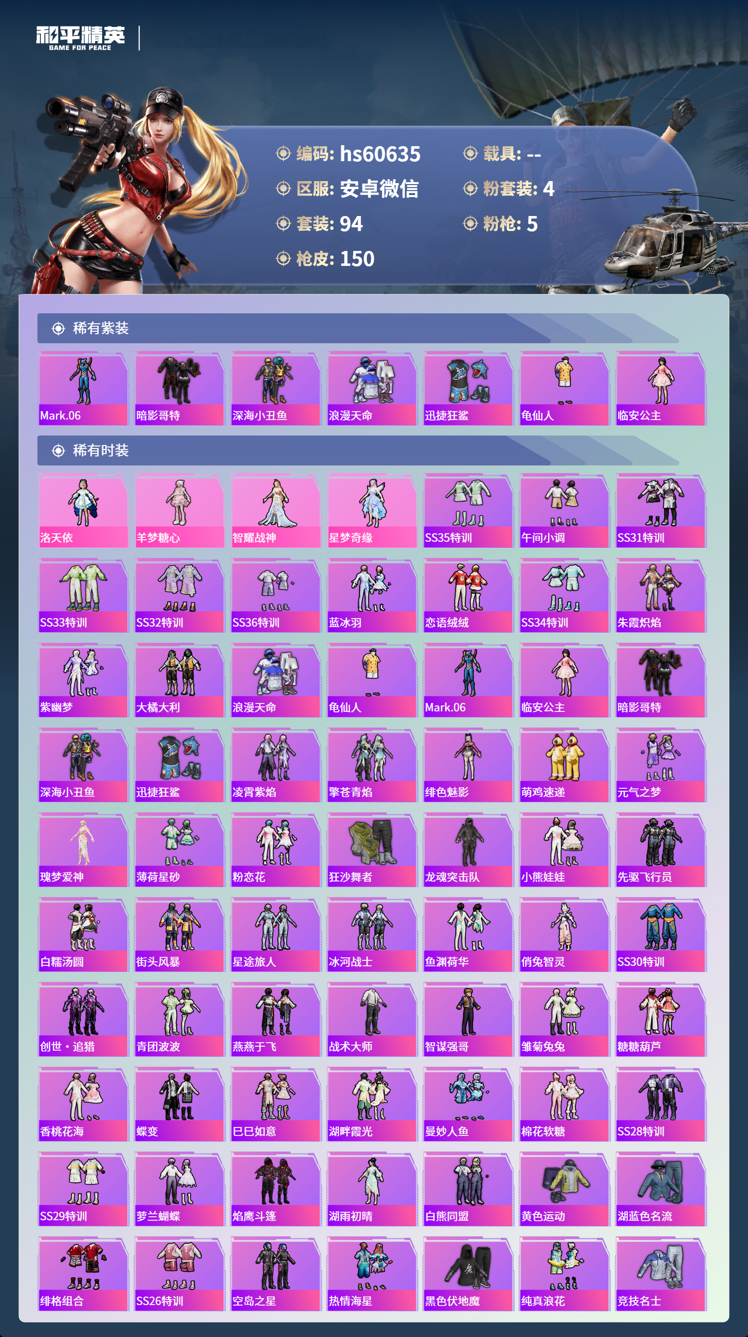 0载具-94套装-150呛皮-hs60635 安卓微信-8王牌印记-4粉装-5特效呛-44197热力值-94套装-150呛皮-6卓越印记-3传奇印记【4粉装】角色-羊梦糖心角色-智耀战神角色-洛天依角色-星梦奇缘【5特效呛】amr-智耀战神/7级dp-28-豹影疾电/5级groza-镜光银凌/5级m762-青锋波束/5级kar98k-巳巳如意/5级【7稀有紫装】mark.06暗影哥特深海小丑鱼浪漫天命