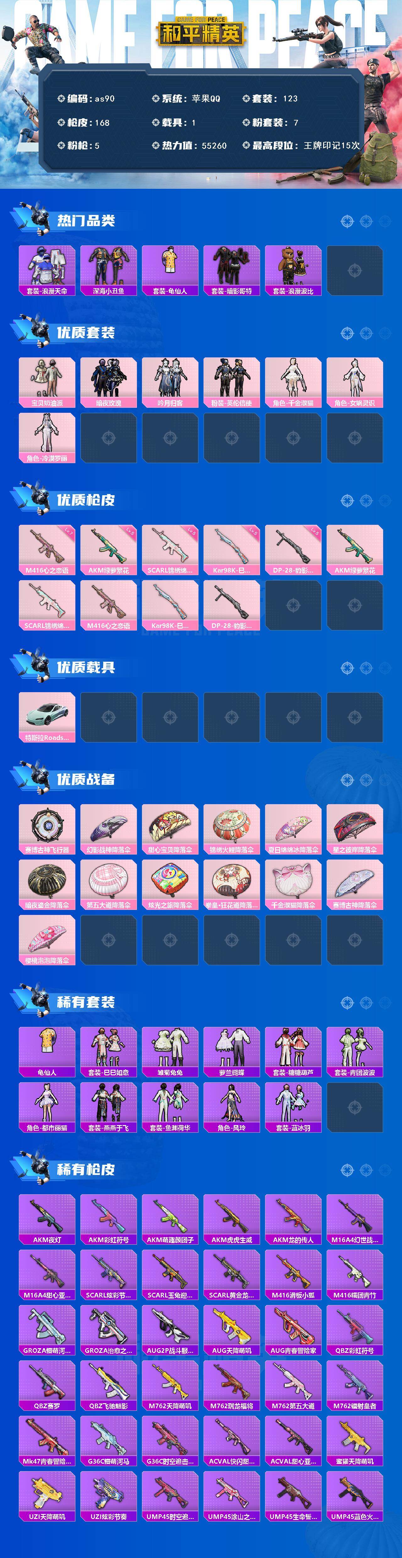 1载具-123套装-168呛皮-苹果 手q-7粉装-5特效呛-1载具-1粉色飞行器-55260热力值-15王牌印记-123套装-168呛皮 【热门品类】:套装-浪漫天命,套装-深海小丑鱼,套装-龟仙人,套装-暗影哥特,套装-浪漫波比 【粉色套装】:粉装-宝贝奶油派,粉装-暗夜玫瑰,粉装-吟月归客,粉装-英伦信使,角色-千金淑猫,角