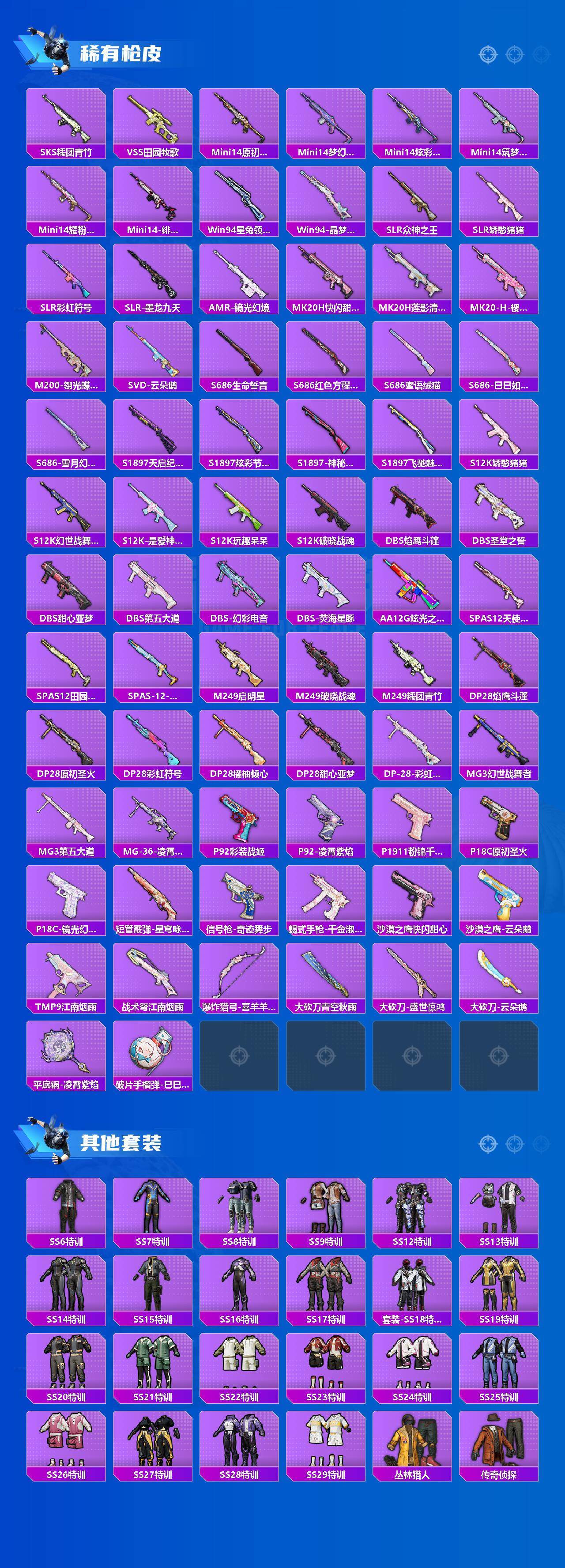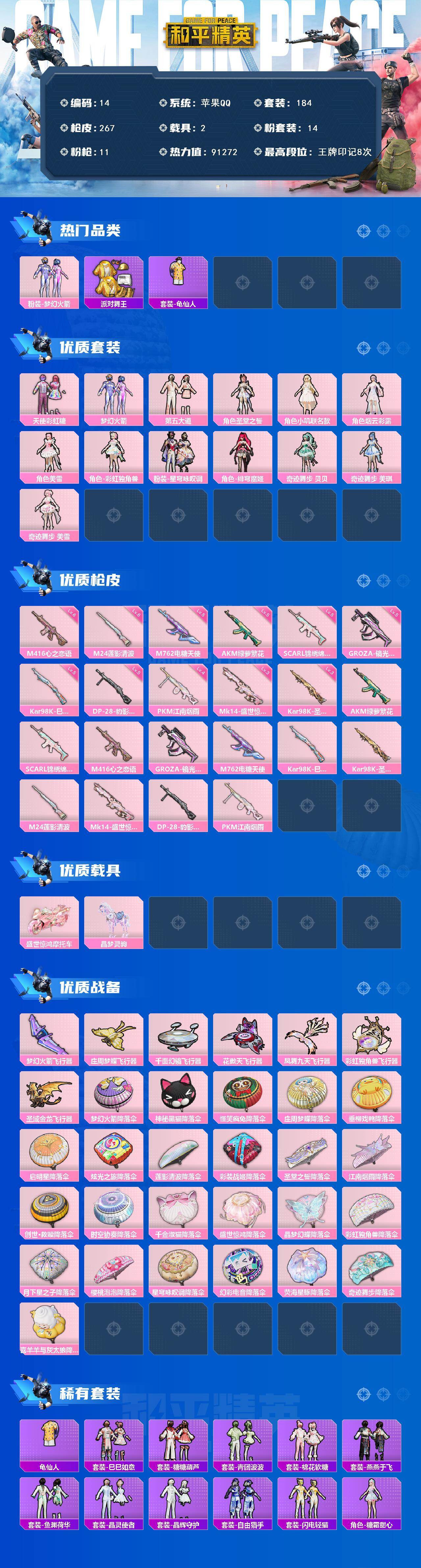 苹果 手q-14粉装-11特效呛-2载具-9粉色飞行器-91272热力值-8王牌印记-184套装-267呛皮 【热门品类】:粉装-梦幻火箭,套装-派对舞王,套装-龟仙人 【粉色套装】:粉装-天使彩虹糖,粉装-梦幻火箭,粉装-第五大道,角色-圣堂之誓,角色-小叽联名款,角色-烟云彩露,角色-美雪,角色-彩虹独角兽,粉装-星穹咏叹调,角色-绯穹魔姬,角色-奇迹舞步 贝贝,角色-奇迹舞步 美琪,角色-奇迹舞步 美雪 【粉色呛皮等级】:akm-绿萝繁花五级,scar-l-锦绣绵绵五级,m416-心之恋语六级,groza-镜光银凌五级,m762-电糖天使五级,kar98k-巳巳如意五级,kar98k-圣域龙灵三级,m24-莲影清波六级,mk14-盛世惊鸿三级,dp-28-豹影疾电五级,pkm-江南烟雨四级 【粉色载具】:盛世惊鸿摩托车,晶梦灵驹 【粉色呛皮】:akm-绿萝繁花,scar-l-锦绣绵绵,m416-心之恋语,groza-镜光银凌,m762-电糖天使,kar98k-巳巳如意,kar98k-圣域龙灵,m24-莲影清波,mk14-盛世惊鸿,dp-28-豹影疾电,pkm-江南烟雨 【粉色飞行器】:梦幻火箭飞行器,庄周梦蝶飞行器,千面幻镜飞行器,花傲天飞行器,凤舞九天飞行器,彩虹独角兽飞行器,圣域金龙飞行器 【粉色降落伞】:梦幻火箭降落伞,神秘黑猫降落伞,怪笑疯兔降落伞,庄周梦蝶降落伞,垂柳戏鸭降落伞,启明星降落伞,炫光之旅降落伞,莲影清波降落伞,彩装战姬降落伞,圣堂之誓降落伞,江南烟雨降落伞,创世·救赎降落伞,时空协奏降落伞,千金淑猫降落伞,盛世惊鸿降落伞,晶梦幻蝶降落伞,彩虹独角兽降落伞,月下星之子降落伞,樱桃泡泡降落伞,星穹咏叹调降落伞,幻彩电音降落伞,荧海星豚降落伞,奇迹舞步降落伞,喜羊羊与灰太狼降落伞,炫彩糖果降落伞 【稀有套装】:套装-龟仙人,套装-巳巳如意,套装-炫彩糖果,套装-糖糖葫芦,套装-青团波波,套装-棉花软糖,套装-燕燕于飞,套装-鱼渊荷华,套装-晶灵使者,套装-晶辉守护,套装-自由猎手,套装-闪电轻猫,角色-糖霜甜心,套装-粉恋花,套装-紫幽梦,套装-蓝冰羽,角色-猎影月神,套装-霓虹热舞,套装-云朵鹅,套装-雪绒豹,套装-蜜露汐语,套装-蓝海鲸歌,套装-朱霞炽焰,套装-凌霄紫焰,玩偶服-懒羊羊,角色-霜刃之御 【稀有呛皮】:akm-pel轰鸣竞梦者,akm-夜灯,akm-彩虹符号,akm-江南烟雨,akm-灼热熔岩,akm-破晓战魂,akm-萌趣颜团子,akm-虎虎生威,akm-霓虹街区,m16a4-夜灯,m16a4-天使羽翼,m16a4-幻世战舞者,m16a4-甜心亚梦,m16a4-莲影清波,m16a4-千金淑猫,scar-l-炫彩节奏,scar-l-玉兔迎春,scar-l-红色方程式,m416-夜灯,m416-糯团青竹,m416-紫翼圣骑,m416-红色方程式,m416-绯红前夜,m416-蓝色火焰,groza-彩虹符号,groza-恐龙拽拽,groza-田园牧歌,groza-晶梦幻蝶,aug-耀粉歌者,aug-魔法学院,q-原初圣火,q-彩虹符号,q-神秘黑猫,q-飞驰魅影,m762-天降萌叽,m762-彩虹符号,m762-牛气冲天,m762-第五大道,m762-绯红前夜,m762-云朵鹅,ac-val-天降萌叽,ac-val-快闪甜心,ac-val-甜心亚梦,蜜獾-天降萌叽,蜜獾-娇憨猪猪,arx-凌霄紫焰,uzi-众神之王,uzi-啾咪啾咪,uzi-娇憨猪猪,uzi-炫彩节奏,uzi-红色方程式,uzi-盛世惊鸿,ump45-夜灯,ump45-时空追击者,ump45-猪猪侠,ump45-蓝色火焰,vect-焰鹰斗篷,vect-彩虹符号,vect-生命誓言,vect-田园牧歌,汤姆逊-天降萌叽,汤姆逊-炫彩节奏,汤姆逊-耀粉歌者,汤姆逊-樱桃泡泡,mp5k-众神之王,js9-凌霄紫焰,p90-快闪甜心,p90-飞驰魅影,p90-金蛇镇世,p90-巳巳如意,kar98k-彩虹符号,kar98k-梦幻火箭,kar98k-炫彩节奏,kar98k-王子的夏天,kar98k-红色方程式,kar98k-飞驰魅影,m24-众神之王,m24-樱桃泡泡,awm-焰鹰斗篷,awm-圣堂之誓,awm-恐龙拽拽,awm-奇迹舞步,awm-盛世惊鸿,sks-炫彩节奏,sks-糯团青竹,vss-田园牧歌,mini14-原初圣火,mini14-梦幻火箭,mini14-炫彩节奏,mini14-筑梦精灵,mini14-耀粉歌者,mini14-绯穹魔姬,win94-星兔领航员,win94-晶梦幻蝶,slr-众神之王,slr-娇憨猪猪,slr-彩虹符号,slr-墨龙九天,amr-镜光幻境,mk20-h-快闪甜心,mk20-h-莲影清波,mk20-h-樱桃泡泡,m200-翎光蝶翼,svd-云朵鹅,s686-蜜语绒猫,s686-生命誓言,s686-红色方程式,s686-雪月幻音,s686-巳巳如意,s1897-天启纪元,s1897-炫彩节奏,s1897-神秘黑猫,s1897-飞驰魅影,s12k-玩趣呆呆,s12k-破晓战魂,s12k-娇憨猪猪,s12k-幻世战舞者,s12k-是爱神辣,dbs-焰鹰斗篷,dbs-圣堂之誓,dbs-甜心亚梦,dbs-第五大道,dbs-荧海星豚,dbs-幻彩电音,aa12-g-炫光之旅,spas-12-天使羽翼,spas-12-田园牧歌,spas-12-云朵鹅,m249-启明星,m249-破晓战魂,m249-糯团青竹,dp-28-焰鹰斗篷,dp-28-原初圣火,dp-28-彩虹符号,dp-28-橘柚倾心,dp-28-甜心亚梦,dp-28-彩虹独角兽,mg3-幻世战舞者,mg3-第五大道,mg-36-凌霄紫焰,p92-彩装战姬,p92-凌霄紫焰,p1911-粉锦千层,p18c-原初圣火,p18c-镜光幻境,短管霰弹-星穹咏叹调,信号呛-奇迹舞步,蝎式手呛-千金淑猫,沙墨之鹦-快闪甜心,沙墨之鹦-云朵鹅,tmp-9-江南烟雨,战术弩-江南烟雨,爆炸猎弓-喜羊羊与灰太狼,大砍刀-青空秋雨,大砍刀-云朵鹅,大砍刀-盛世惊鸿,平底锅-凌霄紫焰,破片手留单-巳巳如意 【其他套装】:套装-ss6特训,套装-ss7特训,套装-ss8特训,套装-ss9特训,套装-ss12特训,套装-ss13特训,套装-ss14特训,套装-ss15特训,套装-ss16特训,套装-ss17特训,套装-ss18特训,套装-ss19特训,套装-ss20特训,套装-ss21特训,套装-ss22特训,套装-ss23特训,套装-ss24特训,套装-ss25特训,套装-ss26特训,套装-ss27特训,套装-ss28特训,套装-ss29特训,套装-丛林猎人,套装-传奇侦探,套装-光之冒险,套装-冷焰舞者,套装-北国孤狼,套装-吉莉礼服,套装-夏日音浪,套装-幻世战舞者,套装-幻影武者,套装-怒火燎原,套装-探宝勇士,套装-旭日情侣,