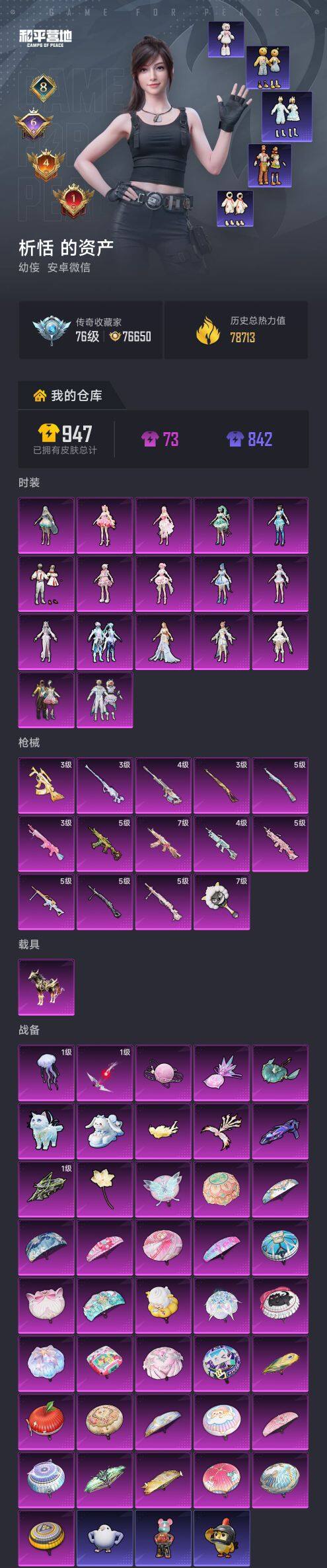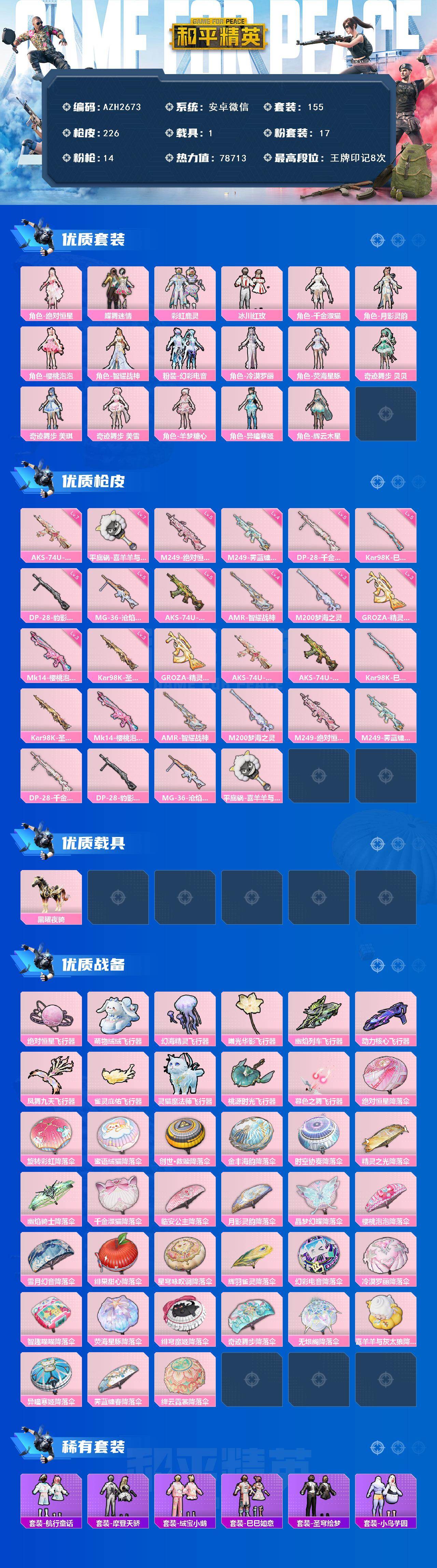 1载具-155套装-226呛皮-安卓 微信【千金淑猫千金淑猫荧海星豚羊梦糖心 奇迹舞步 贝贝美琪美雪 满级星穹咏叹调aks-74u 满级平底锅-喜羊羊与灰太狼 1载具】17粉装-14特效呛-1载具-12粉色飞行器-78713热力值-8王牌印记-155套装-226呛皮 【粉色套装】:角色-绝对恒星,粉装-蝶舞迷情,粉装-彩虹鹿灵,粉装-冰川红玫,角色-千金淑猫,角色-月影灵韵,角色-樱桃泡泡,角色-智耀战神,粉装-幻彩电音,角