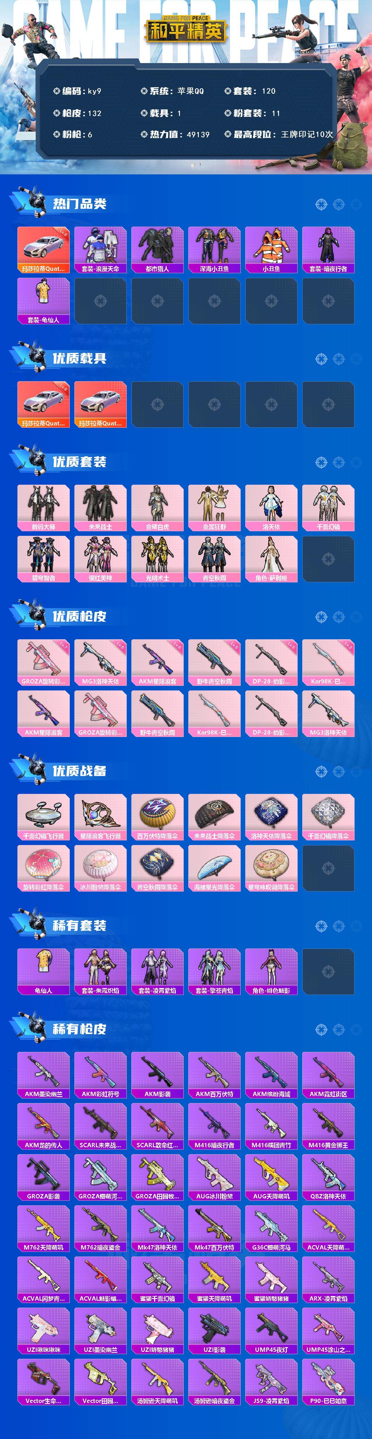 苹果 手q-11粉装-6特效呛-1载具-2粉色飞行器-49139热力值-10王牌印记-120套装-132呛皮 【红色载具】:玛莎拉蒂quattropte(幻星粉)六级 【热门品类】:套装-浪漫天命,套装-都市猎人,套装-深海小丑鱼,套装-小丑鱼,套装-暗夜行者,套装-龟仙人 【粉色套装】:粉装-数码大师,粉装-未来战士,粉装-金曜白虎,粉装-金属狂野,角色-洛天依,粉装-千面幻镜,粉装