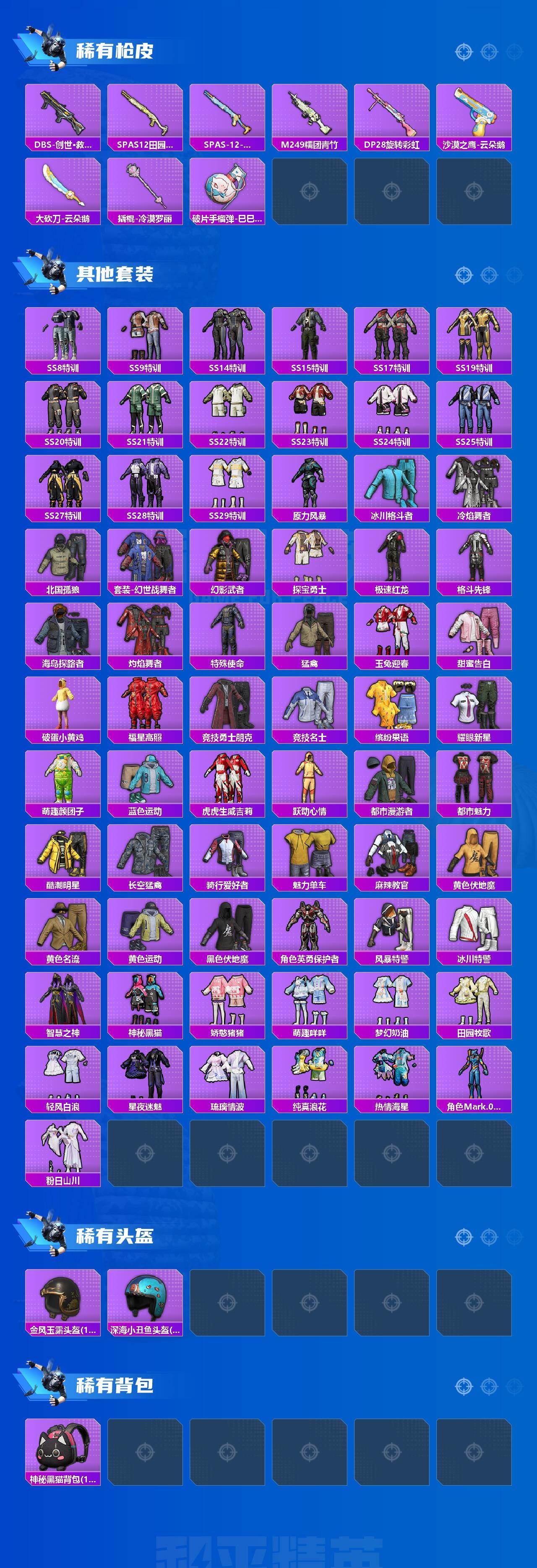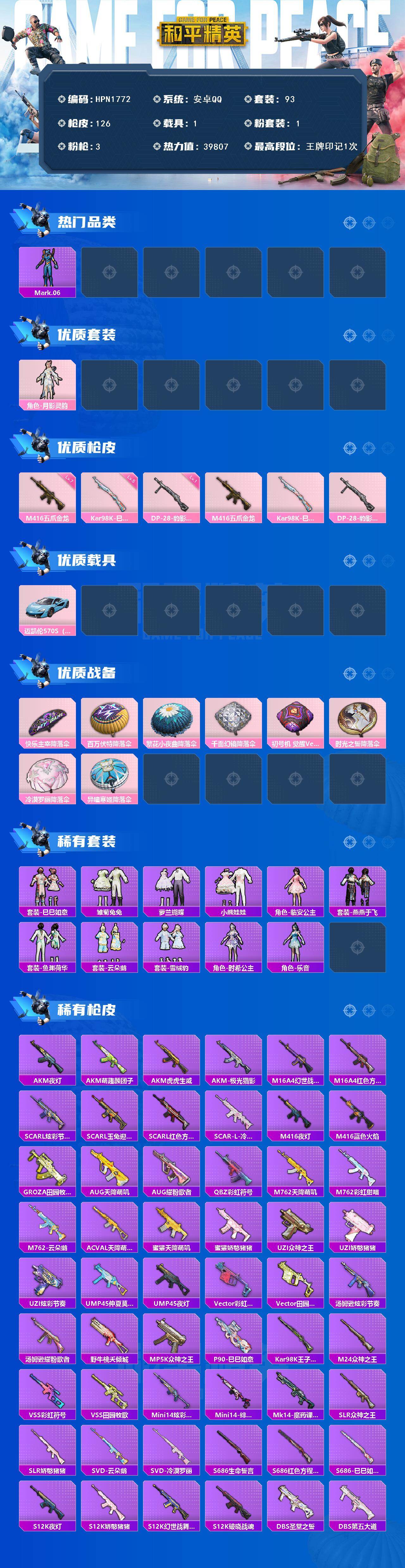【hpn1772】93套装/呛械3/装备156/载具1/战备86/王牌印记1/热力值39807/七级m416-五爪金龙/五级kar98k-巳巳如意/一级dp-28-豹影疾电/角色-mark.06/角色-月影灵韵/迈凯伦570s(天际蓝)/m416-五爪金龙/kar98k-巳巳如意/dp-28-豹影疾电/快乐主宰降落伞/百万伏特降落伞/繁花小夜曲降落伞/千面幻镜降落伞/初号机 觉醒ver.降落伞/时光之誓降落伞/冷漠罗丽降落伞/异瞳寒姬降落伞/套装-巳巳如意/套装-雏菊兔兔/套装-萝兰蝴蝶/套装-小熊娃娃/角色-临安公主/套装-燕燕于飞/套装-鱼渊荷华/套装-云朵鹅/套装-雪绒豹/角色-时希公主/角色-乐音/akm-夜灯/akm-萌趣颜团子/akm-虎虎生威/akm-极光猎影/m16a4-幻世战舞者/m16a4-红色方程式/scar-l-炫彩节奏/scar-l-玉兔迎春/scar-l-红色方程式/scar-l-冷漠罗丽/m416-夜灯/m416-蓝色火焰/groza-田园牧歌/aug-天降萌叽/aug-耀粉歌者/q-彩虹符号/m762-天降萌叽/m762-彩虹甜喵/m762-云朵鹅/ac-val-天降萌叽/蜜獾-天降萌叽/蜜獾-娇憨猪猪/uzi-众神之王/uzi-娇憨猪猪/uzi-炫彩节奏/ump45-仲夏莫吉托/ump45-夜灯/vect-彩虹符号/vect-田园牧歌/汤姆逊-炫彩节奏/汤姆逊-耀粉歌者/野牛-桃夭倾城/mp5k-众神之王/p90-巳巳如意/kar98k-王子的夏天/m24-众神之王/vss-彩虹符号/vss-田园牧歌/mini14-炫彩节奏/mini14-绯穹魔姬/mk14-魔药课室/slr-众神之王/slr-娇憨猪猪/svd-云朵鹅/svd-冷漠罗丽/s686-生命誓言/s686-红色方程式/s686-巳巳如意/s12k-破晓战魂/s12k-夜灯/s12k-娇憨猪猪/s12k-幻世战舞者/dbs-圣堂之誓/dbs-第五大道/dbs-创世·救赎/spas-12-田园牧歌/spas-12-云朵鹅/m249-糯团青竹/dp-28-旋转彩虹/沙墨之鹦-云朵鹅/大砍刀-云朵鹅/撬棍-冷漠罗丽/破片手留单-巳巳如意/套装-ss8特训/套装-ss9特训/套装-ss14特训/套装-ss15特训/套装-ss17特训/套装-ss19特训/套装-ss20特训/套装-ss21特训/套装-ss22特训/套装-ss23特训/套装-ss24特训/套装-ss25特训/套装-ss27特训/套装-ss28特训/套装-ss29特训/套装-原力风暴/套装-冰川格斗者/套装-冷焰舞者/套装-北国孤狼/套装-幻世战舞者/套装-幻影武者/套装-探宝勇士/套装-极速红龙/套装-格斗先锋/套装-海岛探路者/套装-灼焰舞者/套装-特殊使命/套装-猛禽/套装-玉兔迎春/套装-甜蜜告白/套装-破蛋小黄鸡/套装-福星高照/套装-竞技勇士朋克/套装-竞技名士/套装-缤纷果语/套装-耀眼新星/套装-萌趣颜团子/套装-蓝色运动/套装-虎虎生威吉莉/套装-跃动心情/套装-都市漫游者/套装-都市魅力/套装-酷潮明星/套装-长空猛禽/套装-骑行爱好者/套装-魅力单车/套装-麻辣教官/套装-黄色伏地魔/套装-黄色名流/套装-黄色运动/套装-黑色伏地魔/角色-英勇保护者/套装-风暴特警/套装-冰川特警/套装-智慧之神/套装-神秘黑猫/套装-娇憨猪猪/套装-萌趣咩咩/套装-梦幻奶油/套装-田园牧歌/套装-轻风白浪/套装-星夜迷魅/套装-琉璃情波/套装-纯真浪花/套装-热情海星/套装-粉日山川/金风玉露头盔1级/深海小丑鱼头盔1级/神秘黑猫背包1级