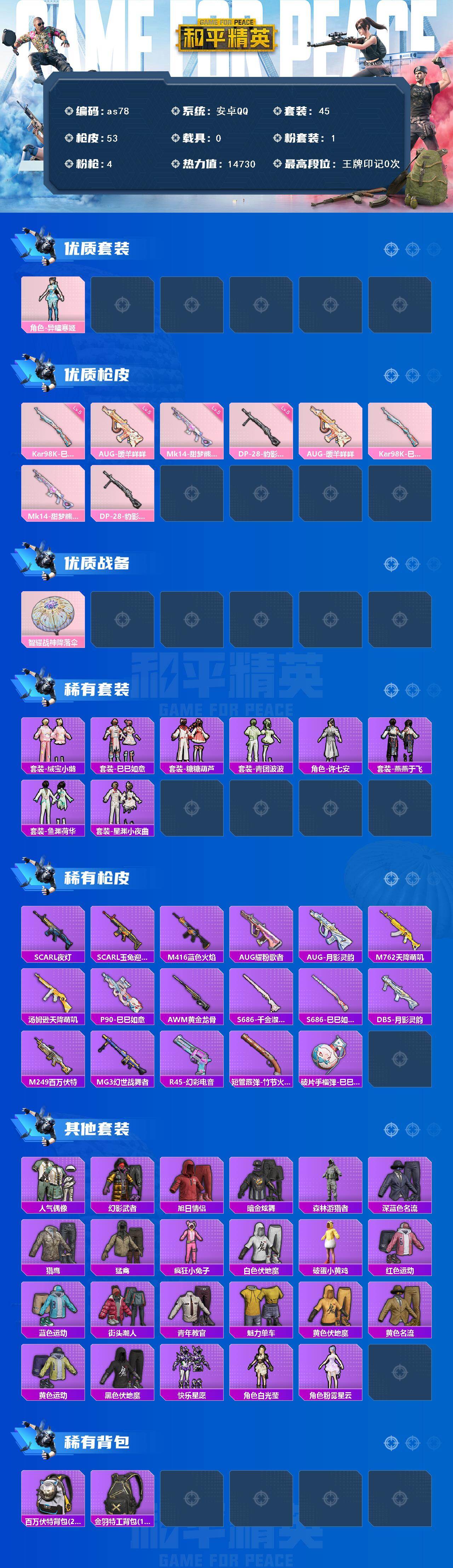 [16559113]安卓 手q-1粉装-4特效呛-0载具-0粉色飞行器-14730热力值-1王牌印记-45套装-53呛皮 【粉色套装】:角色-异瞳寒姬 【粉色呛皮等级】:aug-暖羊咩咩五级,kar98k-巳巳如意五级,mk14-甜梦熊击五级,dp-28-豹影疾电五级 【粉色呛皮】:aug-暖羊咩咩,kar98k-巳巳如意,mk14-甜梦熊击,dp-28-豹影疾电 【粉色降落伞】:智耀战神降落伞 【稀有套装】:套装-绒宝小鹅,套装-巳巳如意,套装-糖糖葫芦,套装-青团波波,角色-许七安,套装-燕燕于飞,套装-鱼渊荷华,套装-星渊小夜曲 【稀有呛皮】:scar-l-夜灯,scar-l-玉兔迎春,m416-蓝色火焰,aug-耀粉歌者,aug-月影灵韵,m762-天降萌叽,汤姆逊-天降萌叽,p90-巳巳如意,awm-黄金龙骨,s686-巳巳如意,s686-千金淑猫,dbs-月影灵韵,m249-百万伏特,mg3-幻世战舞者,r45-幻彩电音,短管霰弹-竹节火铳,破片手留单-巳巳如意 【其他套装】:套装-人气偶像,套装-幻影武者,套装-旭日情侣,套装-暗金炫舞,套装-森林游猎者,套装-深蓝色名流,套装-猎鹰,套装-猛禽,套装-疯狂小兔子,套装-白色伏地魔,套装-破蛋小黄鸡,套装-红色运动,套装-蓝色运动,套装-街头潮人,套装-青年教官,套装-魅力单车,套装-黄色伏地魔,套装-黄色名流,套装-黄色运动,套装-黑色伏地魔,套装-快乐星愿,角色-白光莹,角色-粉雾星云 【稀有背包】:百万伏特背包2级,金羽特工背包1级 【营地id】:972823092