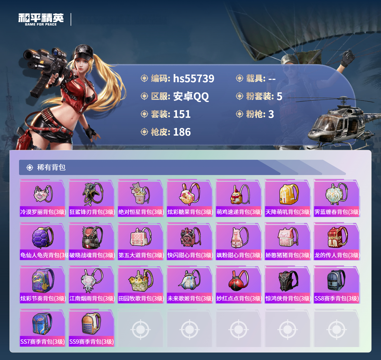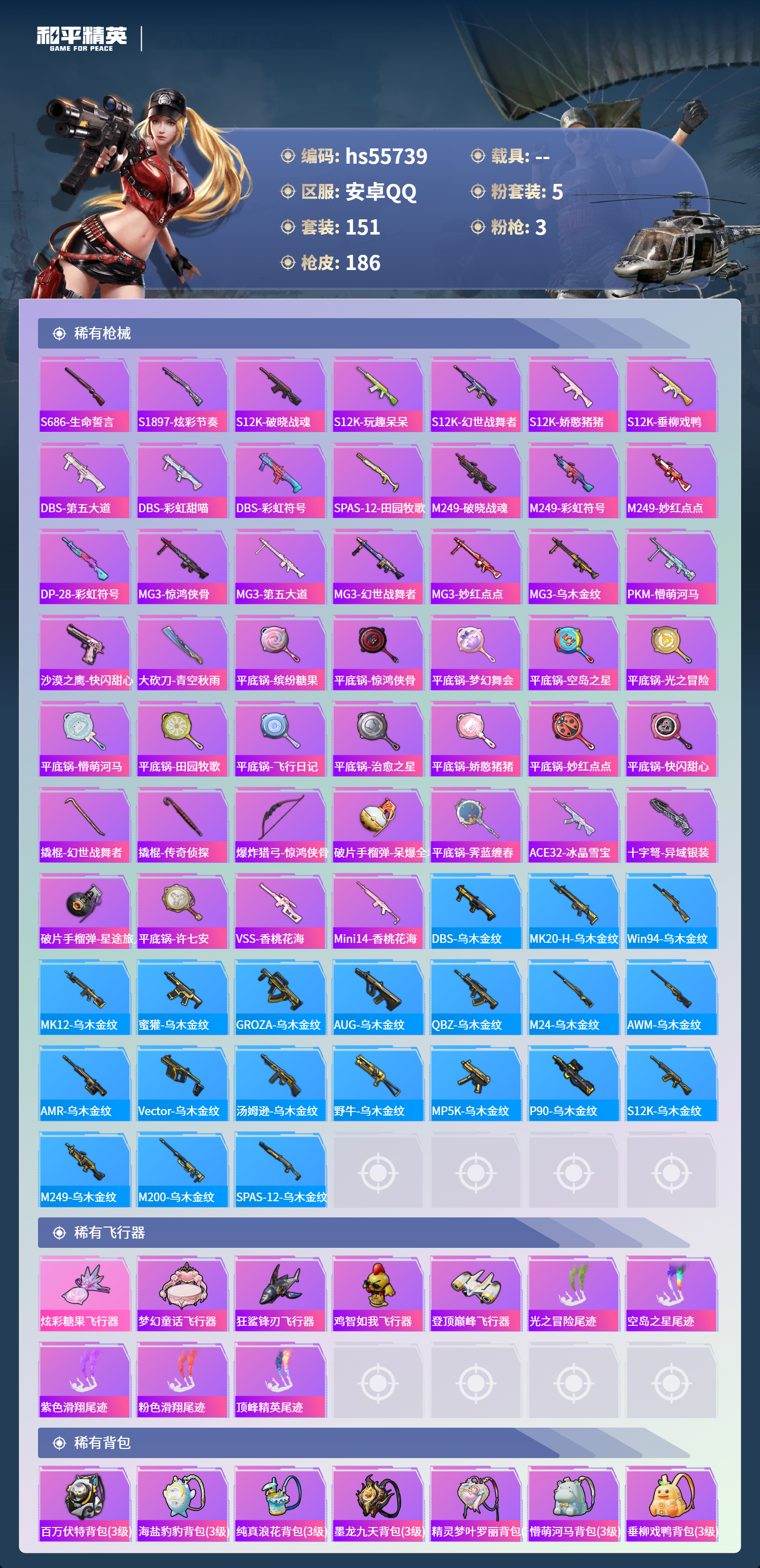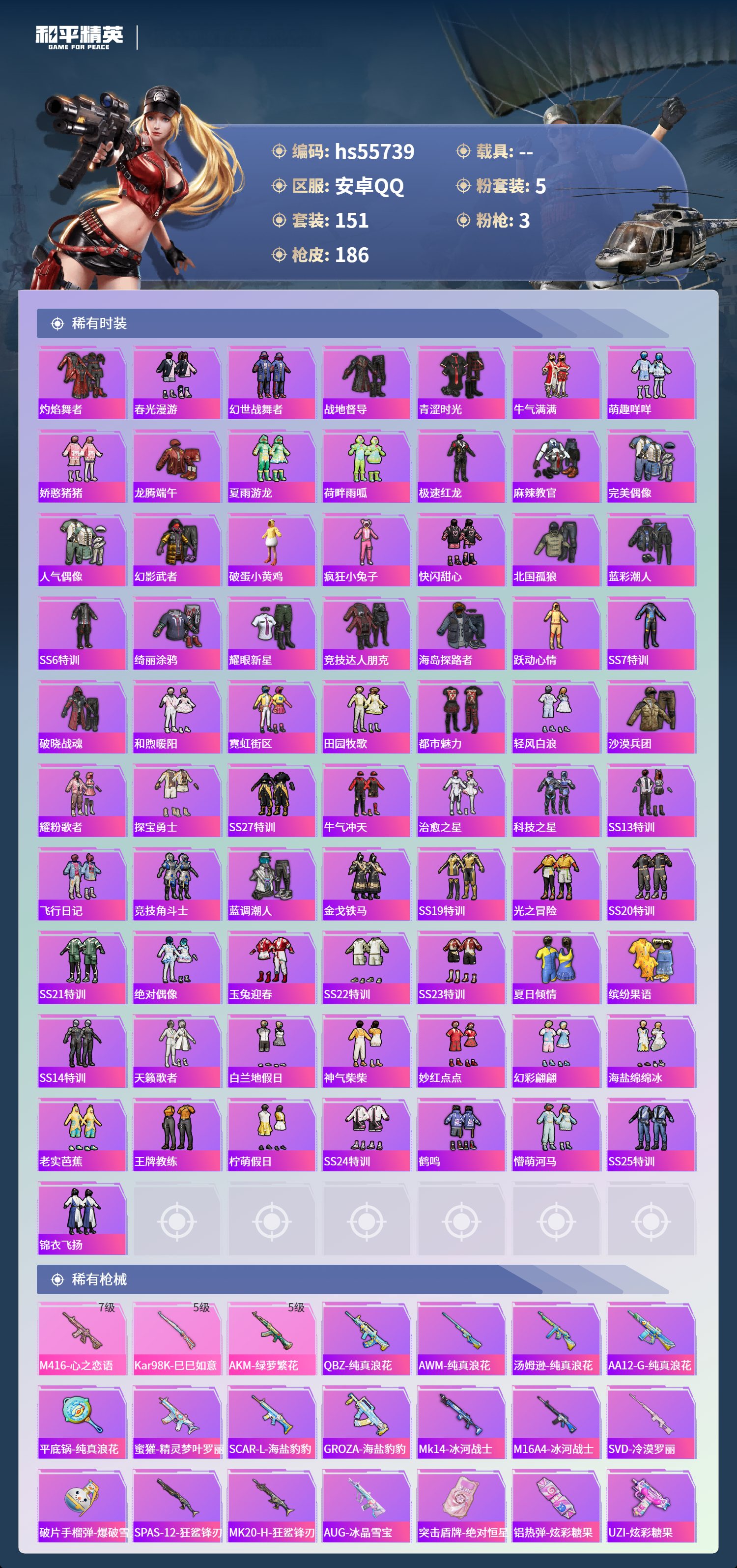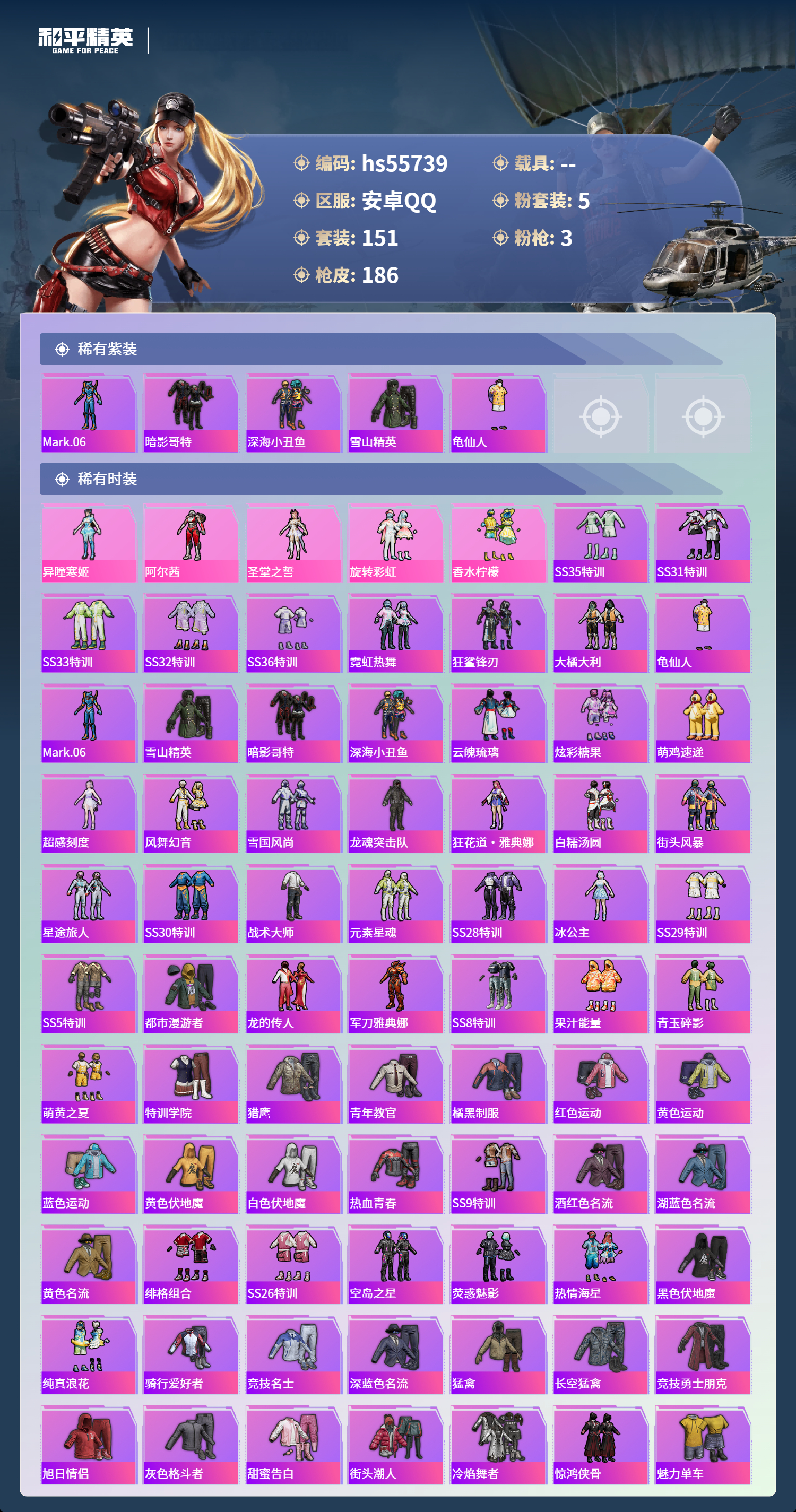 0载具-151套装-186呛皮-hs55739 安卓手q-10王牌印记-5粉装-3特效呛-58050热力值-151套装-186呛皮-1卓越印记【5粉装】套装-旋转彩虹套装-香水柠檬角色-异瞳寒姬角色-圣堂之誓角色-阿尔茜【3特效呛】m416-心之恋语/7级akm-绿萝繁花/5级kar98k-巳巳如意/5级【5稀有紫装】mark.06暗影哥特深海小丑鱼雪山精英龟仙人【148稀有时装】异瞳寒姬ss35特