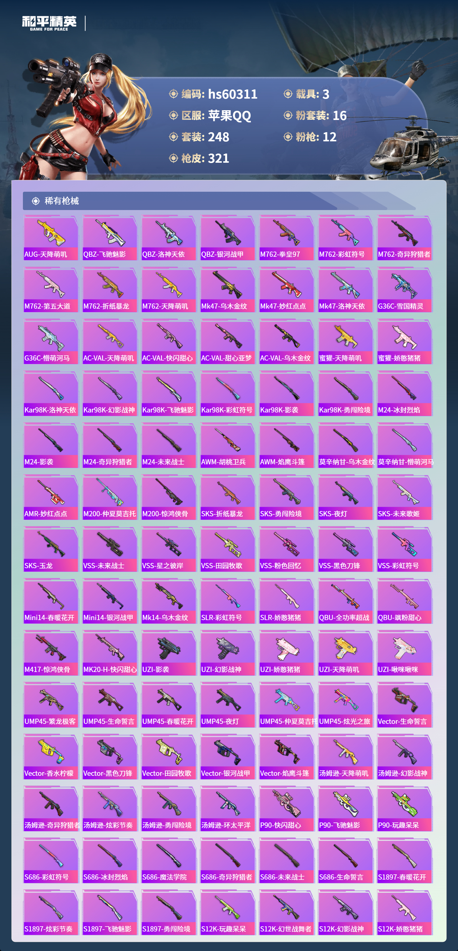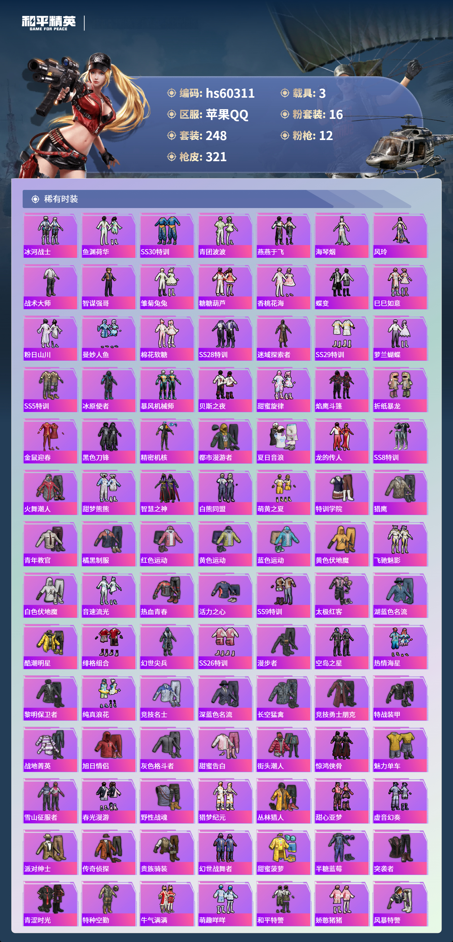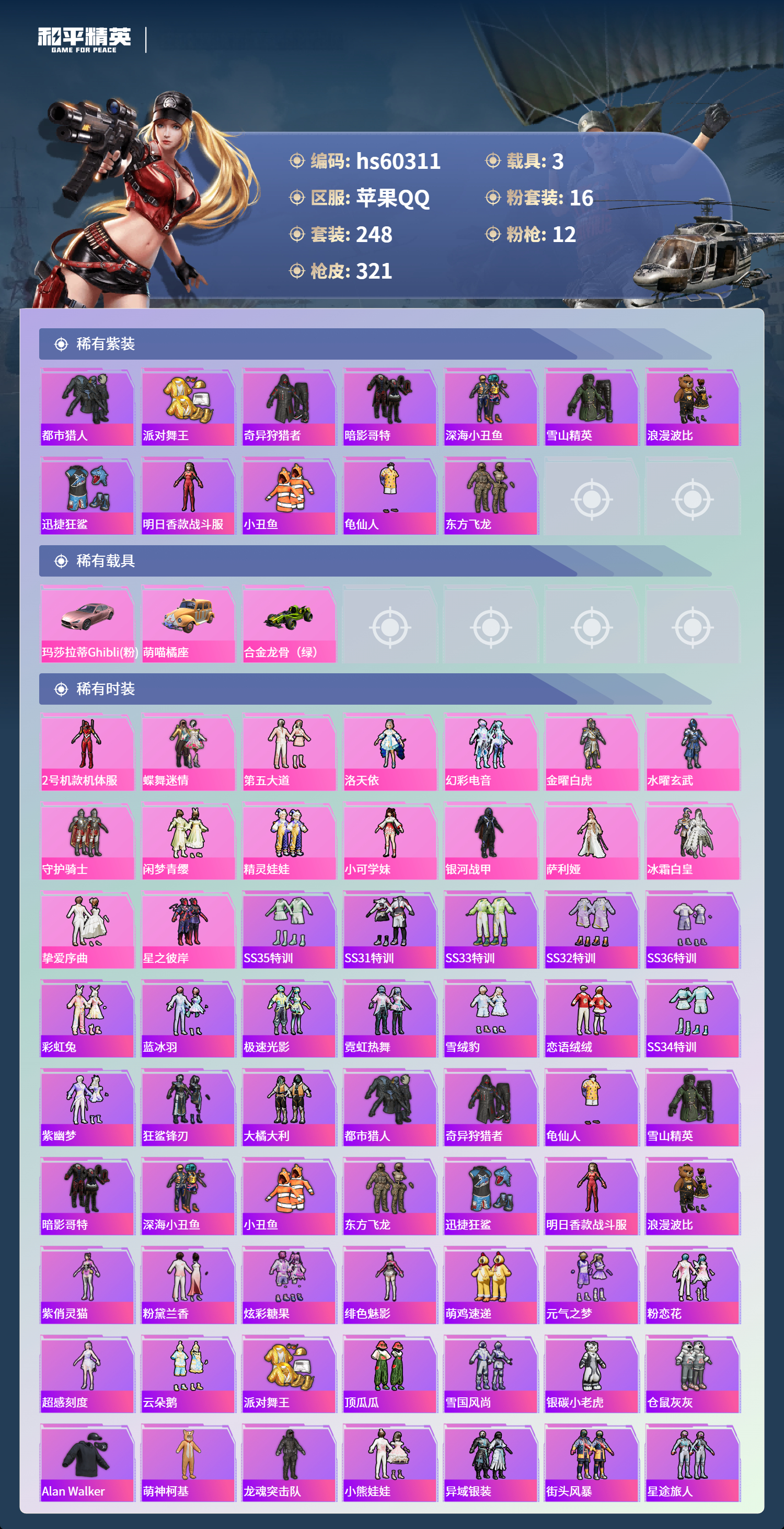 hs60311 苹果手q-16王牌印记-16粉装-12特效呛-3载具-热力值-248套装-321呛皮-6卓越印记-2传奇印记【16粉装】角色-小可学妹套装-挚爱序曲角色-洛天依套装-蝶舞迷情套装-水曜玄武角色-萨利娅套装-金曜白虎角色-2号机款机体服套装-幻彩电音套装-精灵娃娃套装-冰霜白皇套装-闲梦青缨套装-守护骑士套装-星之彼岸套装-银河战甲套装-第