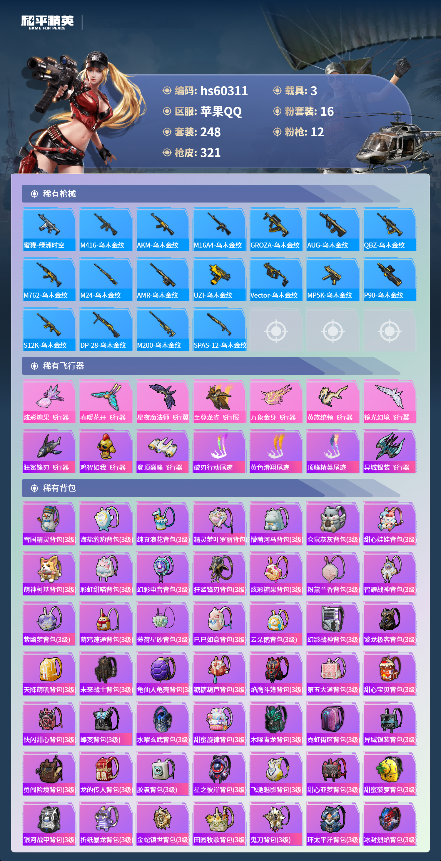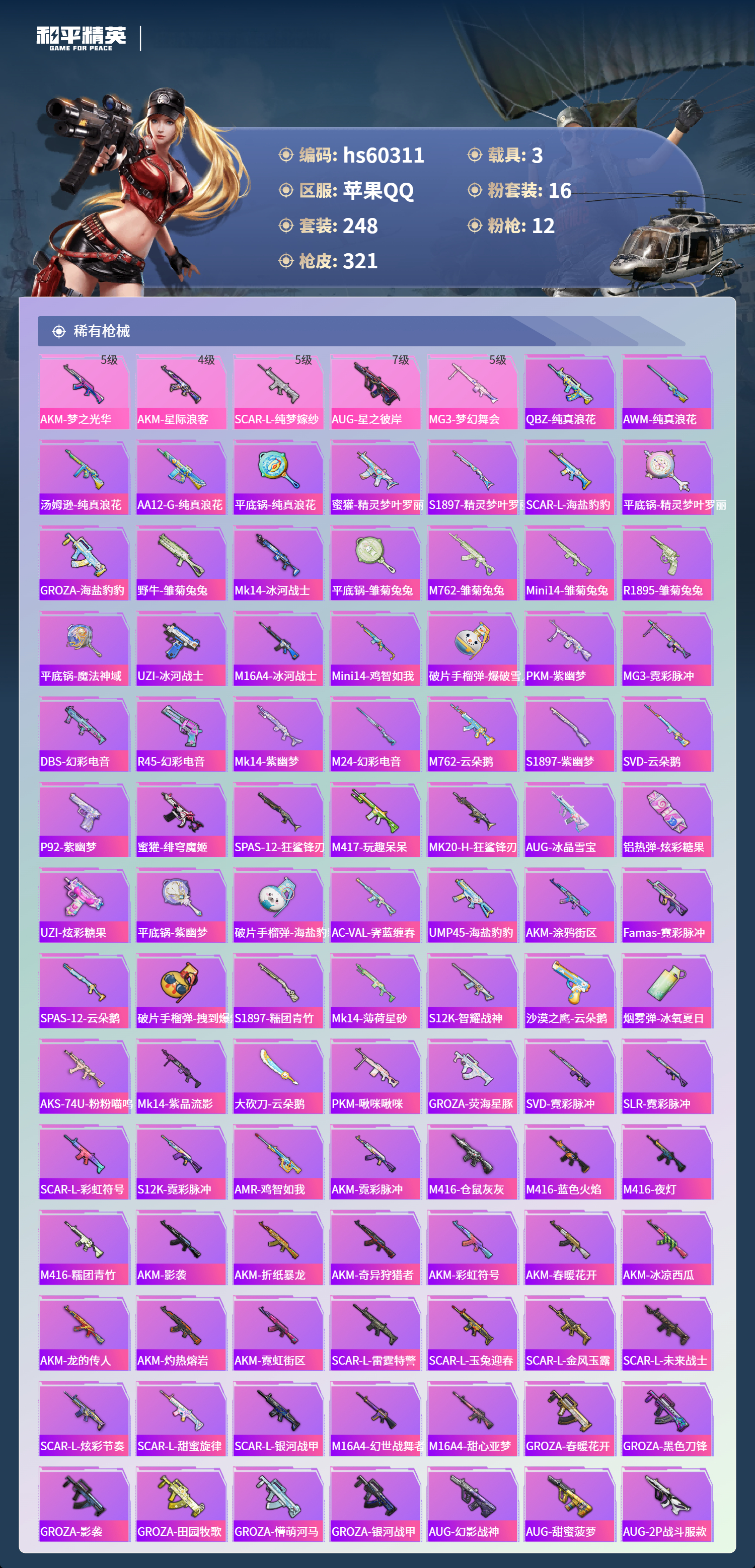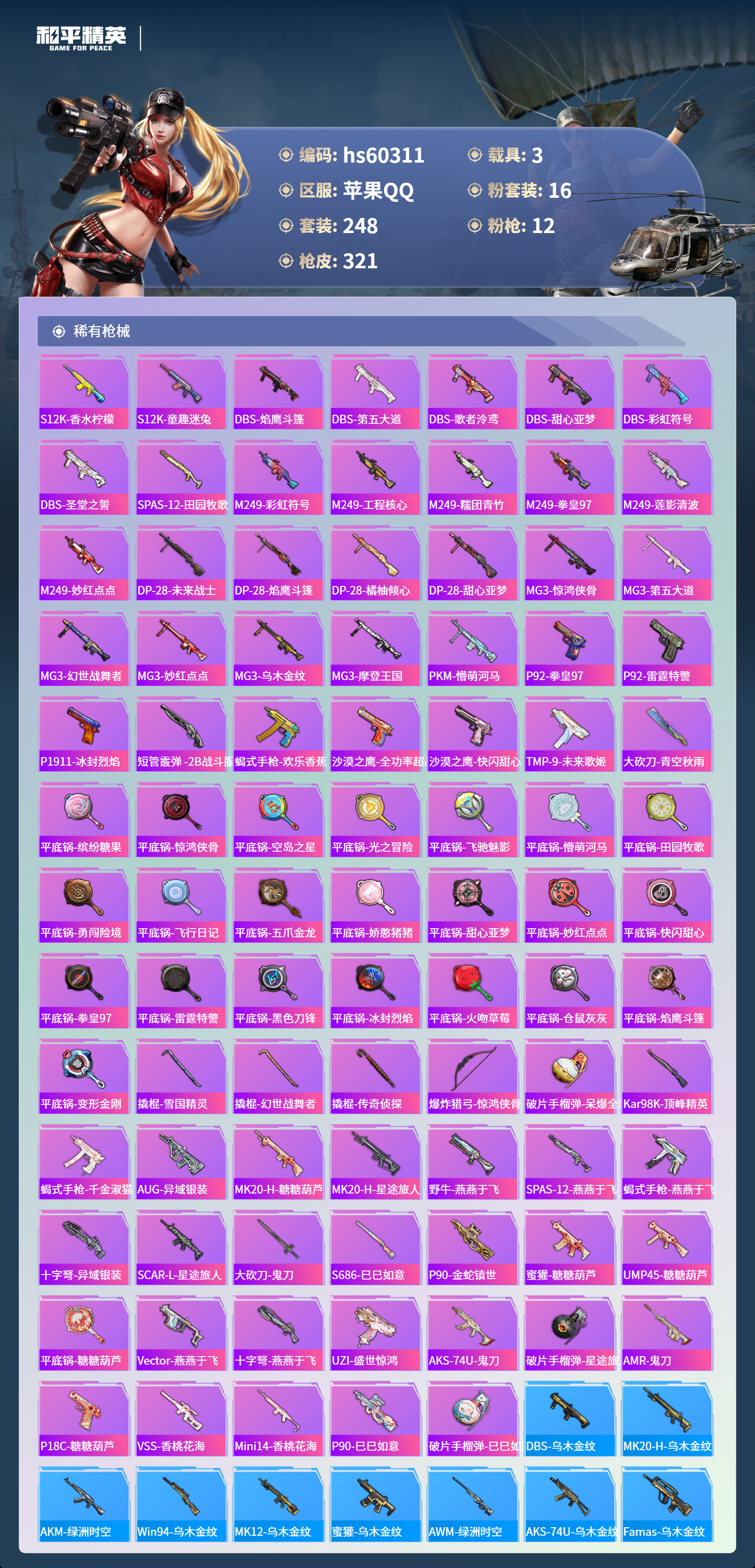 hs60311 苹果手q-16王牌印记-16粉装-12特效呛-3载具-热力值-248套装-321呛皮-6卓越印记-2传奇印记【16粉装】角色-小可学妹套装-挚爱序曲角色-洛天依套装-蝶舞迷情套装-水曜玄武角色-萨利娅套装-金曜白虎角色-2号机款机体服套装-幻彩电音套装-精灵娃娃套装-冰霜白皇套装-闲梦青缨套装-守护骑士套装-星之彼岸套装-银河战甲套装-第