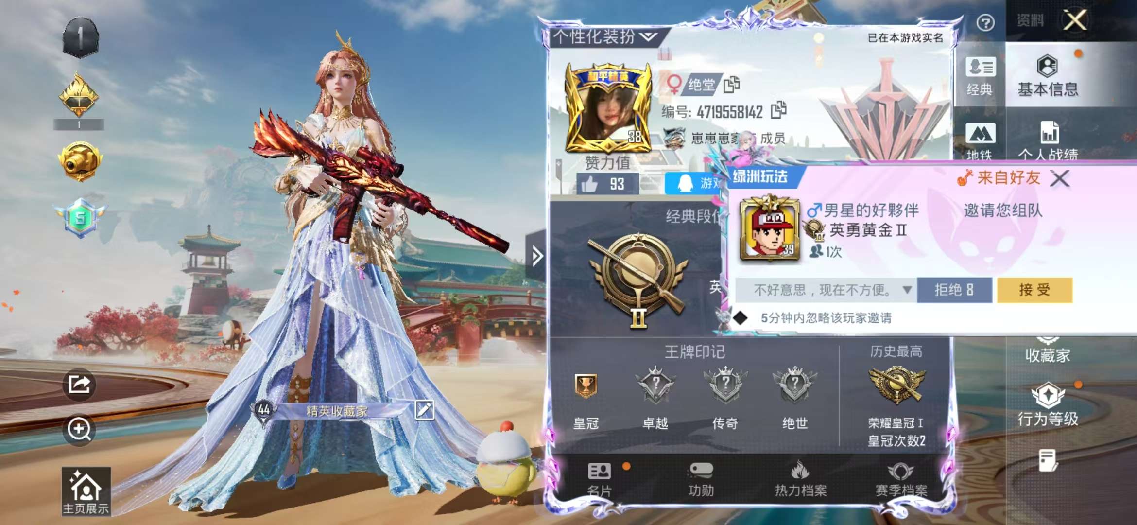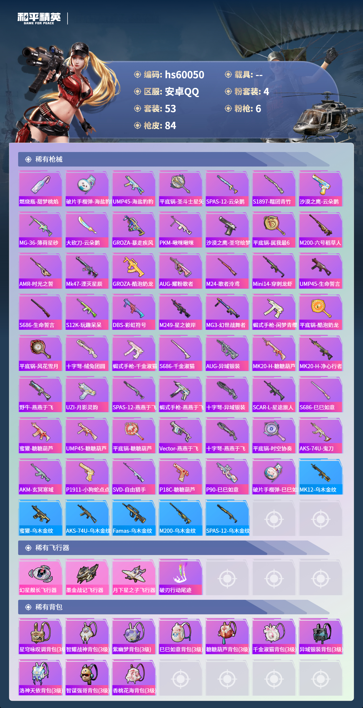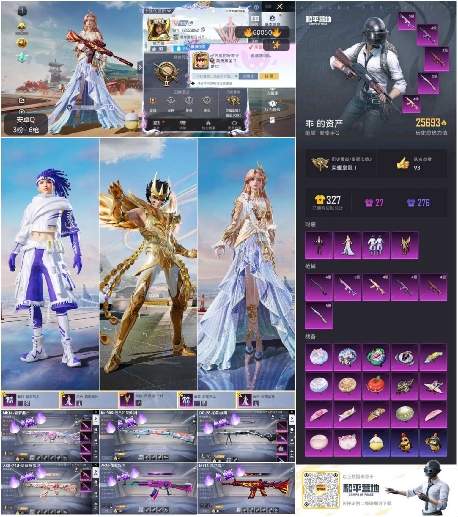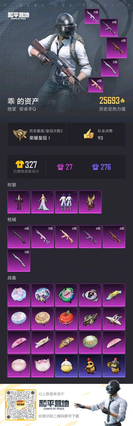 hs60050 安卓手q-0王牌印记-4粉装-6特效呛-25694热力值-53套装-84呛皮【4粉装】角色-智耀战神角色-凤凰座 一辉套装-新星烈龙角色-罪夜之冕【6特效呛】akm-炫紫旋律/4级m416-风花雪月/4级mk14-甜梦熊击/5级kar98k-巳巳如意/5级aks-74u-星穹咏叹调/4级dp-28-豹影疾电/4级【2稀有紫装】浪漫天命临安公主【53稀有时装