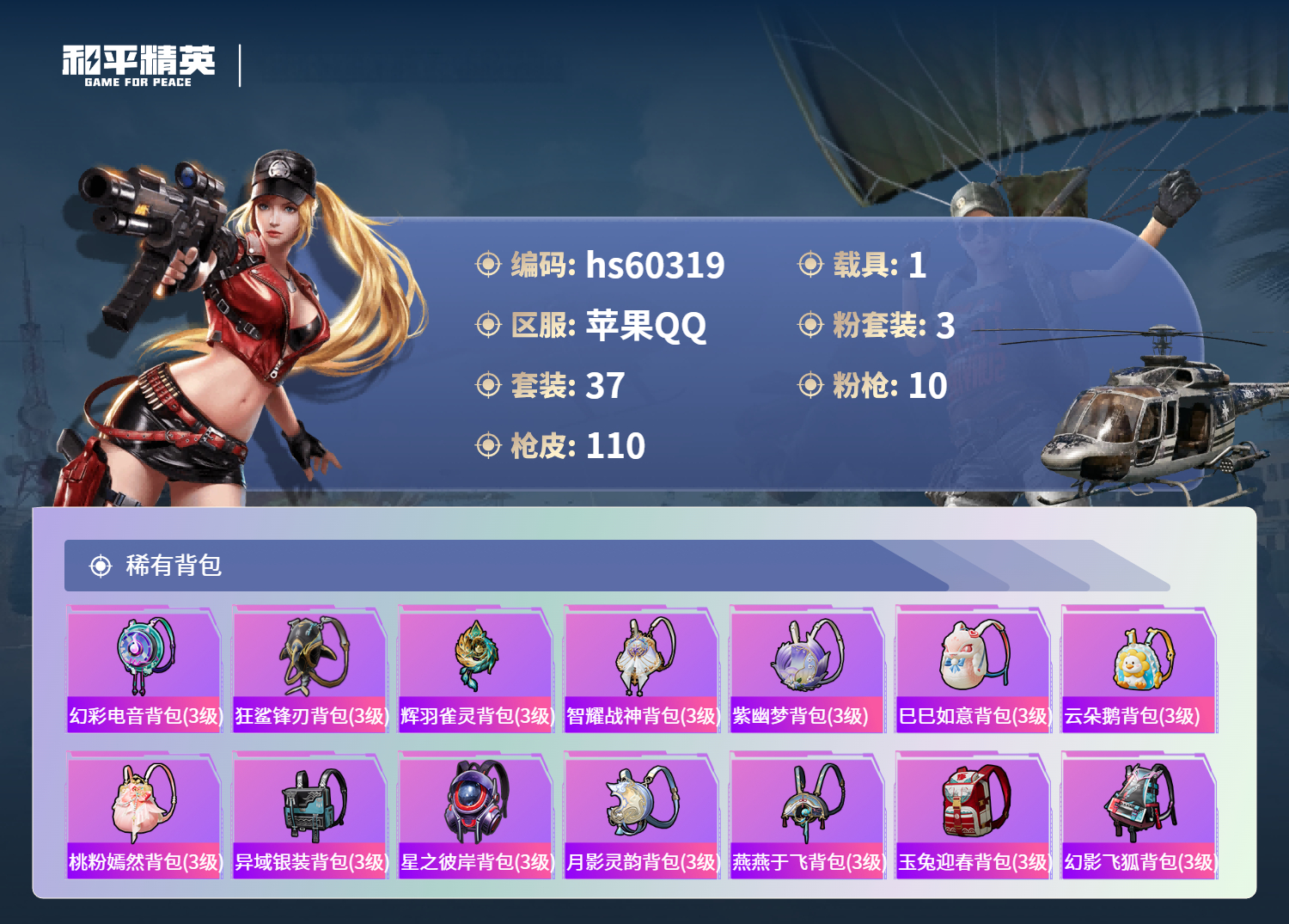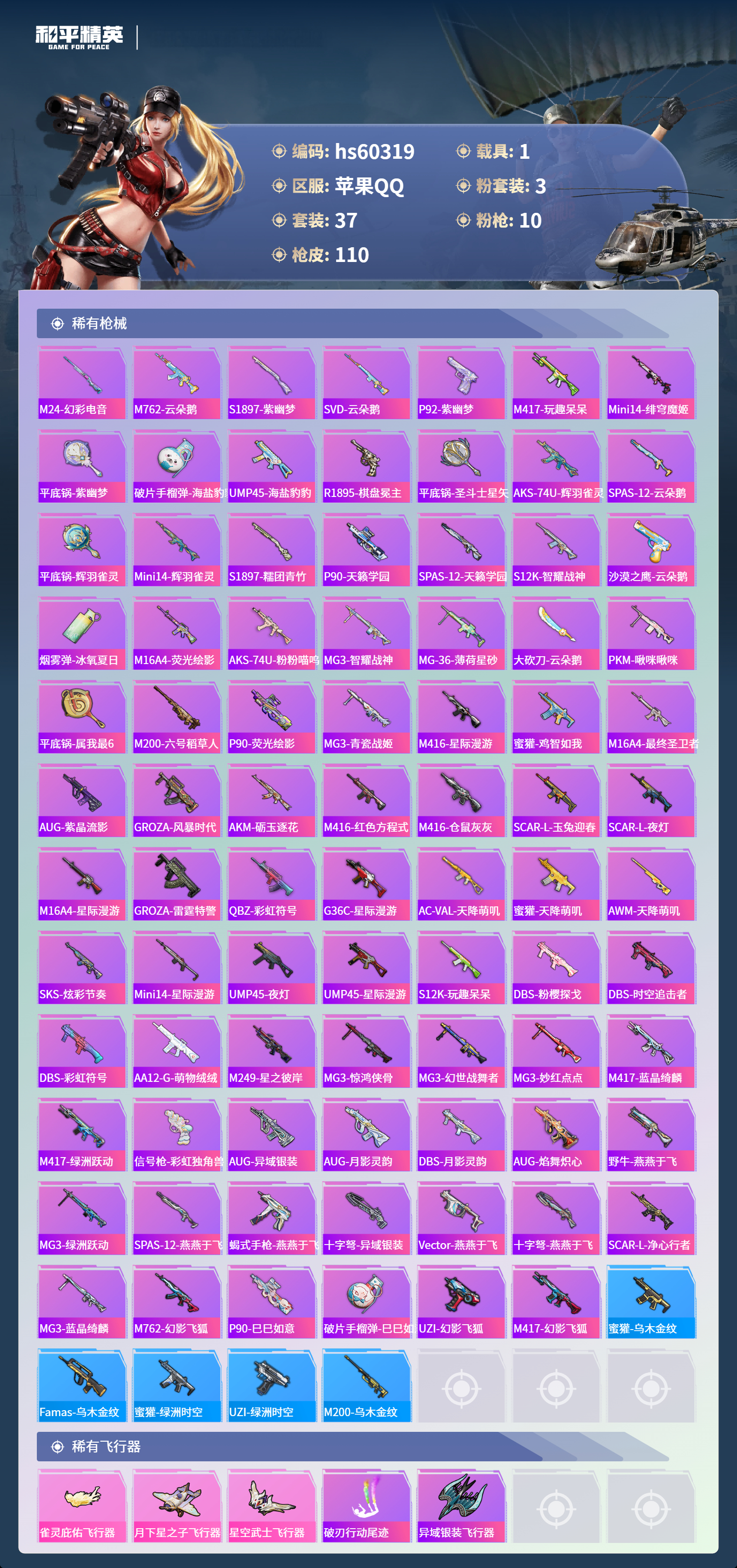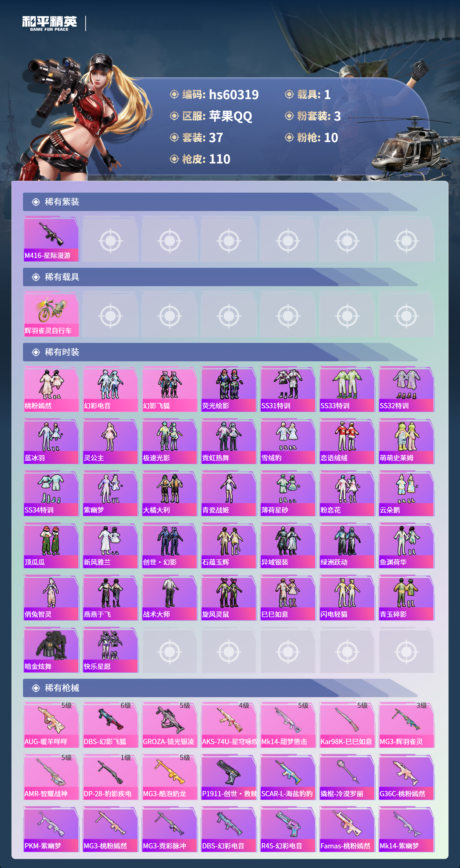 1载具-37套装-110呛皮-hs60319 苹果手q-2王牌印记-3粉装-10特效呛-1载具-28400热力值-37套装-110呛皮-2卓越印记-2传奇印记【3粉装】套装-幻影飞狐套装-桃粉嫣然套装-幻彩电音【10特效呛】dp-28-豹影疾电/1级mk14-甜梦熊击/5级groza-镜光银凌/5级amr-智耀战神/5级mg3-辉羽雀灵/3级dbs-幻影飞狐/6级mg3-酷泡奶龙/5级aug-暖羊咩咩/5