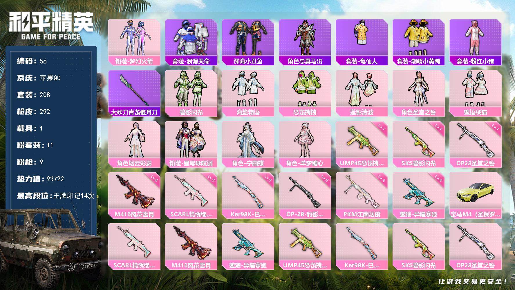 [16565562]【编号50168 可秒换绑】【顶级公主号!女孩子的衣柜 喜欢的宝宝快来下单吧!】 苹果 手q-11粉装-9特效呛-1载具-3粉色飞行器-93722热力值-14王牌印记-208套装-292呛皮 【热门品类】:粉装-梦幻火箭,套装-浪漫天命,套装-深海小丑鱼,角色-忠真马岱,套装-龟仙人,套装-潮萌小黄鸭,套装-粉红小猪,大砍刀-青龙偃月刀 【粉色套装】:粉装-梦幻火箭,粉装-碧影闪光,粉装-海盐物语,粉装-恐龙拽拽,粉装-莲影清波,角色-圣堂之誓,粉装-蜜语绒猫,角色-烟云彩露,粉装-星穹咏叹调,角色-宁雨蝶,角色-羊梦糖心 【粉色呛皮等级】:scar-l-锦绣绵绵五级,m416-风花雪月六级,蜜獾-异瞳寒姬四级,ump45-恐龙拽拽七级,kar98k-巳巳如意五级,sks-碧影闪光七级,dp-28-圣堂之誓七级,dp-28-豹影疾电五级,pkm-江南烟雨四级 【粉色载具】:宝马m4(圣保罗黄) 【粉色呛皮】:scar-l-锦绣绵绵,m416-风花雪月,蜜獾-异瞳寒姬,ump45-恐龙拽拽,kar98k-巳巳如意,sks-碧影闪光,dp-28-圣堂之誓,dp-28-豹影疾电,pkm-江南烟雨 【粉色飞行器】:镜光幻境飞行翼,雀灵庇佑飞行器 【粉色降落伞】:凝视深渊降落伞,梦幻火箭降落伞,华贵君王降落伞,洛神天依降落伞,天之羽翼降落伞,碧影闪光降落伞,青春物语降落伞,恐龙拽拽降落伞,橘柚倾心降落伞,筑梦精灵降落伞,环太平洋降落伞,垂柳戏鸭降落伞,炫光之旅降落伞,莲影清波降落伞,龙行天下降落伞,圣堂之誓降落伞,江南烟雨降落伞,千金淑猫降落伞,樱桃泡泡降落伞,智耀战神降落伞,星穹咏叹调降落伞,冷漠罗丽降落伞,荧海星豚降落伞 【稀有套装】:套装-龟仙人,套装-巳巳如意,角色-狂花道·娜可露露,套装-青团波波,套装-燕燕于飞,套装-鱼渊荷华,套装-粉恋花,套装-紫幽梦,套装-蓝冰羽,角色-猎影月神,套装-星影赞美诗,套装-星渊小夜曲,套装-彩虹兔,套装-云朵鹅,套装-雪绒豹,角色-灵公主,角色-乐音,角色-夜瞳黯灵,套装-朱霞炽焰,套装-凌霄紫焰,套装-擎苍青焰,角色-绯色魅影,套装-炫彩糖果 【稀有呛皮】:akm-彩虹符号,akm-影袭,akm-恐龙拽拽,akm-江南烟雨,akm-灼热熔岩,akm-环太平洋,akm-破晓战魂,akm-萌趣