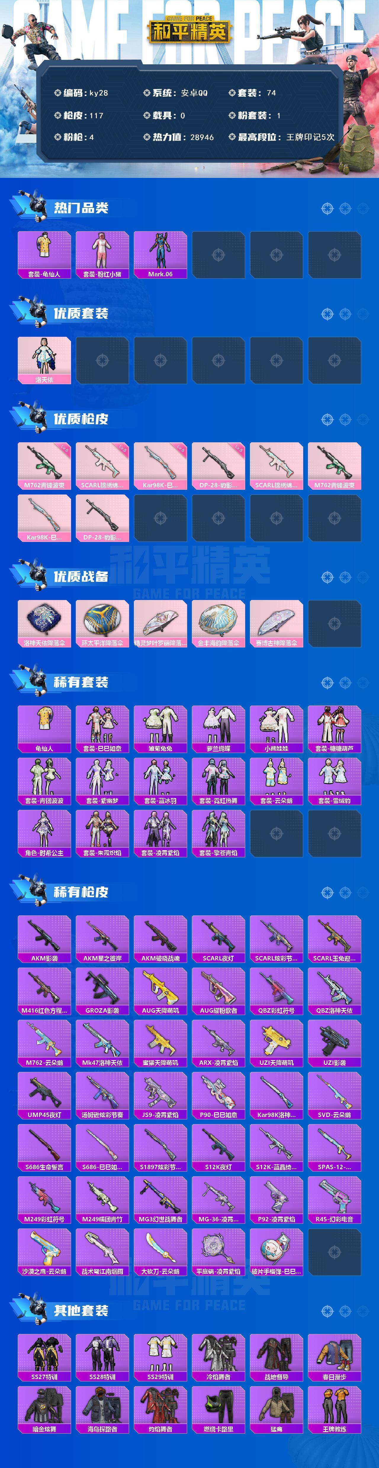 [16565621]安卓 手q-1粉装-4特效呛-0载具-1粉色飞行器-28946热力值-5王牌印记-74套装-117呛皮 【热门品类】:套装-龟仙人,套装-粉红小猪,角色-mark.06 【粉色套装】:角色-洛天依 【粉色呛皮等级】:scar-l-锦绣绵绵五级,m762-青锋波束五级,kar98k-巳巳如意五级,dp-28-豹影疾电五级 【粉色呛皮】:scar-l-锦绣绵绵,m762-青锋波束,kar98k-巳巳如意,dp-28-豹影疾电 【粉色降落伞】:洛神天依降落伞,环太平洋降落伞,精灵梦叶罗丽降落伞,金丰海韵降落伞,赛博古神降落伞,炫彩糖果降落伞 【稀有套装】:套装-龟仙人,套装-巳巳如意,套装-炫彩糖果,套装-雏菊兔兔,套装-萝兰蝴蝶,套装-小熊娃娃,套装-糖糖葫芦,套装-青团波波,套装-紫幽梦,套装-蓝冰羽,套装-霓虹热舞,套装-云朵鹅,套装-雪绒豹,角色-时希公主,套装-朱霞炽焰,套装-凌霄紫焰,套装-擎苍青焰 【稀有呛皮】:aug-冰晶雪宝,akm-影袭,akm-星之彼岸,akm-破晓战魂,scar-l-夜灯,scar-l-炫彩节奏,scar-l-玉兔迎春,m416-红色方程式,groza-影袭,aug-天降萌叽,aug-耀粉歌者,q-彩虹符号,q-洛神天依,m762-云朵鹅,mk47-洛神天依,蜜獾-天降萌叽,arx-凌霄紫焰,uzi-天降萌叽,uzi-影袭,ump45-夜灯,汤姆逊-炫彩节奏,js9-凌霄紫焰,p90-巳巳如意,kar98k-洛神天依,svd-云朵鹅,s686-生命誓言,s686-巳巳如意,s1897-炫彩节奏,s12k-夜灯,s12k-蓝晶绮麟,spas-12-云朵鹅,m249-彩虹符号,m249-糯团青竹,mg3-幻世战舞者,mg-36-凌霄紫焰,p92-凌霄紫焰,r45-幻彩电音,沙墨之鹦-云朵鹅,战术弩-江南烟雨,大砍刀-云朵鹅,平底锅-凌霄紫焰,破片手留单-巳巳如意 【其他套装】:套装-ss27特训,套装-ss28特训,套装-ss29特训,套装-冷焰舞者,套装-战地督导,套装-春日漫步,套装-暗金炫舞,套装-海岛探路者,套装-灼焰舞者,套装-燃烧卡路里,套装-猛禽,套装-王牌教练,套装-白色伏地魔,套装-破蛋小黄鸡,套装-竞技名士,套装-竞技达人朋克,套装-粉红小猪,套装-街头潮人,套装-长空猛禽,套装-青年教官,