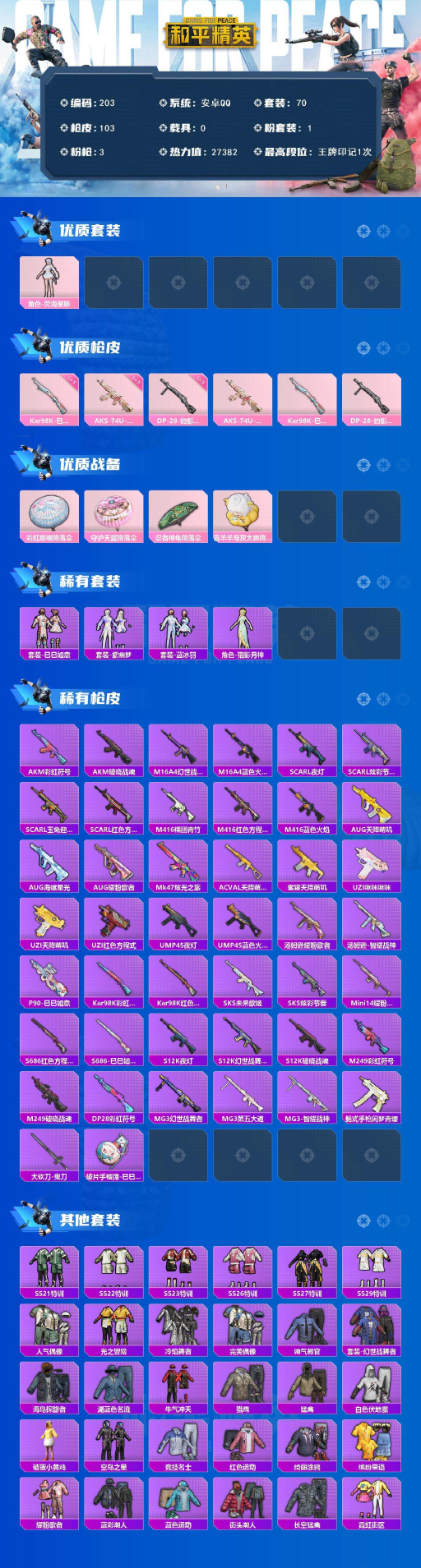 安卓手q-1粉装-3特效呛-70套装-103呛皮-1王牌印记-坚韧铂金ⅳ-27382热力值【1粉装】角色-荧海星豚【3特效呛】dp-28-豹影疾电[5级]aks-74u-星穹咏叹调[5级]kar98k-巳巳如意[5级]【6飞行器】异域银装飞行器狂鲨锋刃飞行器炫彩糖果飞行器空岛之星尾迹马上有福飞行器光之冒险尾迹【1头盔】深海小丑鱼头盔【169其它衣服和呛皮】ss29