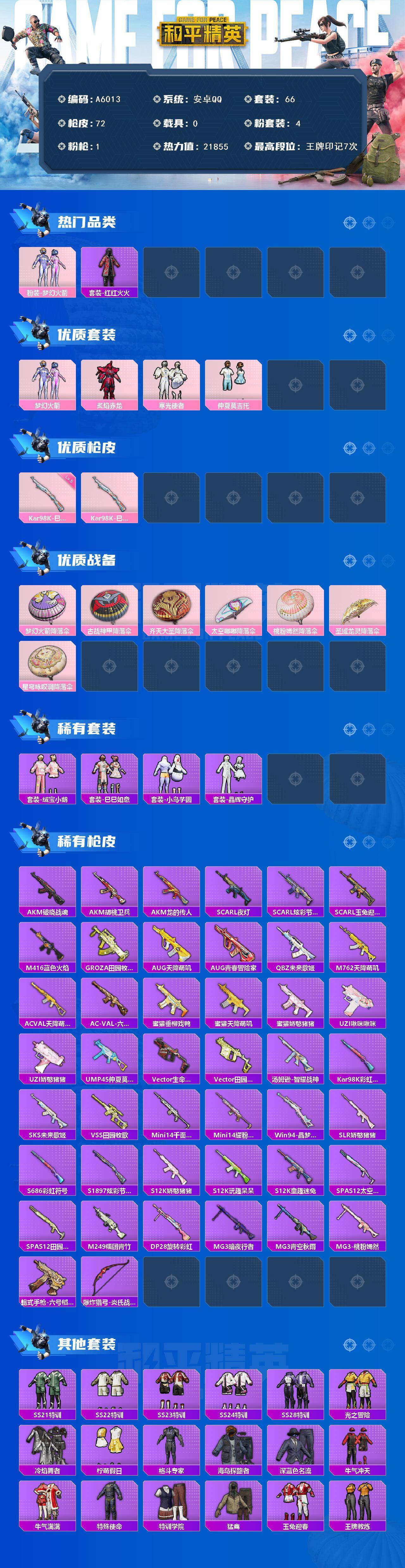 [16565945]安卓 【小号 梦幻火箭】手q-4粉装-1特效呛-0载具-0粉色飞行器-21855热力值-7王牌印记-66套装-72呛皮 【热门品类】:粉装-梦幻火箭,套装-红红火火 【粉色套装】:粉装-梦幻火箭,粉装-炙焰赤龙,粉装-寒光使者,粉装-仲夏莫吉托 【粉色呛皮等级】:kar98k-巳巳如意五级 【粉色呛皮】:kar98k-巳巳如意 【粉色降落伞】:梦幻火箭降落伞,古战神甲降落伞,齐天大圣降落伞,太空嘟嘟降落伞,桃粉嫣然降落伞,圣域龙灵降落伞,星穹咏叹调降落伞,炫彩糖果降落伞 【稀有套装】:套装-绒宝小鹅,套装-巳巳如意,套装-小鸟芋圆,套装-雪国风尚,套装-晶辉守护 【稀有呛皮】:akm-破晓战魂,akm-胡桃卫兵,akm-龙的传人,scar-l-夜灯,scar-l-炫彩节奏,scar-l-玉兔迎春,m416-蓝色火焰,groza-田园牧歌,aug-天降萌叽,aug-青春冒险家,q-未来歌姬,m762-天降萌叽,ac-val-天降萌叽,ac-val-六号稻草人,蜜獾-垂柳戏鸭,蜜獾-天降萌叽,蜜獾-娇憨猪猪,uzi-啾咪啾咪,uzi-娇憨猪猪,ump45-仲夏莫吉托,vect-生命誓言,vect-田园牧歌,汤姆逊-智耀战神,kar98k-彩虹符号,sks-未来歌姬,vss-田园牧歌,mini14-千面幻镜,mini14-耀粉歌者,win94-晶梦幻蝶,slr-娇憨猪猪,s686-彩虹符号,s1897-炫彩节奏,s12k-玩趣呆呆,s12k-童趣迷兔,s12k-娇憨猪猪,spas-12-太空嘟嘟,spas-12-田园牧歌,m249-糯团青竹,dp-28-旋转彩虹,mg3-暗夜行者,mg3-青空秋雨,mg3-桃粉嫣然,蝎式手呛-六号稻草人,爆炸猎弓-炎氏战神 【其他套装】:套装-ss21特训,套装-ss22特训,套装-ss23特训,套装-ss24特训,套装-ss28特训,套装-光之冒险,套装-冷焰舞者,套装-柠萌假日,套装-格斗专家,套装-海岛探路者,套装-深蓝色名流,套装-牛气冲天,套装-牛气满满,套装-特殊使命,套装-特训学院,套装-猛禽,套装-玉兔迎春,套装-王牌教练,套装-甜蜜熊情侣,套装-白色伏地魔,套装-竞技名士,套装-红红火火,套装-缤纷果语,套装-野性战心,套装-长空猛禽,套装-霸义无双,套装-飞行日记,套装-魅力单车,套装-鹤鸣,套装-麻