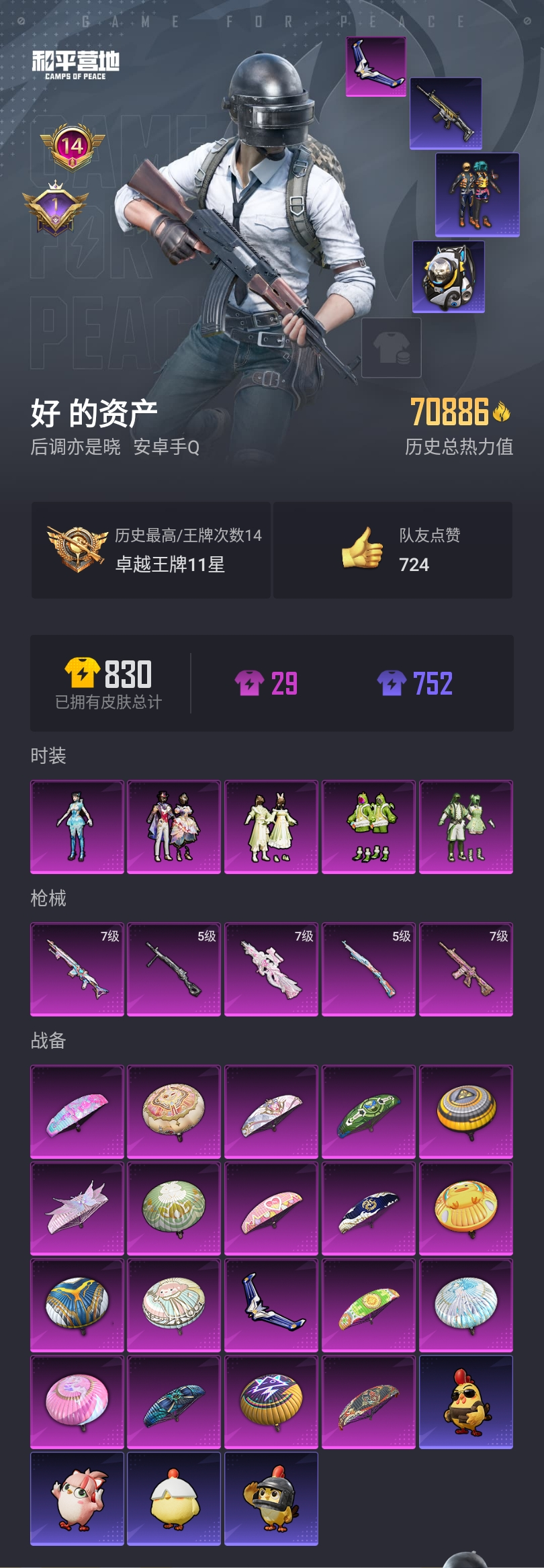 【和平精英】【lyhp21708】5粉装,5特效呛,0载具,历史最高段位:卓越王牌11星 王牌印记14次 热力值:70886,162套装,235呛械,274装备,130战备;套装:套装-青葱仙萝,套装-恐龙拽拽,套装-闲梦青缨,角色-异瞳寒姬,套装-星穹咏叹调,套装-青年教官,套装-黄色伏地魔,套装-白色伏地魔,套装-黑色伏地魔,套装-竞技名士,套装-湖蓝色名流,套装-黄色名流,套装-猛禽,套装-长空猛禽,套装-漫步者,套装-黎明保卫者,套装-海岛探路者,套装-雨林探路者,套装-六六大吉,套装-冷焰舞者,套装-特战装甲,套装-活力之心,套装-春日漫步,套装-龙腾端午,套装-燃烧卡路里,套装-滨海假日,套装-鹰眼刺客,套装-人气偶像,套装-幻影武者,套装-街头潮人,套装-红潮炫舞,套装-魅力单车,套装-耀眼新星,套装-野性战心,套装-超能勇士,套装-破晓战魂,套装-荣耀,套装-热血青春,套装-沙漠兵团,套装-极地朋克,套装-幻世战舞者,套装-奇趣章鱼,套装-清新柠檬,套装-蓝调潮人,套装-血色贵族,套装-弄潮海豚,套装-深海小丑鱼,套装-缤纷果语,套装-元素星魂,套装-麻辣教官,套装-破蛋小黄鸡,套装-金鼠迎春,套装-淡雅花蕊,套装-霓虹街区,套装-萌黄之夏,套装-超能拳王,套装-夏日音浪,套装-探宝勇士,套装-牛气满满,套装-萌趣颜团子,套装-特种颜团子,套装-战术大师,套装-牛气冲天,套装-ss18特训,套装-飞行日记,套装-热情海星,套装-纯真浪花,套装-冰爽海盐,套装-吉莉礼服,套装-鹤发童颜,套装-暗夜魅影,套装-ss17特训,套装-醒狮腾龙,套装-瑞龙福将,套装-团圆交子,套装-福星高照,套装-豚鼠丹丹,套装-虎虎生威吉莉,角色-军刀雅典娜,套装-异彩先驱,套装-霓虹极客,套装-空投萌叽,套装-ss19特训,套装-极速竞梦,套装-飞驰魅影,套装-音速流光,套装-ss20特训,套装-甜心亚梦,套装-虚音幻奏,套装-ss21特训,套装-萌趣咩咩,套装-娇憨猪猪,套装-梦幻奶油,套装-玉兔迎春,套装-ss22特训,套装-和煦暖阳,套装-田园牧歌,套装-轻风白浪,套装-光之冒险,套装-绯格组合,套装-ss23特训,套装-甜梦熊熊,套装-神气柴柴,套装-懵萌河马,套装-王牌教练,套装-柠萌假日,套装-ss24特训,套装-荧惑魅影,套装-源星混沌,套装-龟仙人,套装-ss25特训,套装-惊鸿侠骨,套装-锦衣飞扬,套装-云霞荷露,套装-果汁能量,套装-龙的传人,套装-ss26特训,套装-快闪甜心,套装-春光漫游,套装-空岛之星,玩偶服-超人强,套装-焰鹰斗篷,套装-幽夜迷踪,套装-幻羽潜行,套装-ss27特训,套装-老实芭蕉,套装-ss28特训,角色-多纳泰罗,角色-白光莹,角色-情公主,角色-冰公主,角色-银尘,套装-街头风暴,套装-海盐绵绵冰,套装-蝶变,套装-ss29特训,套装-雏菊兔兔,套装-萝兰蝴蝶,套装-火种守卫者,角色-摩登魅猫,套装-ss30特训,套装-ss31特训,套装-鱼渊荷华,套装-燕燕于飞,套装-智谋强哥,套装-ss33特训,套装-巳巳如意,套装-ss32特训,套装-青翼流星,套装-大橘大利,套装-星渊小夜曲,套装-元气之梦,套装-ss34特训,套装-朱霞炽焰,套装-凌霄紫焰,套装-薄荷星砂,套装-ss35特训,套装-琴音绮想,套装-画境星梦,套装-ss37特训,套装-ss36特训,套装-萌鸡速递;呛皮:aug-耀粉歌者,aug-青春冒险家,aug-天降萌叽,aug-异域银装,aug-紫晶流影,groza-蓝莓炮弹,groza-异彩先驱,groza-紫翼圣骑,groza-田园牧歌,groza-懵萌河马,groza-2b战斗服款,groza-海盐豹豹,groza-荧海星豚,groza-紫矿核心,g36c-暗夜玫瑰,g36c-懵萌河马,g36c-乌木金纹,7级m416-心之恋语,m416-夜灯,m416-绯红前夜,m416-红色方程式,m416-月影鸳鸯,m416-暗星紫秘,m416-糯团青竹,scar-l-红色方程式,scar-l-黄金龙骨,scar-l-夜灯,scar-l-玉兔迎春,scar-l-星途旅人,scar-l-海盐豹豹,m762-绯红前夜,m762-奇异狩猎者,m762-镭射皇者,m762-瑞龙福将,m762-天降萌叽,m762-雏菊兔兔,蜜獾-娇憨猪猪,蜜獾-天降萌叽,蜜獾-精灵梦叶罗丽,蜜獾-乌木金纹,akm-灼热熔岩,akm-生命誓言,akm-缤纷海域,akm-霓虹街区,akm-彩虹符号,akm-虎虎生威,akm-龙的传人,m16a4-红色方程式,m16a4-快乐主宰,m16a4-甜心亚梦,m16a4-幻世战舞者,m16a4-冰河战士,mk47-乌木金纹,ac-val-甜心亚梦,ac-val-乌木金纹,ac-val-天降萌叽,ac-val-快闪甜心,famas-霓彩脉冲,famas-乌木金纹,ace32-画境星梦,ace32-冰晶雪宝,q-彩虹符号,q-飞驰魅影,q-纯真浪花,arx-凌霄紫焰,5级kar98k-巳巳如意,kar98k-炫彩节奏,kar98k-红伞翩翩,kar98k-飞驰魅影,kar98k-乌木金纹,m24-乌木金纹,莫辛纳甘-乌木金纹,莫辛纳甘-懵萌河马,awm-炙焰牛王,awm-垂柳戏鸭,awm-天降萌叽,awm-焰鹰斗篷,awm-纯真浪花,amr-鸡智如我,amr-乌木金纹,m200-惊鸿侠骨,m200-乌木金纹,win94-夏日绵绵冰,win94-瑞龙福将,win94-乌木金纹,svd-霓彩脉冲,7级mk14-精灵梦叶罗丽,mk14-乌木金纹,mk14-冰河战士,slr-娇憨猪猪,slr-霓彩脉冲,slr-乌木金纹,mini14-金玉无双,mini14-穿刺龙虾,mini14-耀粉歌者,mini14-异彩先驱,mini14-旋转彩虹,mini14-香桃花海,mini14-雏菊兔兔,vss-星之彼岸,vss-田园牧歌,vss-彩虹符号,sks-迅猛狂鲨,sks-炫彩节奏,mk20-h-莲影清波,mk20-h-快闪甜心,mk20-h-狂鲨锋刃,mk20-h-乌木金纹,m1加兰德-画境星梦,m417-惊鸿侠骨,mk12-乌木金纹,汤姆逊-奇异狩猎者,汤姆逊-耀粉歌者,汤姆逊-异彩先驱,汤姆逊-环太平洋,汤姆逊-天降萌叽,汤姆逊-纯真浪花,汤姆逊-乌木金纹,mp5k-异彩先驱,mp5k-画境星梦,mp5k-乌木金纹,vect-彩虹符号,vect-暗夜玫瑰,vect-田园牧歌,vect-焰鹰斗篷,vect-创世·救赎,vect-燕燕于飞,7级p90-冷漠罗丽,p90-飞驰魅影,p90-快闪甜心,p90-玩趣呆呆,p90-巳巳如意,p90-紫矿核心,p90-乌木金纹,uzi-红色方程式,uzi-炫彩节奏,uzi-娇憨