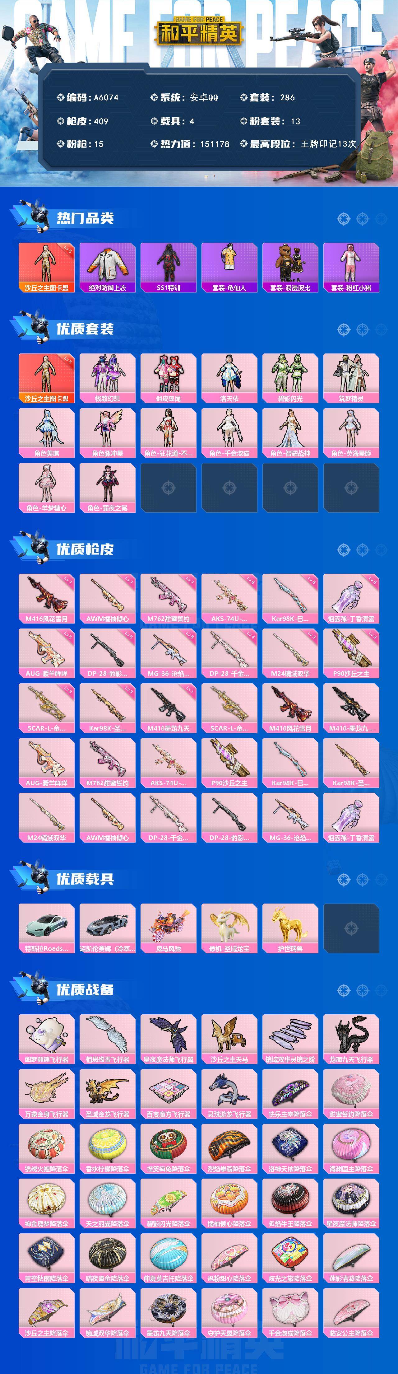 [16569024]安卓 【神装号 沙丘之主-图卡盟五级/绝对防御上衣/洛天依/m416-风花雪月七级/scar-l-金蛇镇世三级/特斯拉roadster(水滴蓝)】手q-1神装-13粉装-15特效呛-4载具-12粉色飞行器-151178热力值-13王牌印记-286套装-409呛皮 【红色神装等级】:沙丘之主-图卡盟五级 【红色角色神装】:沙丘之主-图卡盟 【热门品类】:绝对防御上衣,套装-ss1特训,套装-龟仙人,套装-浪漫波比,套装-粉红小猪 【粉色套装】:粉装-极致幻想,粉装-俏皮狐尾,角色-洛天依,粉装-碧影闪光,粉装-筑梦精灵,角色-美琪,角色-脉冲星,角色-狂花道·不知火舞,角色-千金淑猫,角色-智耀战神,角色-荧海星豚,角色-羊梦糖心,角色-罪夜之冕 【粉色呛皮等级】:scar-l-金蛇镇世三级,m416-风花雪月七级,m416-墨龙九天一级,aug-暖羊咩咩五级,m762-甜蜜誓约七级,aks-74u-星穹咏叹调六级,p90-沙丘之主三级,kar98k-巳巳如意五级,kar98k-圣域龙灵三级,m24-镜域双华三级,awm-橘柚倾心七级,dp-28-千金淑猫四级,dp-28-豹影疾电五级,mg-36-沧焰双生五级,盐雾蛋-丁香清露五级 【粉色载具】:特斯拉roadster(水滴蓝),迈凯伦塞纳(冷萃蓝),鬼马风驰,僚机-圣域龙宝,护世瑞兽 【粉色呛皮】:scar-l-金蛇镇世,m416-风花雪月,m416-墨龙九天,aug-暖羊咩咩,m762-甜蜜誓约,aks-74u-星穹咏叹调,p90-沙丘之主,kar98k-巳巳如意,kar98k-圣域龙灵,m24-镜域双华,awm-橘柚倾心,dp-28-千金淑猫,dp-28-豹影疾电,mg-36-沧焰双生,盐雾蛋-丁香清露 【粉色飞行器】:酣梦熊熊飞行器,相思残雪飞行器,星夜魔法师飞行翼,沙丘之主天马,镜域双华-灵镜之阶,龙翔九天飞行器,万象金身飞行器,圣域金龙飞行器,百变魔方飞行器,灵珠游龙飞行器 【粉色降落伞】:快乐主宰降落伞,甜蜜誓约降落伞,锦绣火鲤降落伞,香水柠檬降落伞,怪笑疯兔降落伞,烈焰拳霸降落伞,洛神天依降落伞,海渊国主降落伞,绚金瑰梦降落伞,天之羽翼降落伞,碧影闪光降落伞,橘柚倾心降落伞,炙焰牛王降落伞,星夜魔法师降落伞,青空秋雨降落伞,
