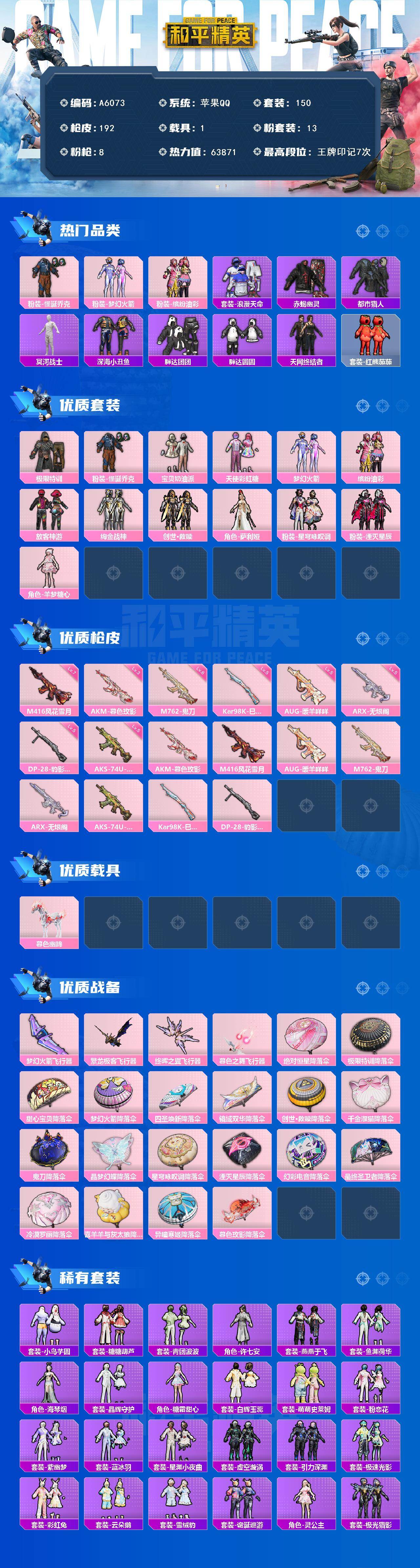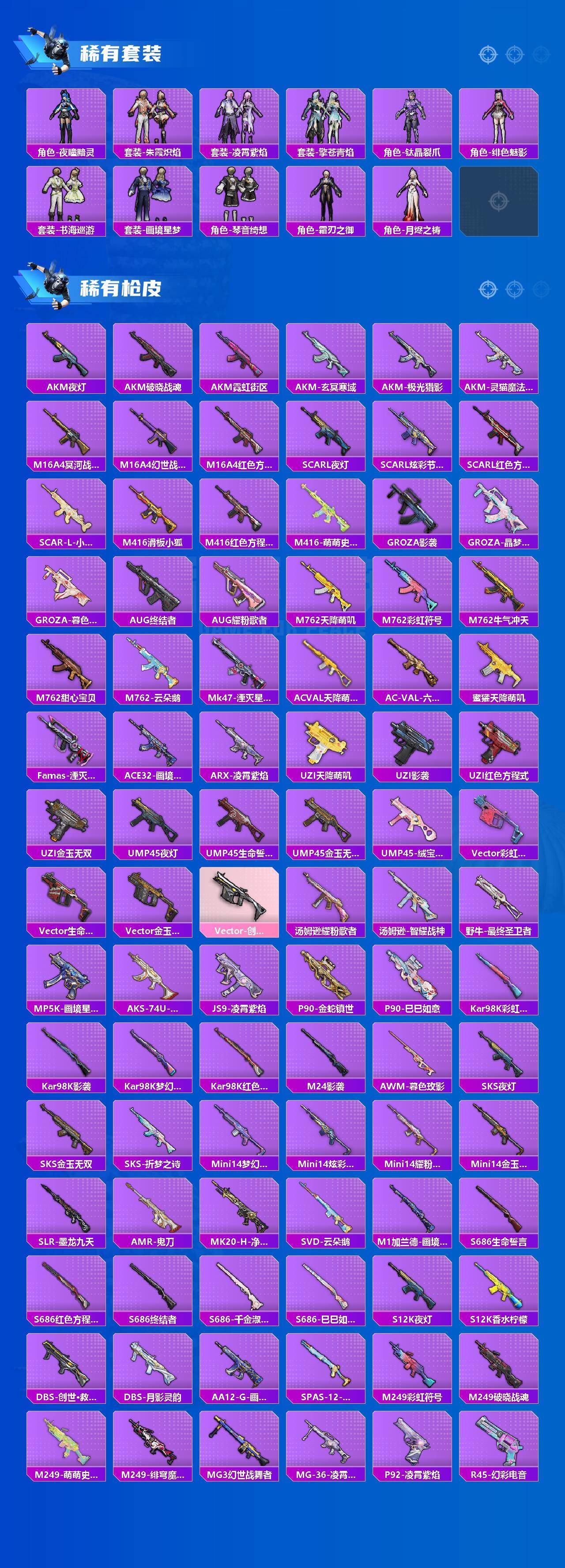 [16569172]苹果 【素材号 怪诞乔克/梦幻火箭/缤纷油彩/浪漫天命/赤蝎幽灵/都市猎人/冥河战士/深海小丑鱼/胖达团团/天网终结者/红熊茄茄/放客神游/m416-风花雪月七级/暮色幽蹄】】手q-13粉装-8特效呛-1载具-5粉色飞行器-63871热力值-7王牌印记-150套装-192呛皮 【热门品类】:粉装-怪诞乔克,粉装-梦幻火箭,粉装-缤纷油彩,套装-浪漫天命,套装-赤蝎幽灵,套装-都市猎人,套装-冥河战士,套装-深海小丑鱼,套装-胖达团团,套装-胖达圆圆,套装-天网终结者,套装-红熊茄茄 【粉色套装】:粉装-极限特训,粉装-怪诞乔克,粉装-宝贝奶油派,粉装-天使彩虹糖,粉装-梦幻火箭,粉装-缤纷油彩,粉装-放客神游,粉装-绚金战神,套装-创世·救赎,角色-萨利娅,粉装-星穹咏叹调,粉装-湮灭星辰,角色-羊梦糖心 【粉色呛皮等级】:akm-暮色玫影三级,m416-风花雪月七级,aug-暖羊咩咩五级,m762-鬼刀六级,arx-无垠阁五级,aks-74u-森灵之息五级,kar98k-巳巳如意五级,dp-28-豹影疾电五级 【粉色载具】:暮色幽蹄 【粉色呛皮】:akm-暮色玫影,m416-风花雪月,aug-暖羊咩咩,m762-鬼刀,arx-无垠阁,aks-74u-森灵之息,kar98k-巳巳如意,dp-28-豹影疾电 【粉色飞行器】:梦幻火箭飞行器,繁龙极客飞行器,终晖之翼飞行器,暮色之舞飞行器 【粉色降落伞】:绝对恒星降落伞,极限特训降落伞,甜心宝贝降落伞,梦幻火箭降落伞,四圣焕新降落伞,镜域双华降落伞,创世·救赎降落伞,千金淑猫降落伞,鬼刀降落伞,晶梦幻蝶降落伞,星穹咏叹调降落伞,湮灭星辰降落伞,幻彩电音降落伞,最终圣卫者降落伞,冷漠罗丽降落伞,喜羊羊与灰太狼降落伞,异瞳寒姬降落伞,炫彩糖果降落伞,暮色玫影降落伞 【稀有套装】:套装-小鸟芋圆,套装-雪国风尚,套装-炫彩糖果,套装-雁字回时,套装-糖糖葫芦,套装-青团波波,角色-许七安,套装-燕燕于飞,套装-鱼渊荷华,角色-海琴烟,套装-晶辉守护,角色-糖霜甜心,套装-白辉玉蕊,套装-萌萌史莱姆,套装-粉恋花,套装-紫幽梦,套装-蓝冰羽,套装-星渊小夜曲,套装-虚空漩涡,套装-引力深渊,套装-极速光影,套装-彩虹兔,套装-云朵鹅,套装-雪绒豹,套装-诡诞巡游,角色-灵公主,套装-极光猎影
