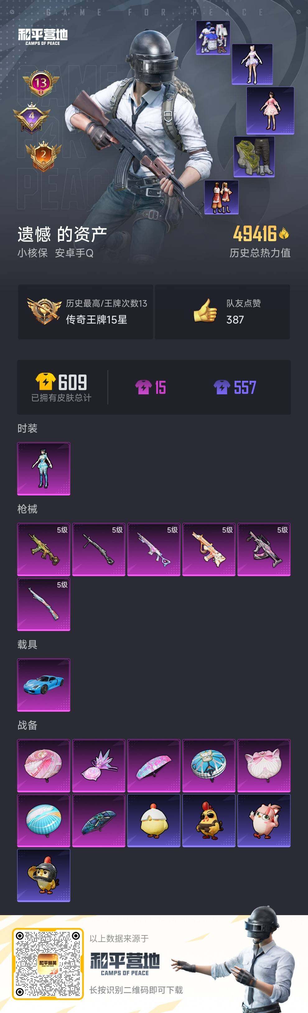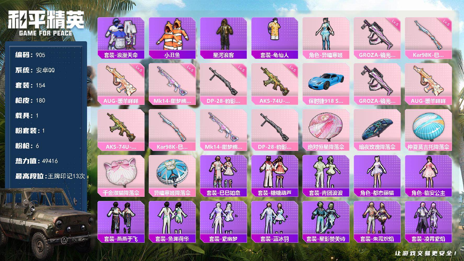 [16569800]包里还有580个扭蛋碎片 安卓 手q-1粉装-6特效呛-1载具-1粉色飞行器-49416热力值-13王牌印记-154套装-180呛皮 【热门品类】:套装-浪漫天命,套装-小丑鱼,套装-星河浪客,套装-龟仙人 【粉色套装】:角色-异瞳寒姬 【粉色呛皮等级】:groza-镜光银凌五级,aug-暖羊咩咩五级,aks-74u-森灵之息五级,kar98k-巳巳如意五级,mk14-甜梦熊击五级,dp-28-豹影疾电五级 【粉色载具】:保时捷918 sper(沉静蓝) 【粉色呛皮】:groza-镜光银凌,aug-暖羊咩咩,aks-74u-森灵之息,kar98k-巳巳如意,mk14-甜梦熊击,dp-28-豹影疾电 【粉色降落伞】:绝对恒星降落伞,暗夜玫瑰降落伞,仲夏莫吉托降落伞,千金淑猫降落伞,异瞳寒姬降落伞,炫彩糖果降落伞 【稀有套装】:套装-龟仙人,套装-巳巳如意,套装-雪国风尚,套装-炫彩糖果,套装-糖糖葫芦,套装-青团波波,角色-都市丽猫,角色-临安公主,套装-燕燕于飞,套装-鱼渊荷华,套装-紫幽梦,套装-蓝冰羽,套装-星影赞美诗,套装-朱霞炽焰,套装-凌霄紫焰,套装-书海巡游,套装-画境星梦,套装-琴音绮想 【稀有呛皮】:aug-冰晶雪宝,akm-影袭,akm-破晓战魂,akm-缤纷海域,akm-萌趣颜团子,akm-龙的传人,m16a4-幻世战舞者,m16a4-红色方程式,m16a4-蓝色火焰,scar-l-炫彩节奏,scar-l-玉兔迎春,scar-l-红色方程式,m416-糯团青竹,m416-红色方程式,m416-蓝色火焰,groza-彩虹符号,groza-影袭,groza-田园牧歌,aug-天降萌叽,aug-耀粉歌者,aug-闲梦青缨,q-彩虹符号,m762-天降萌叽,mk47-炫光之旅,蜜獾-天降萌叽,ace32-画境星梦,arx-凌霄紫焰,uzi-啾咪啾咪,uzi-天降萌叽,uzi-影袭,uzi-炫彩节奏,uzi-红色方程式,ump45-生命誓言,ump45-蓝色火焰,vect-彩虹符号,vect-生命誓言,vect-田园牧歌,汤姆逊-天降萌叽,汤姆逊-耀粉歌者,mp5k-画境星梦,js9-凌霄紫焰,p90-巳巳如意,kar98k-影袭,kar98k-炫彩节奏,kar98k-红色方程式,m24-影袭,awm-暮色玫影