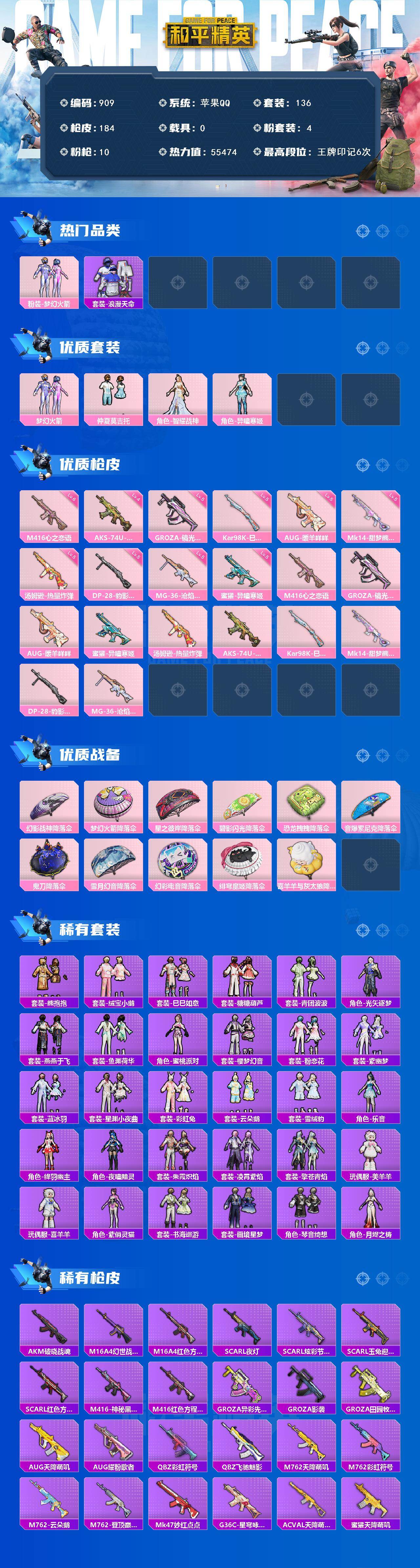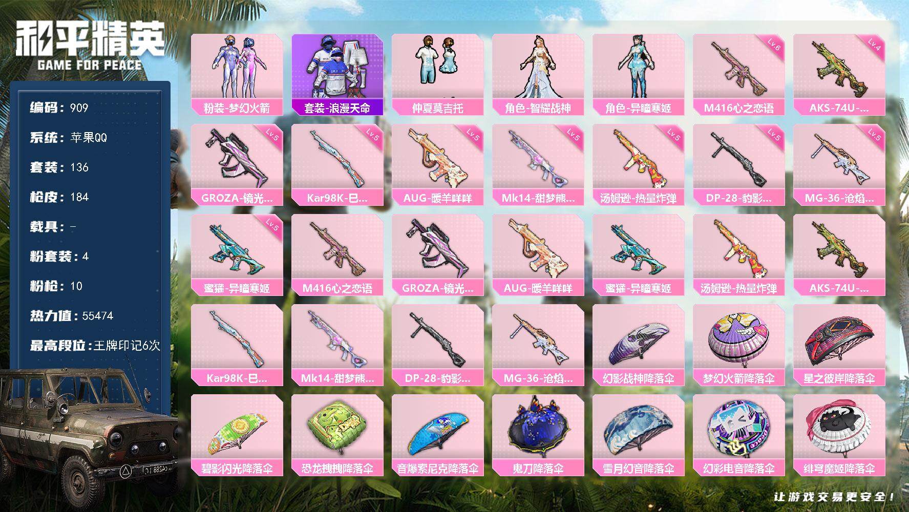 [16570057]苹果 手q-4粉装-10特效呛-0载具-1粉色飞行器-55474热力值-6王牌印记-136套装-184呛皮 【热门品类】:粉装-梦幻火箭,套装-浪漫天命 【粉色套装】:粉装-梦幻火箭,粉装-仲夏莫吉托,角色-智耀战神,角色-异瞳寒姬 【粉色呛皮等级】:m416-心之恋语六级,groza-镜光银凌五级,aug-暖羊咩咩五级,蜜獾-异瞳寒姬五级,汤姆逊-热量炸弹五级,aks-74u-森灵之息四级,kar98k-巳巳如意五级,mk14-甜梦熊击五级,dp-28-豹影疾电五级,mg-36-沧焰双生五级 【粉色呛皮】:m416-心之恋语,groza-镜光银凌,aug-暖羊咩咩,蜜獾-异瞳寒姬,汤姆逊-热量炸弹,aks-74u-森灵之息,kar98k-巳巳如意,mk14-甜梦熊击,dp-28-豹影疾电,mg-36-沧焰双生 【粉色降落伞】:幻影战神降落伞,梦幻火箭降落伞,星之彼岸降落伞,碧影闪光降落伞,恐龙拽拽降落伞,音爆索尼克降落伞,鬼刀降落伞,雪月幻音降落伞,幻彩电音降落伞,绯穹魔姬降落伞,喜羊羊与灰太狼降落伞,炫彩糖果降落伞 【稀有套装】:套装-熊抱抱,套装-绒宝小鹅,套装-巳巳如意,套装-雪国风尚,套装-炫彩糖果,套装-糖糖葫芦,套装-青团波波,角色-光矢逐梦,套装-燕燕于飞,套装-鱼渊荷华,角色-蜜桃派对,套装-樱梦幻音,套装-粉恋花,套装-紫幽梦,套装-蓝冰羽,套装-星渊小夜曲,套装-彩虹兔,套装-云朵鹅,套装-雪绒豹,角色-乐音,角色-绛羽幽主,角色-夜瞳黯灵,套装-朱霞炽焰,套装-凌霄紫焰,套装-擎苍青焰,玩偶服-美羊羊,玩偶服-喜羊羊,角色-紫俏灵猫,套装-书海巡游,套装-画境星梦,套装-琴音绮想,角色-月烬之祷 【稀有呛皮】:aug-冰晶雪宝,akm-破晓战魂,m16a4-幻世战舞者,m16a4-红色方程式,scar-l-夜灯,scar-l-炫彩节奏,scar-l-玉兔迎春,scar-l-红色方程式,m416-神秘黑猫,m416-红色方程式,groza-异彩先驱,groza-影袭,groza-田园牧歌,aug-天降萌叽,aug-耀粉歌者,q-彩虹符号,q-飞驰魅影,m762-天降萌叽,m762-彩虹符号,m762-云朵鹅,m762-登顶巅峰,mk47-妙红点点,g36c-星穹咏叹调,ac-val-天降萌叽,蜜