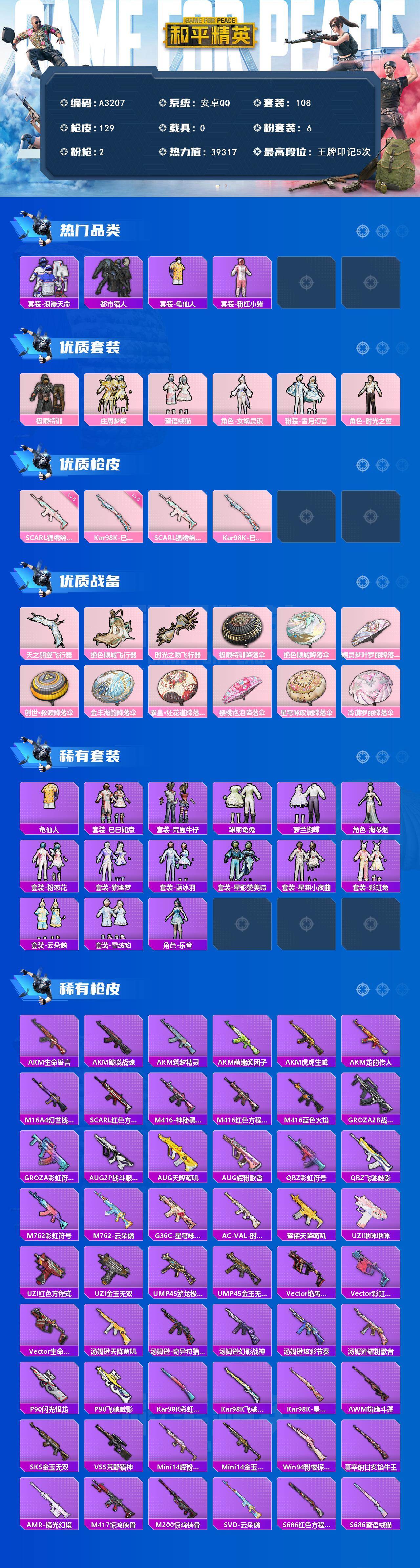 [15661438]安卓【小号/都市猎人/极限特训/百万伏特背包3级/套装-粉红小猪/浪漫天命 scar-l-锦绣绵绵五级】 手q-6粉装-2特效呛-0载具-3粉色飞行器-39317热力值-5王牌印记-108套装-129呛皮 【热门品类】:套装-浪漫天命,套装-都市猎人,套装-龟仙人,套装-粉红小猪 【粉色套装】:粉装-极限特训,粉装-庄周梦蝶,粉装-蜜语绒猫,角色-女娲灵识,粉装-雪月幻音,角色-时光之誓 【粉色呛皮等级】:scar-l-锦绣绵绵五级,kar98k-巳巳如意五级 【粉色呛皮】:scar-l-锦绣绵绵,kar98k-巳巳如意 【粉色飞行器】:天之羽翼飞行器,绝色倾城飞行器,时光之吻飞行器 【粉色降落伞】:极限特训降落伞,绝色倾城降落伞,精灵梦叶罗丽降落伞,创世·救赎降落伞,金丰海韵降落伞,拳皇·狂花道降落伞,樱桃泡泡降落伞,星穹咏叹调降落伞,冷漠罗丽降落伞 【稀有套装】:套装-龟仙人,套装-巳巳如意,套装-荒原牛仔,套装-雏菊兔兔,套装-萝兰蝴蝶,角色-海琴烟,套装-粉恋花,套装-紫幽梦,套装-蓝冰羽,套装-星影赞美诗,套装-星渊小夜曲,套装-彩虹兔,套装-云朵鹅,套装-雪绒豹,角色-乐音 【稀有呛皮】:akm-生命誓言,akm-破晓战魂,akm-筑梦精灵,akm-萌趣颜团子,akm-虎虎生威,akm-龙的传人,m16a4-幻世战舞者,scar-l-红色方程式,m416-神秘黑猫,m416-红色方程式,m416-蓝色火焰,groza-2b战斗服款,groza-彩虹符号,aug-2p战斗服款,aug-天降萌叽,aug-耀粉歌者,q-彩虹符号,q-飞驰魅影,m762-彩虹符号,m762-云朵鹅,g36c-星穹咏叹调,ac-val-时光之吻,蜜獾-天降萌叽,uzi-啾咪啾咪,uzi-红色方程式,uzi-金玉无双,ump45-繁龙极客,ump45-金玉无双,vect-焰鹰斗篷,vect-彩虹符号,vect-生命誓言,汤姆逊-天降萌叽,汤姆逊-奇异狩猎者,汤姆逊-幻影战神,汤姆逊-炫彩节奏,汤姆逊-耀粉歌者,p90-闪光银龙,p90-飞驰魅影,kar98k-彩虹符号,kar98k-飞驰魅影,kar98k-星穹咏叹调,awm-焰鹰斗篷,sks-金玉无双,vss-荒野猎神,mini14-耀粉歌者,mini14-金玉无双,win94-粉樱探戈,莫辛