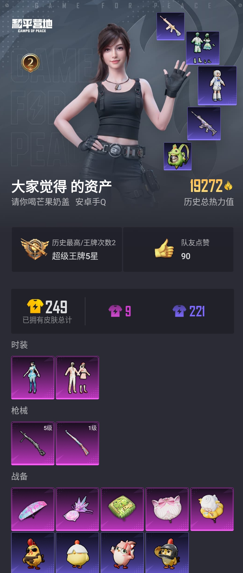 【和平精英】【lyhp19826】2粉装,2特效呛,0载具,历史最高段位:超级王牌5星 王牌印记2次 热力值:19272,49套装,68呛械,87装备,36战备;套装:套装-第五大道,角色-异瞳寒姬,套装-黑色伏地魔,套装-竞技名士,套装-长空猛禽,套装-特殊使命,套装-蓝彩潮人,套装-幻世战舞者,套装-甜蜜熊情侣,套装-缤纷果语,套装-龙魂突击队,套装-麻辣教官,套装-破蛋小黄鸡,套装-夏日音浪,套装-牛气满满,套装-战术大师,套装-吉莉礼服,套装-豚鼠丹丹,套装-ss19特训,套装-炫蓝之夏,套装-ss20特训,套装-ss21特训,套装-玉兔迎春,套装-ss22特训,套装-光之冒险,套装-ss23特训,套装-青玉碎影,套装-ss24特训,套装-涂山之恋,套装-ss25特训,套装-香桃花海,套装-冰河战士,套装-漫游都市,套装-ss28特训,套装-蝶变,套装-ss29特训,套装-星途旅人,套装-ss31特训,套装-ss33特训,玩偶服-喜羊羊,套装-元气之梦,套装-ss34特训,套装-擎苍青焰,套装-朱霞炽焰,套装-游乐,套装-凌霄紫焰,套装-薄荷星砂,套装-ss35特训,套装-萌鸡速递;呛皮:m16a4-幻世战舞者,m16a4-冰河战士,akm-灼热熔岩,akm-涂鸦街区,akm-恐龙拽拽,akm-绿洲时空,scar-l-红色方程式,scar-l-炫彩节奏,scar-l-玉兔迎春,scar-l-星途旅人,scar-l-海盐豹豹,ac-val-乌木金纹,ac-val-天降萌叽,m416-蓝色火焰,m416-彩虹嘻嘻猴,蜜獾-天降萌叽,famas-乌木金纹,aug-耀粉歌者,g36c-金风玉露,mk47-洛神天依,mk47-乌木金纹,q-彩虹符号,groza-恐龙拽拽,groza-海盐豹豹,arx-凌霄紫焰,m762-天降萌叽,awm-恐龙拽拽,1级kar98k-巳巳如意,kar98k-炫彩节奏,win94-乌木金纹,m24-乌木金纹,amr-乌木金纹,mk14-乌木金纹,mk14-冰河战士,mk14-薄荷星砂,mini14-香桃花海,mini14-鸡智如我,vss-彩虹符号,vss-香桃花海,mk20-h-乌木金纹,ump45-蓝色火焰,js9-凌霄紫焰,uzi-金风玉露,uzi-天降萌叽,uzi-冰河战士,uzi-炫彩糖果,汤姆逊-耀粉歌者,aks-74u-乌木金纹,vect-生命誓言,p90-乌木金纹,s12k-幻世战舞者,spas-12-乌木金纹,dbs-荧海星豚,dbs-乌木金纹,s686-生命誓言,5级dp-28-豹影疾电,dp-28-彩虹符号,mg3-幻世战舞者,mg3-乌木金纹,m249-彩虹符号,m249-糯团青竹,mg-36-凌霄紫焰,p92-凌霄紫焰,平底锅-光之冒险,平底锅-凌霄紫焰,破片手留单-星途旅人,破片手留单-拽到爆炸,铝热弹-炫彩糖果;降落伞:炫彩糖果飞行器,光之冒险尾迹,鸡智如我飞行器; 详情看图2粉装2特效呛 第五大道 恐龙拽拽背包