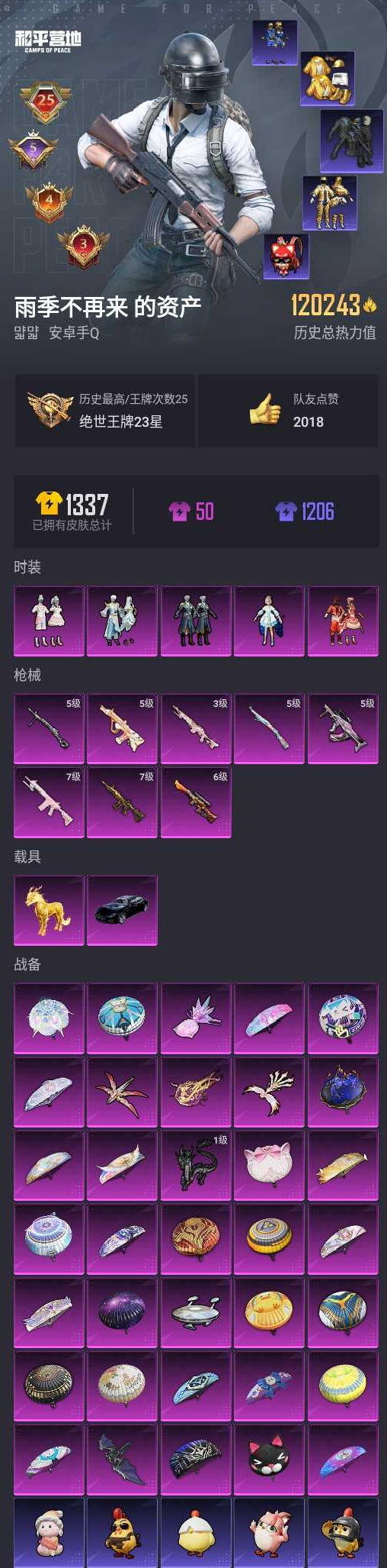 【和平精英】【lyhp21835】5粉装,8特效呛,2载具,历史最高段位:绝世王牌23星 王牌印记25次 热力值:120243,258套装,356呛械,439装备,240战备;套装:套装-锦绣火鲤,角色-洛天依,套装-青空秋雨,套装-蜜语绒猫,套装-金丰海韵,套装-特训学院,套装-猎鹰,套装-青年教官,套装-橘黑制服,套装-红色运动,套装-黄色运动,套装-蓝色运动,套装-黄色伏地魔,套装-白色伏地魔,套装-黑色伏地魔,套装-深海格斗者,套装-帅气教官,套装-竞技名士,套装-深蓝色名流,套装-酒红色名流,套装-湖蓝色名流,套装-黄色名流,套装-猛禽,套装-棕色飞行服,套装-游猎者,套装-长空猛禽,套装-漫步者,套装-竞技勇士朋克,套装-黎明保卫者,套装-海岛探路者,套装-西部风情,套装-冷焰舞者,套装-灼焰舞者,套装-都市猎人,套装-刚毅裁决者,套装-战地菁英,套装-战地督导,套装-突袭者,套装-青春校园,套装-黄色格斗者,套装-灰色格斗者,套装-甜蜜告白,套装-迎春赐吉,套装-春日漫步,套装-龙腾端午,套装-燃烧卡路里,套装-滨海假日,套装-鹰眼刺客,套装-冰冻风暴,套装-完美偶像,套装-人气偶像,套装-幻影武者,套装-街头潮人,套装-蓝彩潮人,套装-怒火燎原,套装-决胜时刻,套装-魅力单车,套装-绮丽涂鸦,套装-耀眼新星,套装-坚韧舞者,套装-竞技达人朋克,套装-金羽特工,套装-狂沙舞者,套装-破晓战魂,套装-都市魅力,套装-荣耀,套装-风行保卫者,套装-热血青春,套装-沙漠兵团,套装-派对舞王,套装-丛林猎人,套装-雪山精英,套装-酷潮明星,套装-极地朋克,套装-烈火街头,套装-幻世战舞者,套装-甜蜜熊情侣,套装-青涩时光,套装-缤纷果语,套装-滨海厨神,套装-alan walker,套装-龙魂突击队,套装-风暴特警,套装-冰川特警,套装-极速红龙,套装-格斗先锋,套装-麻辣教官,套装-梦魇先生,套装-万圣娃娃,套装-破蛋小黄鸡,套装-疯狂小兔子,套装-深蓝冒险家,套装-迷域探索者,套装-机械英豪,套装-机械征服者,套装-ss5特训,套装-圣诞大吉,套装-浪漫波比,套装-金鼠迎春,套装-军械专家,套装-北国孤狼,套装-ss6特训,套装-ss7特训,套装-黑色刀锋,套装-核芯基因,套装-精神漫游,套装-鹤鸣,套装-霓虹街区,套装-暗夜契约,套装-纯白誓言,套装-激萌罗小黑,套装-五号元素,套装-清香五月粽,套装-ss10特训,套装-ss8特训,套装-众神之王,套装-智慧之神,套装-大橘为重,套装-软萌银虎,套装-白熊同盟,套装-萌黄之夏,套装-人鱼之吻,套装-摇滚狂鲨,套装-动感兔斯基人偶服,套装-夏日音浪,套装-ss9特训,套装-风华少年志,套装-白月香洋装,套装-牛气满满,套装-白糯汤圆,套装-ss11特训,套装-青春冒险家,套装-潮流游乐家,套装-白虎圣者,套装-原初圣火,套装-逆风勇士,套装-初火先锋,套装-静谧青瓷,套装-萌趣颜团子,套装-特种颜团子,套装-战术大师,套装-ss12特训,套装-牛气冲天,套装-ss18特训,套装-闪金天王,套装-镭射皇者,套装-银白舞王,套装-耀粉歌者,套装-治愈之星,套装-科技之星,套装-飞行日记,套装-ss13特训,套装-曼妙人鱼,套装-热情海星,套装-纯真浪花,套装-浪漫樱花,套装-ss14特训,套装-吉莉礼服,套装-龙宫之主,套装-ss15特训,套装-ss16特训,套装-暴风机械师,套装-时空追击者,套装-暗夜傀儡,套装-ss17特训,套装-智慧隐士,套装-醒狮腾龙,套装-瑞龙福将,套装-团圆交子,套装-福星高照,套装-遗落祭司,套装-虎虎生威吉莉,套装-异彩先驱,套装-霓虹极客,套装-空投萌叽,套装-ss19特训,套装-飞驰魅影,套装-音速流光,套装-ss20特训,套装-猎梦纪元,套装-甜心亚梦,套装-虚音幻奏,套装-ss21特训,套装-暖心熊熊,套装-萌趣咩咩,套装-娇憨猪猪,套装-暖心橘喵,套装-玉兔迎春,套装-ss22特训,套装-和煦暖阳,套装-田园牧歌,套装-轻风白浪,套装-绚烂繁星,套装-光之冒险,套装-ss23特训,套装-神气柴柴,套装-懵萌河马,套装-妙红点点,套装-幻彩翩翩,套装-王牌教练,套装-柠萌假日,套装-ss24特训,套装-华灯初上,套装-ss25特训,套装-金戈铁马,套装-惊鸿侠骨,套装-锦衣飞扬,套装-香桃花海,套装-龙的传人,套装-冰河战士,套装-ss26特训,套装-快闪甜心,套装-春光漫游,套装-空岛之星,套装-ss27特训,套装-恋语绒绒,套装-ss28特训,角色-拉斐尔,角色-白光莹,角色-mark.06,套装-街头风暴,套装-海盐绵绵冰,套装-蝶变,套装-小熊娃娃,套装-ss29特训,套装-雏菊兔兔,套装-萝兰蝴蝶,套装-火种守卫者,套装-星途旅人,角色-怀庆长公主,套装-ss30特训,套装-青团波波,套装-棉花软糖,套装-糖糖葫芦,套装-ss31特训,套装-鱼渊荷华,套装-燕燕于飞,套装-智谋强哥,角色-海琴烟,套装-紫幽梦,套装-ss33特训,套装-巳巳如意,套装-ss32特训,套装-青翼流星,套装-蓝冰羽,套装-大橘大利,套装-炫彩糖果,套装-星影赞美诗,套装-ss34特训,套装-薄荷星砂,套装-ss35特训,套装-琴音绮想,套装-画境星梦,套装-书海巡游,套装-ss37特训,套装-ss36特训,角色-霜刃之御,套装-雪国风尚;呛皮:5级groza-镜光银凌,groza-影袭,groza-生命誓言,groza-黑色刀锋,groza-治愈之星,groza-彩虹符号,groza-异彩先驱,groza-田园牧歌,groza-懵萌河马,groza-海盐豹豹,groza-乌木金纹,scar-l-红色方程式,scar-l-甜蜜誓约,scar-l-夜灯,scar-l-炫彩节奏,scar-l-玉兔迎春,scar-l-星途旅人,scar-l-海盐豹豹,scar-l-乌木金纹,ac-val-甜心亚梦,ac-val-乌木金纹,ac-val-天降萌叽,ac-val-快闪甜心,ac-val-玩趣呆呆,m16a4-蓝色火焰,m16a4-红色方程式,m16a4-凝视深渊,m16a4-机械英豪,m16a4-甜心亚梦,m16a4-幻世战舞者,m16a4-冰河战士,m16a4-乌木金纹,akm-灼热熔岩,akm-生