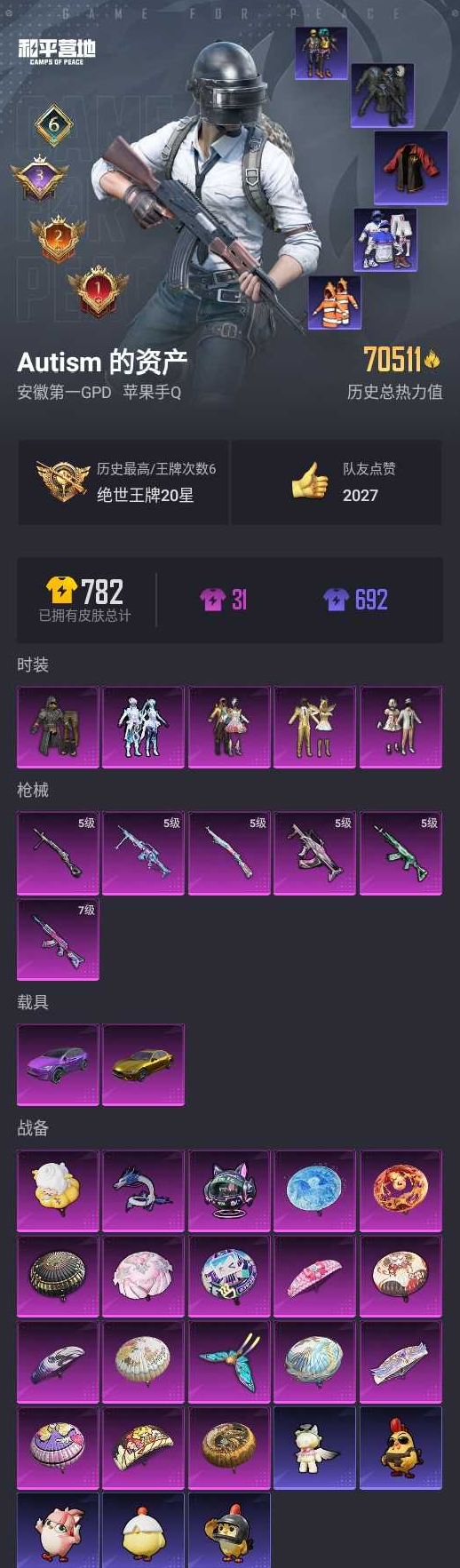 【和平精英】【lyhp21805】5粉装,6特效呛,2载具,历史最高段位:绝世王牌20星 王牌印记6次 热力值:70511,168套装,211呛械,213装备,156战备;套装:套装-极限特训,套装-宝贝奶油派,套装-蝶舞迷情,套装-金属狂野,套装-幻彩电音,套装-特训学院,套装-猎鹰,套装-青年教官,套装-橘黑制服,套装-红色运动,套装-黄色运动,套装-蓝色运动,套装-黄色伏地魔,套装-白色伏地魔,套装-黑色伏地魔,套装-骑行爱好者,套装-竞技名士,套装-深蓝色名流,套装-酒红色名流,套装-湖蓝色名流,套装-黄色名流,套装-猛禽,套装-长空猛禽,套装-漫步者,套装-竞技勇士朋克,套装-蓝色守护者,套装-海岛探路者,套装-冷焰舞者,套装-灼焰舞者,套装-都市猎人,套装-水银刺客,套装-浪漫天命,套装-战地菁英,套装-贵族骑装,套装-战地督导,套装-灰色格斗者,套装-5.56爱好者,套装-鹰眼刺客,套装-冰冻风暴,套装-冷酷挑战者,套装-完美偶像,套装-人气偶像,套装-幻影武者,套装-摇滚舞王,套装-街头潮人,套装-蓝彩潮人,套装-决胜时刻,套装-魅力单车,套装-绮丽涂鸦,套装-耀眼新星,套装-雪山征服者,套装-坚韧舞者,套装-竞技达人朋克,套装-夜莺强袭者,套装-破晓战魂,套装-都市魅力,套装-热血青春,套装-ss2特训,套装-火舞潮人,套装-雪山精英,套装-酷潮明星,套装-传奇侦探,套装-金耀舞者,套装-蓝调潮人,套装-暗影哥特,套装-弄潮海豚,套装-迅捷狂鲨,套装-呆萌铁蟹,套装-深海小丑鱼,套装-缤纷果语,套装-特种空勤,套装-元素星魂,套装-极速红龙,套装-ss3特训,套装-小丑鱼,套装-ss4特训,套装-梦魇先生,套装-万圣娃娃,套装-黑夜传说,套装-粉红小猪,套装-破蛋小黄鸡,套装-疯狂小兔子,套装-机械英豪,套装-机械征服者,套装-ss5特训,套装-圣诞大吉,套装-熔岩使者,套装-凛冬战士,套装-奇趣企鹅,套装-北国孤狼,套装-ss6特训,套装-拳皇97草薙京,套装-炽焰拳师,套装-格斗专家,套装-淡雅花蕊,套装-玲珑飞花,套装-霓虹街区,套装-ss10特训,套装-ss8特训,套装-众神之王,套装-智慧之神,套装-神秘黑猫,套装-ss9特训,套装-风华少年志,套装-白月香洋装,套装-牛气满满,套装-白糯汤圆,套装-ss11特训,套装-ss12特训,套装-耀粉歌者,套装-飞行日记,套装-ss13特训,套装-ss14特训,套装-ss19特训,套装-tt战队服,套装-炫蓝之夏,套装-ss21特训,套装-青玉碎影,套装-香桃花海,套装-ss26特训,套装-漫游都市,套装-空岛之星,套装-云魄琉璃,套装-ss27特训,套装-恋语绒绒,角色-粉雾星云,套装-白辉玉蕊,角色-mark.06,套装-街头风暴,套装-蝶变,套装-粉日山川,套装-小熊娃娃,套装-ss29特训,套装-雏菊兔兔,套装-萝兰蝴蝶,套装-鹿角斗士,套装-先驱飞行员,套装-异域银装,套装-星途旅人,角色-怀庆长公主,套装-ss30特训,套装-青团波波,套装-糖糖葫芦,套装-ss31特训,套装-鱼渊荷华,套装-燕燕于飞,套装-紫幽梦,套装-ss33特训,套装-云朵鹅,套装-ss32特训,套装-彩虹兔,套装-蓝冰羽,套装-顶瓜瓜,套装-雪绒豹,角色-时希公主,套装-星渊小夜曲,玩偶服-美羊羊,套装-元气之梦,套装-ss34特训,套装-擎苍青焰,套装-朱霞炽焰,套装-凌霄紫焰,套装-薄荷星砂,套装-ss35特训,套装-午间小调,套装-风迹短诗,套装-ss36特训,套装-萌鸡速递;呛皮:q-诡娃娃,q-神秘黑猫,q-彩虹符号,q-乌木金纹,7级akm-炫紫旋律,akm-生命誓言,akm-影袭,akm-玉龙,akm-缤纷海域,akm-春暖花开,akm-霓虹街区,akm-夜灯,akm-涂鸦街区,akm-霓彩脉冲,akm-乌木金纹,aug-耀粉歌者,aug-天降萌叽,aug-异域银装,aug-乌木金纹,5级groza-镜光银凌,groza-影袭,groza-生命誓言,groza-春暖花开,mk47-乌木金纹,mk47-风迹短诗,m16a4-生命誓言,m16a4-红色方程式,m16a4-凝视深渊,m16a4-机械英豪,m16a4-幻世战舞者,m16a4-冰河战士,m16a4-千金淑猫,m416-夜灯,m416-红色方程式,m416-仓鼠灰灰,m416-乌木金纹,scar-l-银河战甲,scar-l-夜灯,scar-l-繁花小夜曲,scar-l-炫彩节奏,scar-l-彩虹符号,scar-l-玉兔迎春,scar-l-星途旅人,scar-l-冷漠罗丽,scar-l-乌木金纹,蜜獾-糖糖葫芦,蜜獾-风迹短诗,蜜獾-乌木金纹,5级m762-青锋波束,m762-绯红前夜,m762-奇异狩猎者,m762-诡娃娃,m762-甜心宝贝,m762-拳皇97,m762-牛气冲天,m762-天降萌叽,m762-雏菊兔兔,m762-云朵鹅,famas-乌木金纹,g36c-不夜海上花,arx-凌霄紫焰,svd-冷漠罗丽,svd-云朵鹅,5级kar98k-巳巳如意,kar98k-红色方程式,kar98k-影袭,kar98k-金玉无双,kar98k-狮舞迎春,kar98k-深海曼妙,kar98k-顶峰精英,kar98k-星穹咏叹调,win94-机械英豪,win94-乌木金纹,amr-乌木金纹,awm-荒野猎神,awm-不夜海上花,awm-乌木金纹,m24-影袭,m24-未来战士,m24-冰封烈焰,m24-众神之王,m24-乌木金纹,m200-乌木金纹,莫辛纳甘-风迹短诗,vss-荒野猎神,vss-香桃花海,vss-乌木金纹,mk20-h-星梦奇缘,mk20-h-星途旅人,mk20-h-糖糖葫芦,mk20-h-净心行者,mk20-h-狂鲨锋刃,mk20-h-乌木金纹,sks-金玉无双,sks-迅猛狂鲨,sks-诡娃娃,sks-乌木金纹,mini14-金玉无双,mini14-穿刺龙虾,mini14-金鼠迎春,mini14-春暖花开,mini14-炫彩节奏,mini14-耀粉歌者,mini14-香桃花海,mini14-雏菊兔兔,mini14-乌木金纹,slr-众神之王,qbu-不夜海上花,mk14-冰河战士,mk14-紫幽梦,mk12-风迹短诗,mk12-乌木金纹,m417-玩趣呆呆,vect-生命誓言,vect-金玉无双,vect-突变脉冲,vect-游龙飞鱼,vect-燕燕于飞,vect-乌木金纹,uzi-红色方程式,uzi-影袭,uzi-金玉无双,uzi-众神之王,uzi-冰河战士,uzi-啾咪啾咪,uzi-乌木金纹,汤姆逊-耀粉歌者,汤姆逊-樱桃泡泡,汤姆逊-乌木金纹,ump45-生命誓言,ump45-金玉无双,ump45-诡娃娃,ump45-荒野猎神,ump45-春暖花开,ump45-糖糖葫芦,js9-凌霄紫