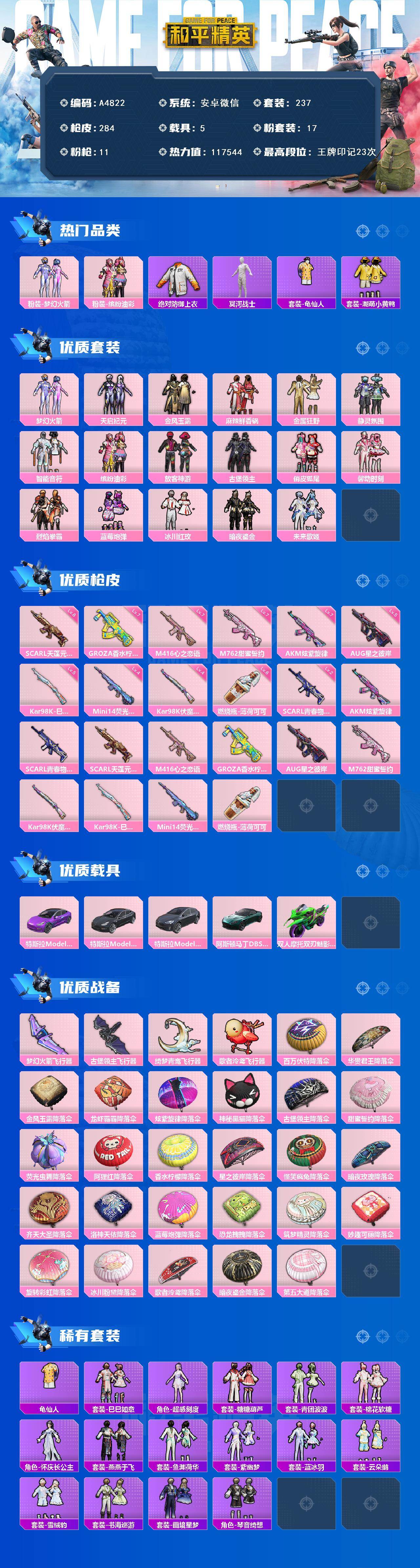 [16576299]安卓 【素材号 梦幻火箭/缤纷油彩/绝对防御上衣/冥河战士/放客神游/m416-心之恋语七级/akm-炫紫旋律七级/特斯拉model 3(奇幻紫)】微信-17粉装-11特效呛-5载具-4粉色飞行器-117544热力值-23王牌印记-237套装-284呛皮 【热门品类】:粉装-梦幻火箭,粉装-缤纷油彩,绝对防御上衣,套装-冥河战士,套装-龟仙人,套装-潮萌小黄鸭 【粉色套装】:粉装-梦幻火箭,粉装-天启纪元,粉装-金风玉露,粉装-麻辣鲜香锅,粉装-金属狂野,粉装-静灵氛围,粉装-智能音符,粉装-缤纷油彩,粉装-放客神游,粉装-古堡领主,粉装-俏皮狐尾,粉装-馨动时刻,粉装-烈焰拳霸,粉装-蓝莓炮弹,粉装-冰川红玫,粉装-暗夜鎏金,粉装-未来歌姬 【粉色呛皮等级】:akm-炫紫旋律七级,scar-l-青春物语二级,scar-l-天蓬元帅八级,m416-心之恋语七级,groza-香水柠檬七级,aug-星之彼岸五级,m762-甜蜜誓约七级,kar98k-伏魔团四级,kar98k-巳巳如意五级,mini14-荧光虫舞四级,燃烧瓶-薄荷可可六级 【粉色载具】:特斯拉model 3(奇幻紫),特斯拉model 3(冷光银),特斯拉model x(冷光银),阿斯顿马丁dbs(绿),双人摩托-双刃魅影(绿) 【粉色呛皮】:akm-炫紫旋律,scar-l-青春物语,scar-l-天蓬元帅,m416-心之恋语,groza-香水柠檬,aug-星之彼岸,m762-甜蜜誓约,kar98k-伏魔团,kar98k-巳巳如意,mini14-荧光虫舞,燃烧瓶-薄荷可可 【粉色飞行器】:梦幻火箭飞行器,古堡领主飞行器,绮梦青鸾飞行器,歌者泠鸢飞行器 【粉色降落伞】:百万伏特降落伞,华贵君王降落伞,金风玉露降落伞,龙虾霸霸降落伞,炫紫旋律降落伞,神秘黑猫降落伞,古堡领主降落伞,甜蜜誓约降落伞,荧光虫舞降落伞,阿狸红降落伞,香水柠檬降落伞,星之彼岸降落伞,怪笑疯兔降落伞,暗夜玫瑰降落伞,齐天大圣降落伞,洛神天依降落伞,蓝莓炮弹降落伞,恐龙拽拽降落伞,筑梦精灵降落伞,妙趣可丽降落伞,旋转彩虹降落伞,冰川粉黛降落伞,歌者泠鸢降落伞,暗夜鎏金降落伞,第五大道降落伞,炫彩糖果降落伞 【稀有套装】:套装-龟仙人,套装-巳巳如意,角色-超感刻度,套装-雪国风尚,套装