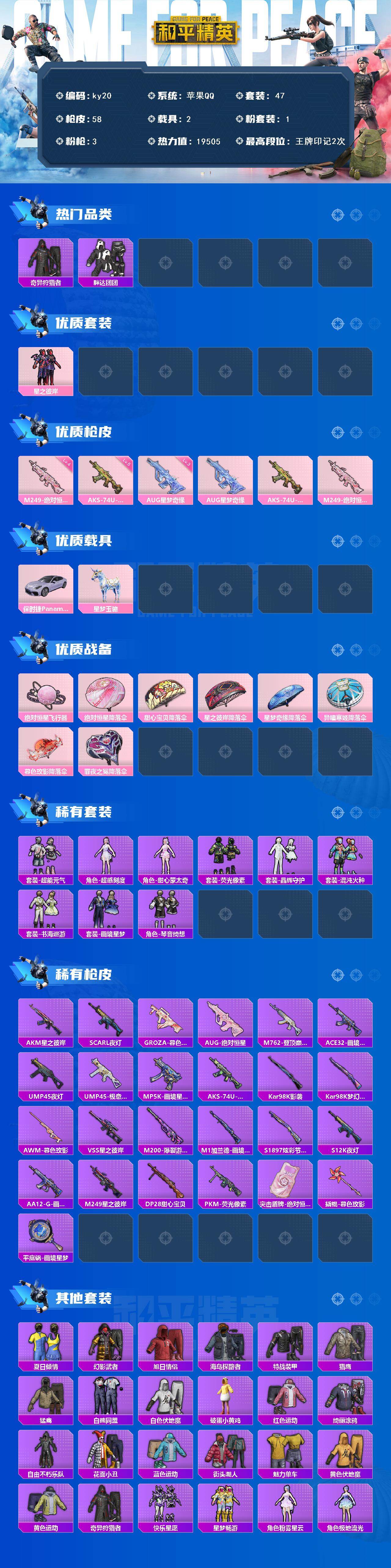 苹果 手q-1粉装-3特效呛-2载具-2粉色飞行器-19505热力值-2王牌印记-47套装-58呛皮 【热门品类】:套装-奇异狩猎者,套装-胖达团团 【粉色套装】:粉装-星之彼岸 【粉色呛皮等级】:aug-星梦奇缘三级,aks-74u-森灵之息五级,m249-绝对恒星四级 【粉色载具】:保时捷panamera(星辰紫),星梦玉骢 【粉色呛皮】:aug-星梦奇缘,aks-74u-森灵
