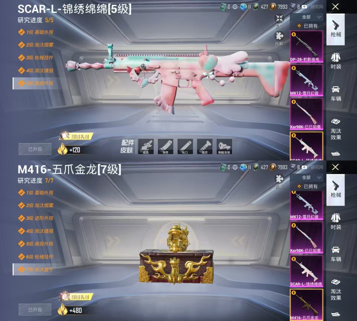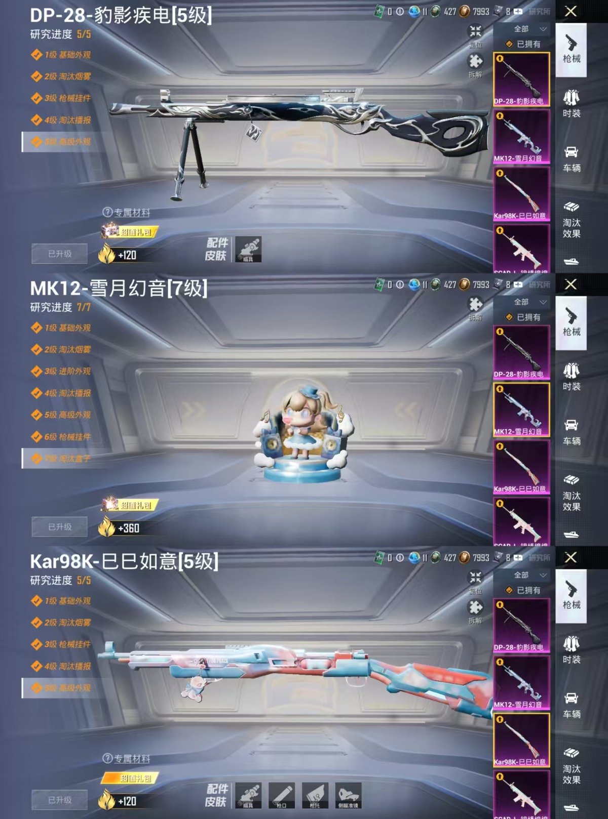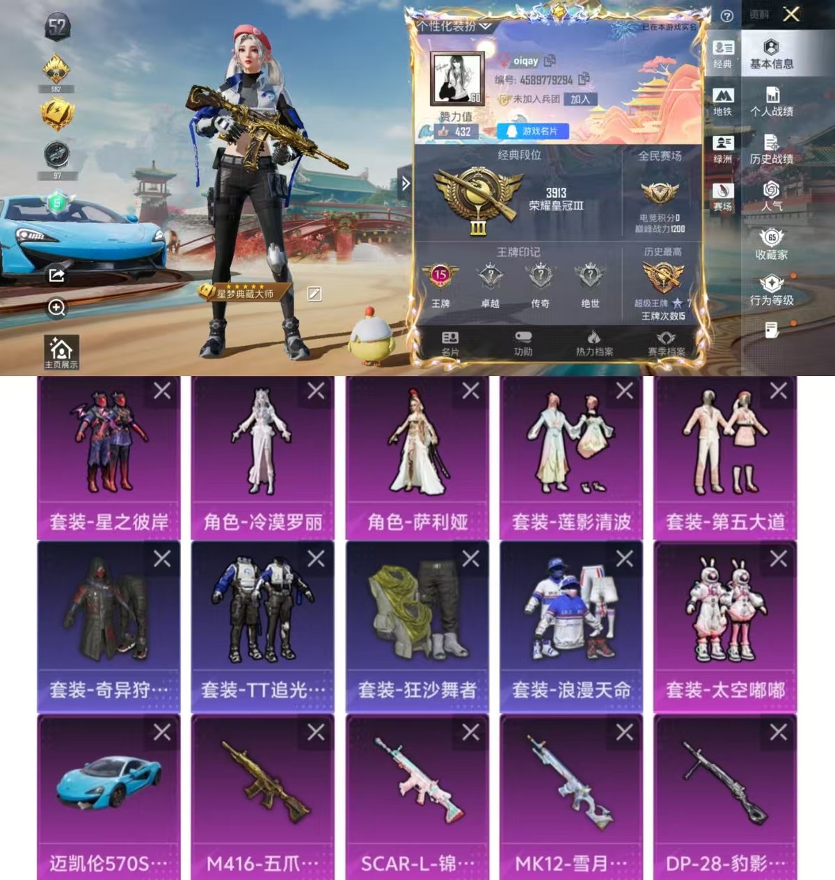 1载具-160套装-202呛皮-实名: 可修改 时装数: 614 载具数: 1 呛械数: 202 战备数: 180 热门装扮: 奇异狩猎者星之彼岸太空嘟嘟第五大道莲影清波萨利娅冷漠罗丽 载具: 迈凯伦570s天际蓝 稀有呛皮: m416五爪金龙scar-l-锦绣绵绵kar98k-巳巳如意mk12-雪月幻音dp-28-豹影疾电