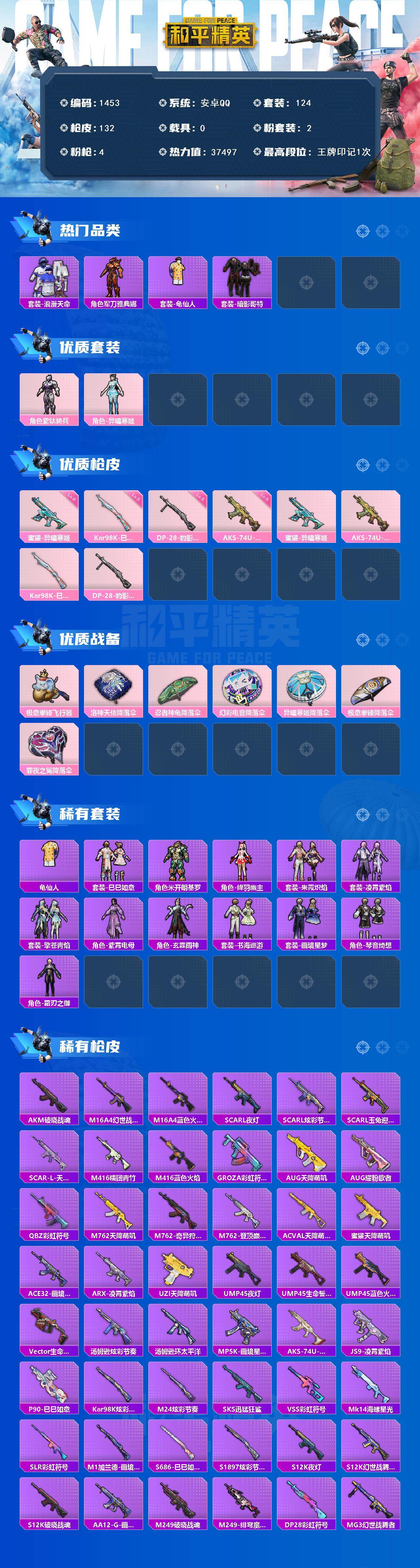 0载具-124套装-132呛皮-【1453】【连体王者猴子无双 无相】安卓 手q-2粉装-4特效呛-0载具-2粉色飞行器-37497热力值-1王牌印记-124套装-132呛皮 【热门品类】:套装-浪漫天命,角色-军刀雅典娜,套装-龟仙人,套装-暗影哥特 【粉色套装】:角色-紫钛骑兵,角色-异瞳寒姬 【粉色呛皮等级】:蜜獾-异瞳寒姬六级,aks-74u-森灵之息五级,kar98k-巳巳如意五级,dp-28-豹影疾电