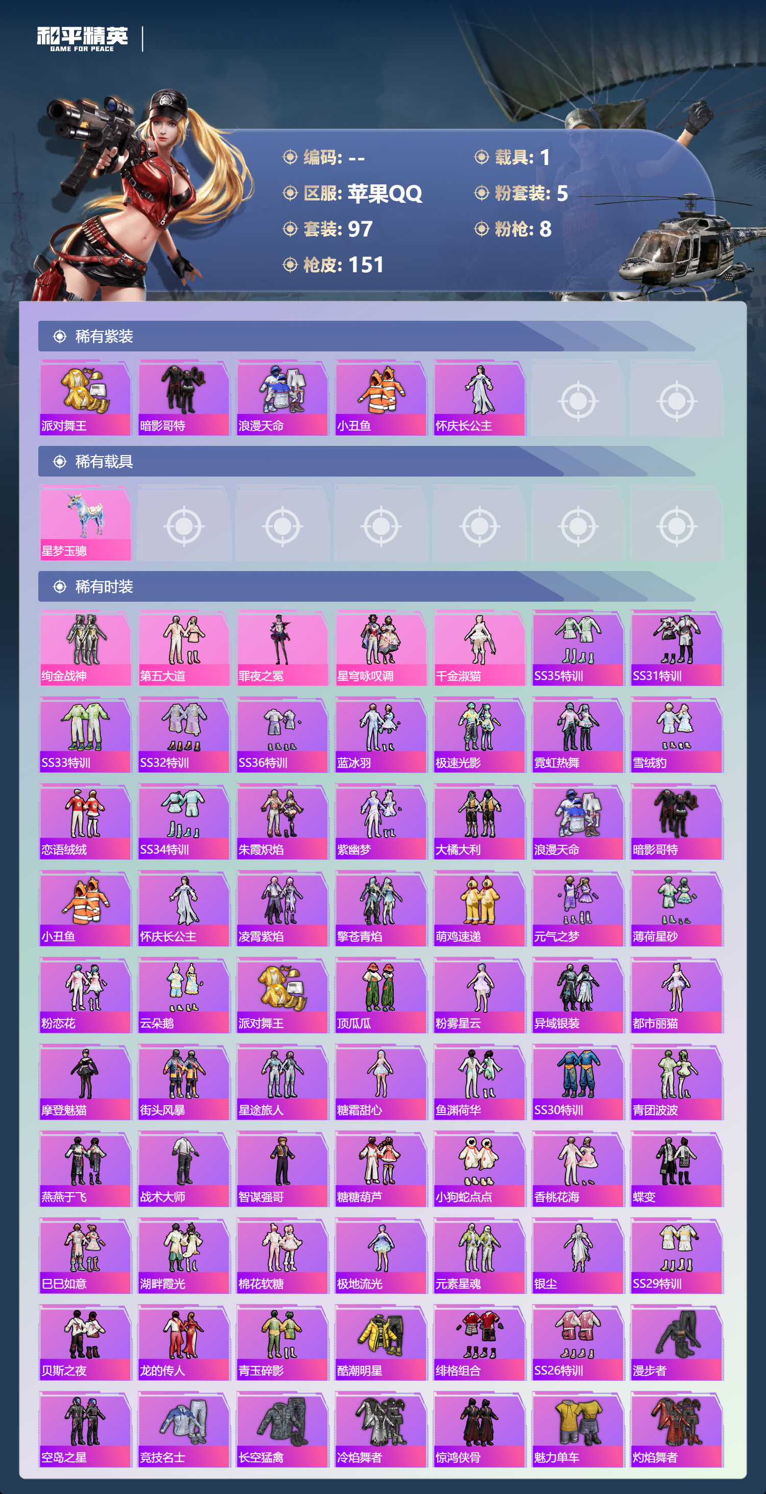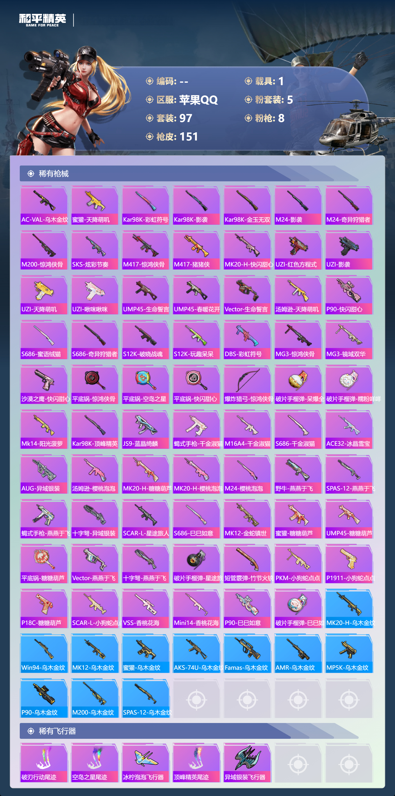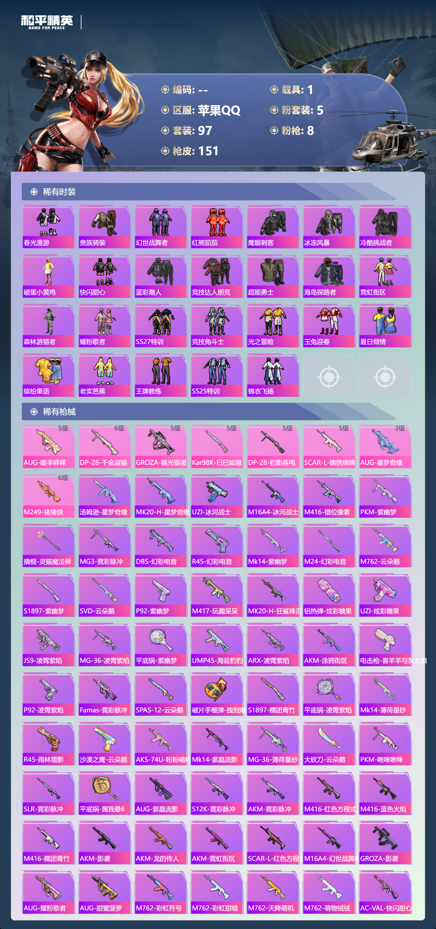 1载具-97套装-151呛皮-【哥特金鞋炫金战神aug星梦奇缘带马皮】苹果手q-8王牌印记-5粉装-8特效呛-1载具-45714热力值-97套装-151呛皮-3卓越印记-2传奇印记【5粉装】角色-千金淑猫套装-星穹咏叹调套装-第五大道套装-绚金战神角色-罪夜之冕【8特效呛】aug-暖羊咩咩/5级dp-28-千金淑猫/6级groza-镜光银凌/5级m249-猪猪侠/6级aug-星梦奇缘/3级k