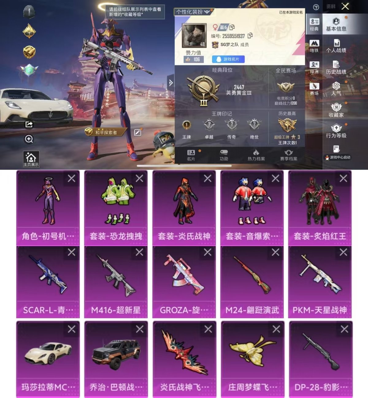 _2440017-实名:可修改时装数:330载具数:2呛械数:113战备数:78热门装扮:呆萌铁蟹炙焰红王恐龙拽拽音爆索尼克炎氏战神初号机觉醒ver.载具:玛莎拉蒂mc20星石白乔治·巴顿战车鎏金黑稀有呛皮:scar-l青春物语m24翩跹演武groza旋转彩虹pkm天星战神m416超新星kar98k-巳巳如意dp-28-豹影疾电