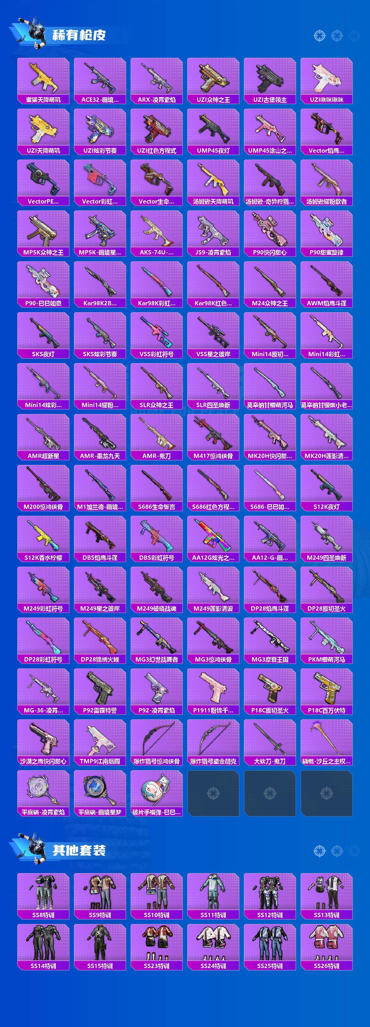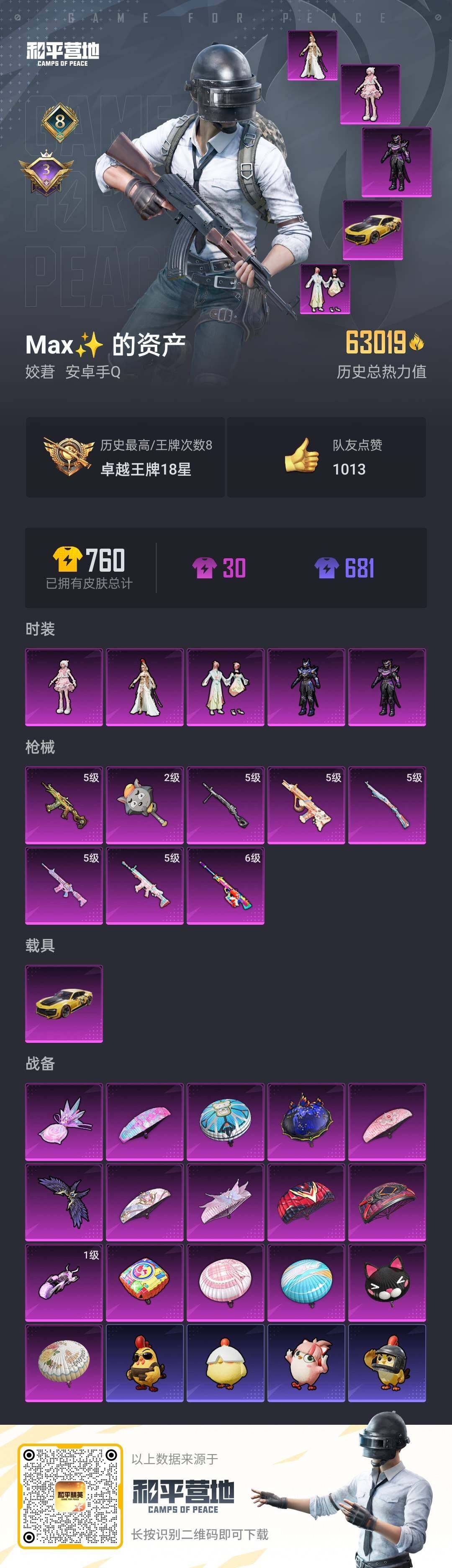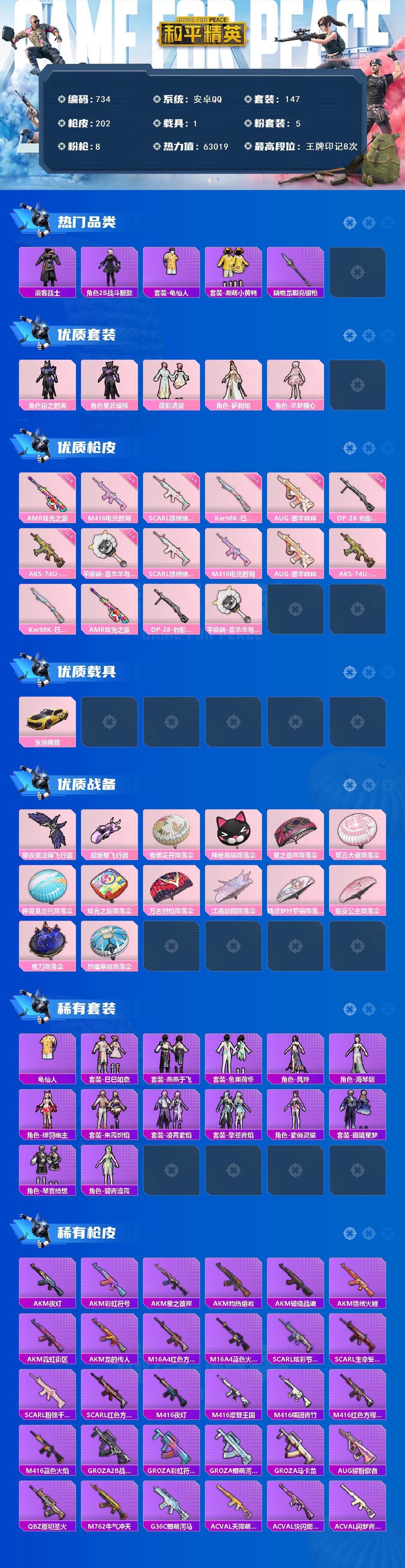 2440028手q-5粉装-8特效呛-1载具-3粉色飞行器-63019热力值-8王牌印记-147套装-202呛皮 天赋7 【热门品类】:套装-浪客战士,角色-2b战斗服款,套装-龟仙人,套装-潮萌小黄鸭,撬棍-龙胆亮银呛 【粉色套装】:角色-宙之时溯,角色-星云暗核,粉装-莲影清波,角色-萨利娅,角色-羊梦糖心 【粉色呛皮等级】:scar-l-锦绣绵绵五级,m416-电玩时刻五级