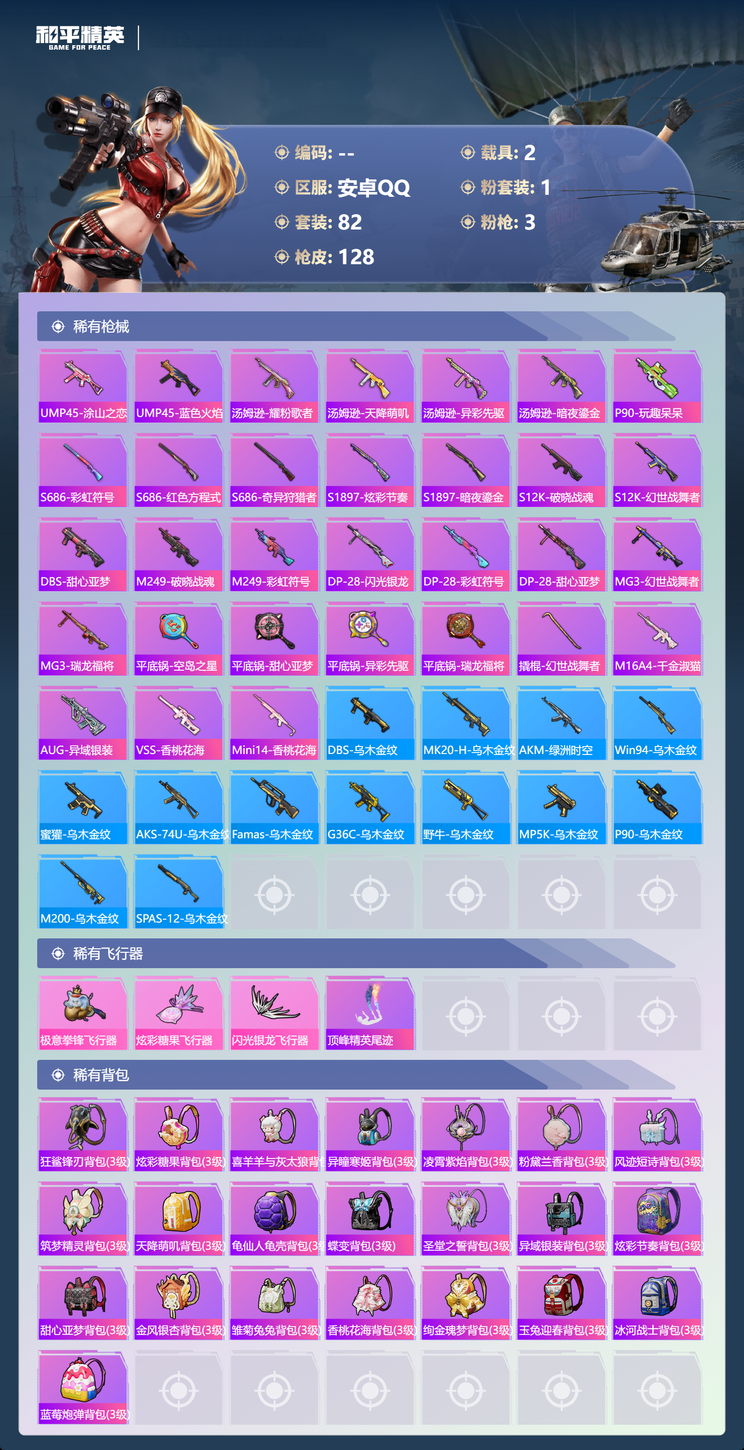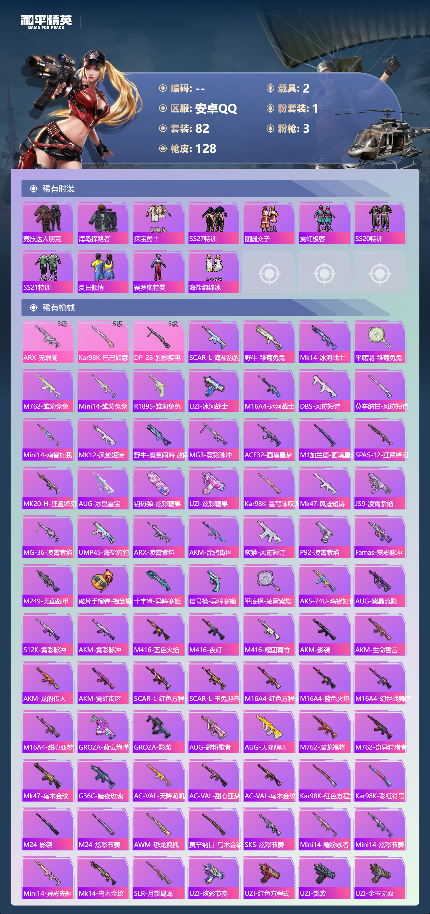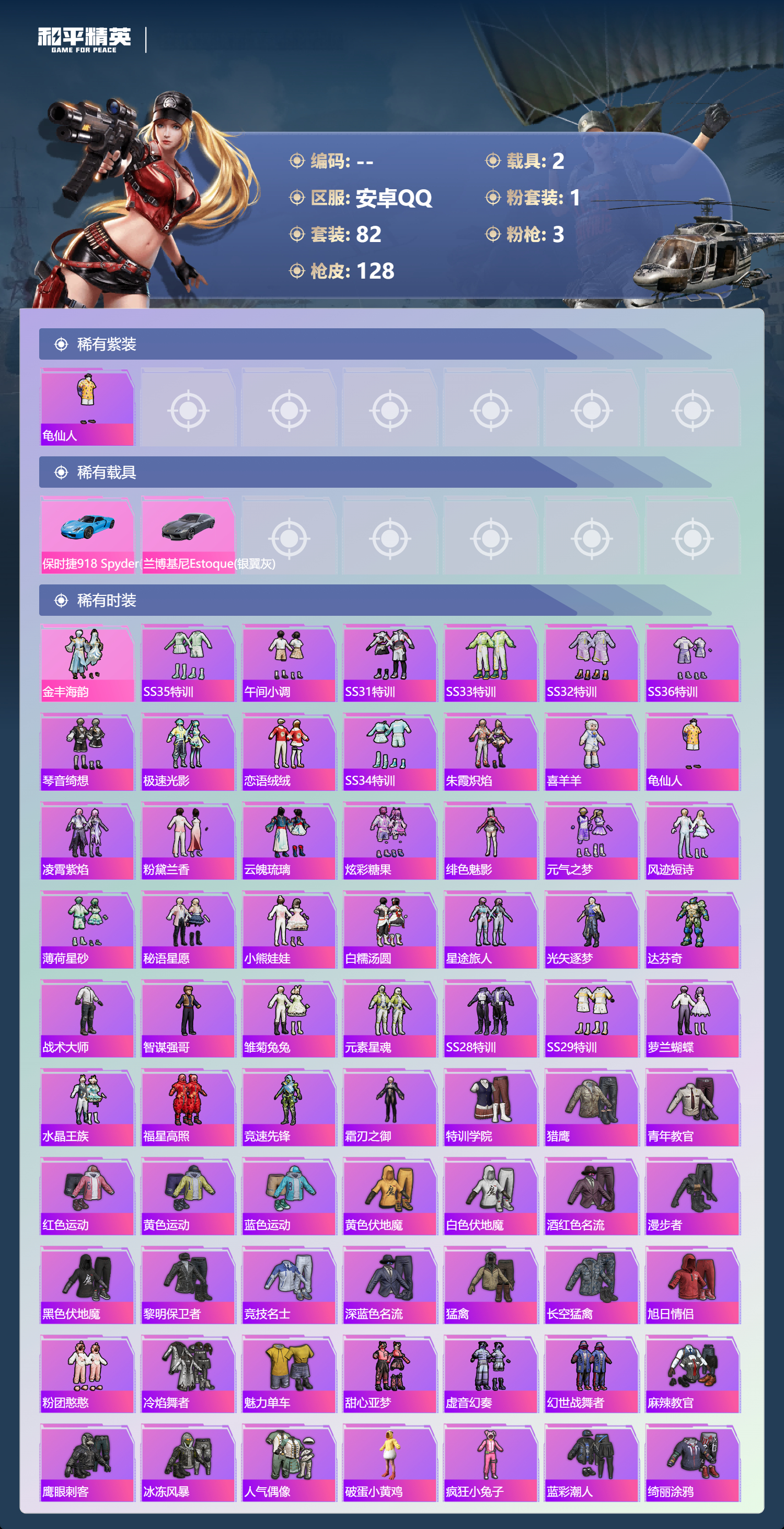 2载具-82套装-128呛皮-【 1粉3特效2载具 】安卓手q-2王牌印记-1粉装-3特效呛-2载具-37154热力值-82套装-128呛皮-1卓越印记【1粉装】套装-金丰海韵【3特效呛】kar98k-巳巳如意/5级dp-28-豹影疾电/5级arx-无垠阁/3级【1稀有紫装】龟仙人【2稀有载具】保时捷918 sper沉静蓝兰博基尼estoque银翼灰【81稀有时装】