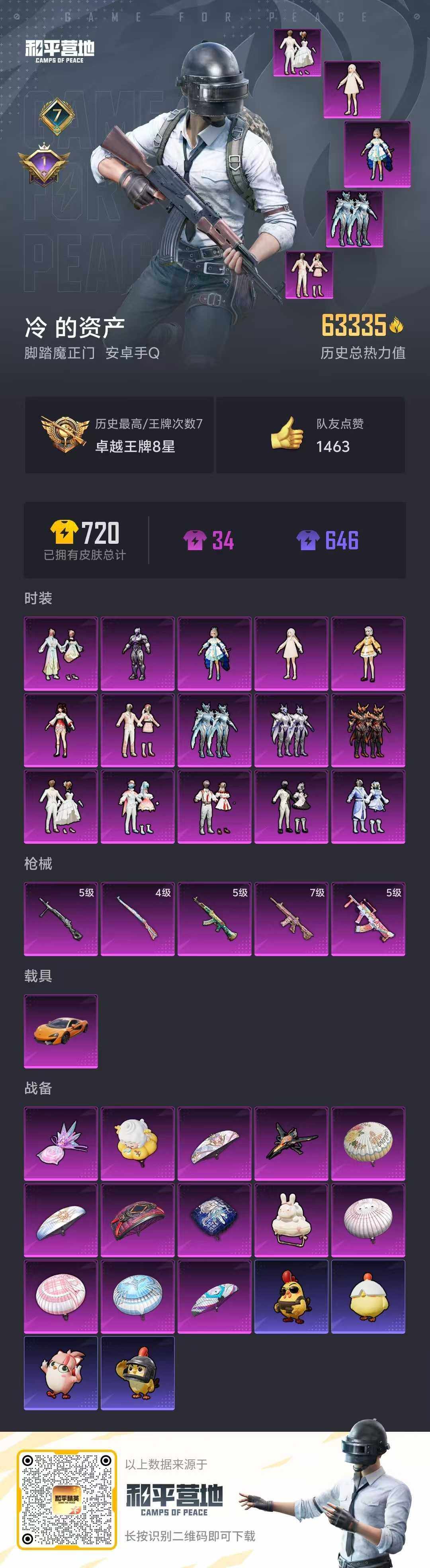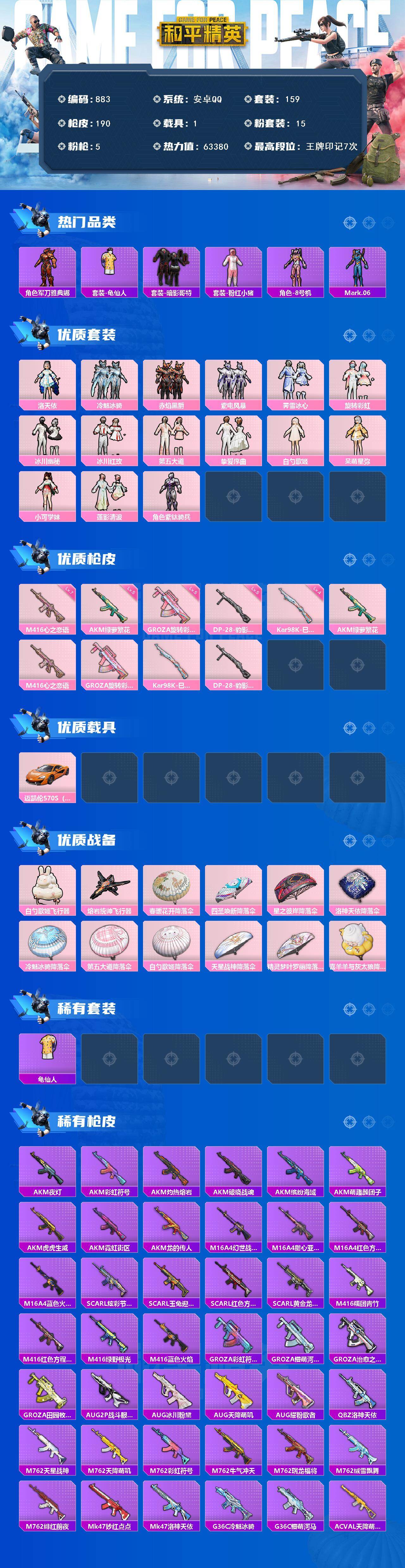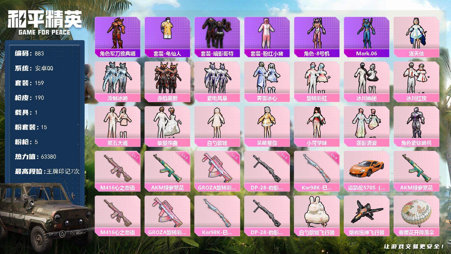 [16568969]安卓 手q-15粉装-5特效呛-1载具-3粉色飞行器-63380热力值-7王牌印记-159套装-190呛皮 【热门品类】:角色-军刀雅典娜,套装-龟仙人,套装-暗影哥特,套装-粉红小猪,角色-8号机,角色-mark.06 【粉色套装】:角色-洛天依,粉装-冷魅冰骑,粉装-赤焰黑爵,粉装-紫电风暴,粉装-霁雪冰心,粉装-旋转彩虹,粉装-冰川幽秘,粉装-冰川红玫,粉装-第五大道,粉装-挚爱序曲,角色-白勺歌姬,角色-呆萌星弥,角色-小可学妹,粉装-莲影清波,角色-紫钛骑兵 【粉色呛皮等级】:akm-绿萝繁花五级,m416-心之恋语七级,groza-旋转彩虹五级,kar98k-巳巳如意四级,dp-28-豹影疾电五级 【粉色载具】:迈凯伦570s(旭日黄) 【粉色呛皮】:akm-绿萝繁花,m416-心之恋语,groza-旋转彩虹,kar98k-巳巳如意,dp-28-豹影疾电 【粉色飞行器】:白勺歌姬飞行器,熔岩统帅飞行器 【粉色降落伞】:春暖花开降落伞,四圣焕新降落伞,星之彼岸降落伞,洛神天依降落伞,冷魅冰骑降落伞,第五大道降落伞,白勺歌姬降落伞,天星战神降落伞,精灵梦叶罗丽降落伞,喜羊羊与灰太狼降落伞 【稀有套装】:套装-龟仙人,套装-雪国风尚 【稀有呛皮】:akm-夜灯,akm-彩虹符号,akm-灼热熔岩,akm-破晓战魂,akm-缤纷海域,akm-萌趣颜团子,akm-虎虎生威,akm-霓虹街区,akm-龙的传人,m16a4-幻世战舞者,m16a4-甜心亚梦,m16a4-红色方程式,m16a4-蓝色火焰,scar-l-炫彩节奏,scar-l-玉兔迎春,scar-l-红色方程式,scar-l-黄金龙骨,m416-糯团青竹,m416-红色方程式,m416-绿野极光,m416-蓝色火焰,groza-彩虹符号,groza-懵萌河马,groza-治愈之星,groza-田园牧歌,aug-2p战斗服款,aug-冰川粉黛,aug-天降萌叽,aug-耀粉歌者,q-洛神天依,m762-天星战神,m762-天降萌叽,m762-彩虹符号,m762-牛气冲天,m762-瑞龙福将,m762-绒雪飘舞,m762-绯红前夜,mk47-妙红点点,mk47-洛神天依,g36c-冷魅冰骑,g36c-懵萌河马,ac-val-天降萌叽,ac-val-彩虹甜喵,ac-val-快闪甜心,a
