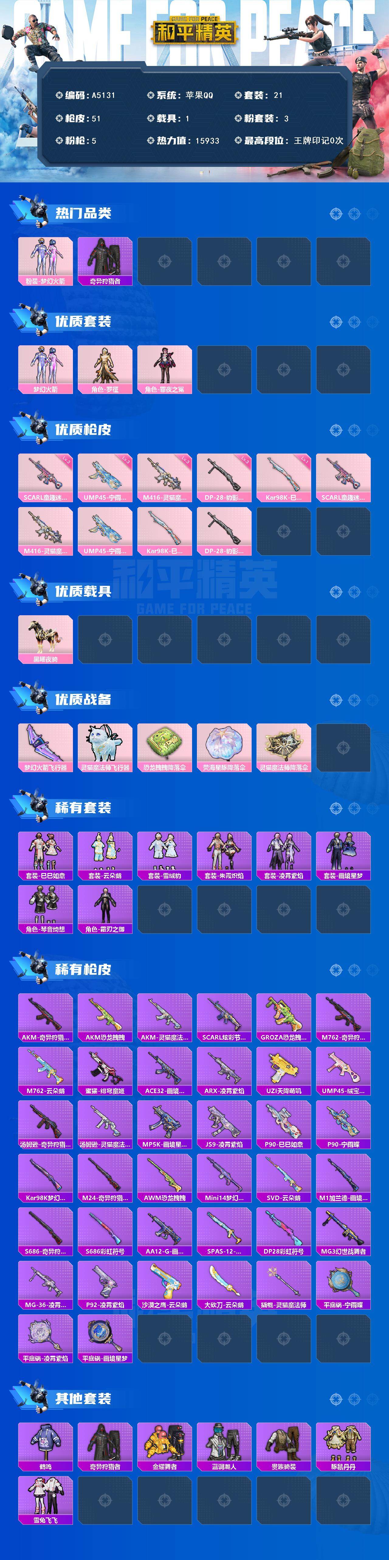 [16567504]苹果 【男神号 梦幻火箭/奇异狩猎者/m416-灵猫魔法师三级/黑曜夜骑】手q-3粉装-5特效呛-1载具-3粉色飞行器-15933热力值-2王牌印记-21套装-51呛皮 【热门品类】:粉装-梦幻火箭,套装-奇异狩猎者 【粉色套装】:粉装-梦幻火箭,角色-罗征,角色-罪夜之冕 【粉色呛皮等级】:scar-l-童趣迷兔三级,m416-灵猫魔法师三级,ump45-宁雨蝶三级,kar98k-巳巳如意一级,dp-28-豹影疾电三级 【粉色载具】:黑曜夜骑 【粉色呛皮】:scar-l-童趣迷兔,m416-灵猫魔法师,ump45-宁雨蝶,kar98k-巳巳如意,dp-28-豹影疾电 【粉色飞行器】:梦幻火箭飞行器,灵猫魔法师飞行器 【粉色降落伞】:恐龙拽拽降落伞,荧海星豚降落伞,灵猫魔法师降落伞 【稀有套装】:套装-巳巳如意,套装-云朵鹅,套装-雪绒豹,套装-朱霞炽焰,套装-凌霄紫焰,套装-画境星梦,套装-琴音绮想,角色-霜刃之御 【稀有呛皮】:akm-奇异狩猎者,akm-恐龙拽拽,akm-灵猫魔法师,scar-l-炫彩节奏,groza-恐龙拽拽,m762-奇异狩猎者,m762-云朵鹅,蜜獾-绯穹魔姬,ace32-画境星梦,arx-凌霄紫焰,uzi-天降萌叽,ump45-绒宝小鹅,汤姆逊-奇异狩猎者,汤姆逊-灵猫魔法师,mp5k-画境星梦,js9-凌霄紫焰,p90-宁雨蝶,p90-巳巳如意,kar98k-梦幻火箭,m24-奇异狩猎者,awm-恐龙拽拽,mini14-梦幻火箭,svd-云朵鹅,m1加兰德-画境星梦,s686-奇异狩猎者,s686-彩虹符号,aa12-g-画境星梦,spas-12-云朵鹅,dp-28-彩虹符号,mg3-幻世战舞者,mg-36-凌霄紫焰,p92-凌霄紫焰,沙墨之鹦-云朵鹅,大砍刀-云朵鹅,撬棍-灵猫魔法师,平底锅-宁雨蝶,平底锅-凌霄紫焰,平底锅-画境星梦 【其他套装】:套装-鹤鸣,套装-奇异狩猎者,套装-金耀舞者,套装-蓝调潮人,套装-贵族骑装,套装-豚鼠丹丹,套装-雪兔飞飞 【稀有头盔】:梦幻火箭头盔3级,梦幻火箭头盔2级,梦幻火箭头盔1级 【稀有背包】:梦幻火箭背包3级,梦幻火箭背包2级,梦幻火箭背包1级 【营地id】:1038220932