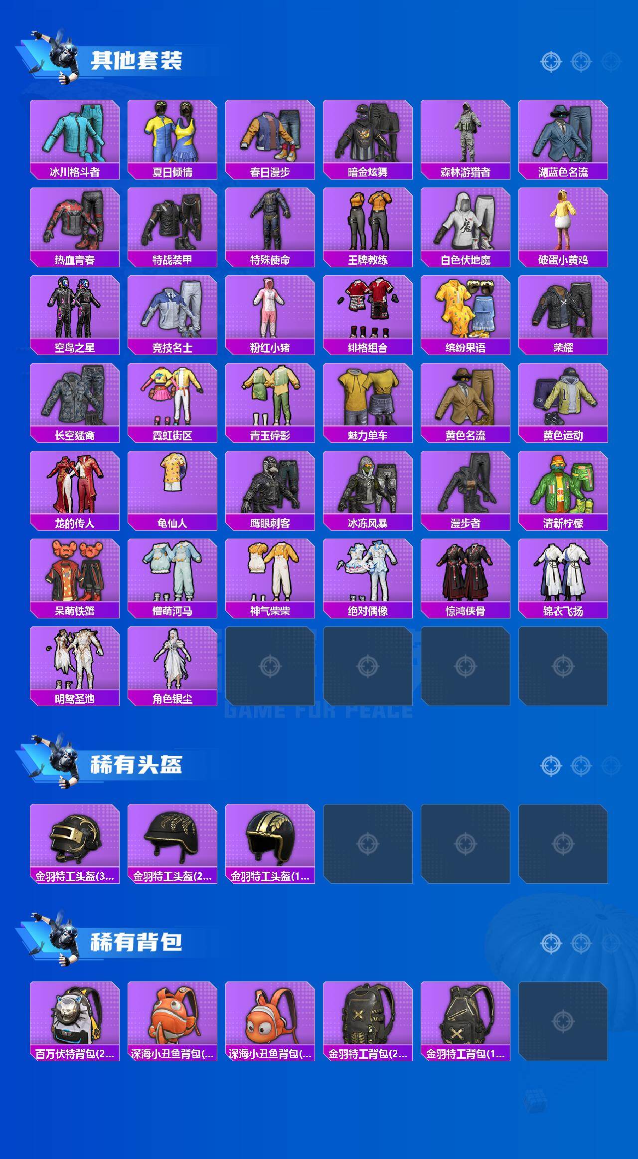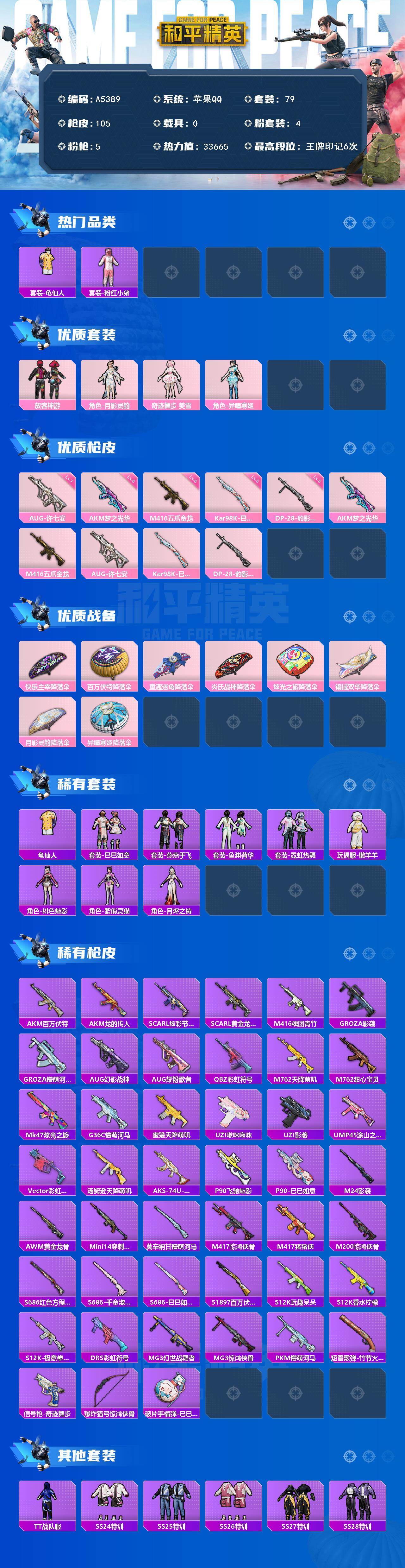 [16267749]苹果【男神号 套装-龟仙人/粉装-放客神游/aug-许七安七级/akm-梦之光华六级/m416-五爪金龙六级/】 手q-4粉装-5特效呛-0载具-1粉色飞行器-33665热力值-6王牌印记-79套装-105呛皮 【热门品类】:套装-龟仙人,套装-粉红小猪 【粉色套装】:粉装-放客神游,角色-月影灵韵,角色-奇迹舞步 美雪,角色-异瞳寒姬 【粉色呛皮等级】:akm-梦之光华六级,m416-五爪金龙六级,aug-许七安七级,kar98k-巳巳如意五级,dp-28-豹影疾电五级 【粉色呛皮】:akm-梦之光华,m416-五爪金龙,aug-许七安,kar98k-巳巳如意,dp-28-豹影疾电 【粉色降落伞】:快乐主宰降落伞,百万伏特降落伞,童趣迷兔降落伞,炎氏战神降落伞,炫光之旅降落伞,镜域双华降落伞,月影灵韵降落伞,异瞳寒姬降落伞,炫彩糖果降落伞 【稀有套装】:套装-龟仙人,套装-巳巳如意,套装-雪国风尚,套装-炫彩糖果,套装-燕燕于飞,套装-鱼渊荷华,套装-霓虹热舞,玩偶服-懒羊羊,角色-绯色魅影,角色-紫俏灵猫,角色-月烬之祷 【稀有呛皮】:aug-冰晶雪宝,akm-百万伏特,akm-龙的传人,scar-l-炫彩节奏,scar-l-黄金龙骨,m416-糯团青竹,groza-影袭,groza-懵萌河马,aug-幻影战神,aug-耀粉歌者,q-彩虹符号,m762-天降萌叽,m762-甜心宝贝,mk47-炫光之旅,g36c-懵萌河马,蜜獾-天降萌叽,uzi-啾咪啾咪,uzi-影袭,ump45-涂山之恋,vect-彩虹符号,汤姆逊-天降萌叽,aks-74u-鬼刀,p90-飞驰魅影,p90-巳巳如意,m24-影袭,awm-黄金龙骨,mini14-穿刺龙虾,莫辛纳甘-懵萌河马,m417-惊鸿侠骨,m417-猪猪侠,m200-惊鸿侠骨,s686-红色方程式,s686-巳巳如意,s686-千金淑猫,s1897-百万伏特,s12k-玩趣呆呆,s12k-香水柠檬,s12k-极意拳锋,dbs-彩虹符号,mg3-幻世战舞者,mg3-惊鸿侠骨,pkm-懵萌河马,短管霰弹-竹节火铳,信号呛-奇迹舞步,爆炸猎弓-惊鸿侠骨,破片手留单-巳巳如意 【其他套装】:套装-tt战队服,套装-ss24特训,套装-ss25特训,套装-ss26特训,套装-ss27特训,套