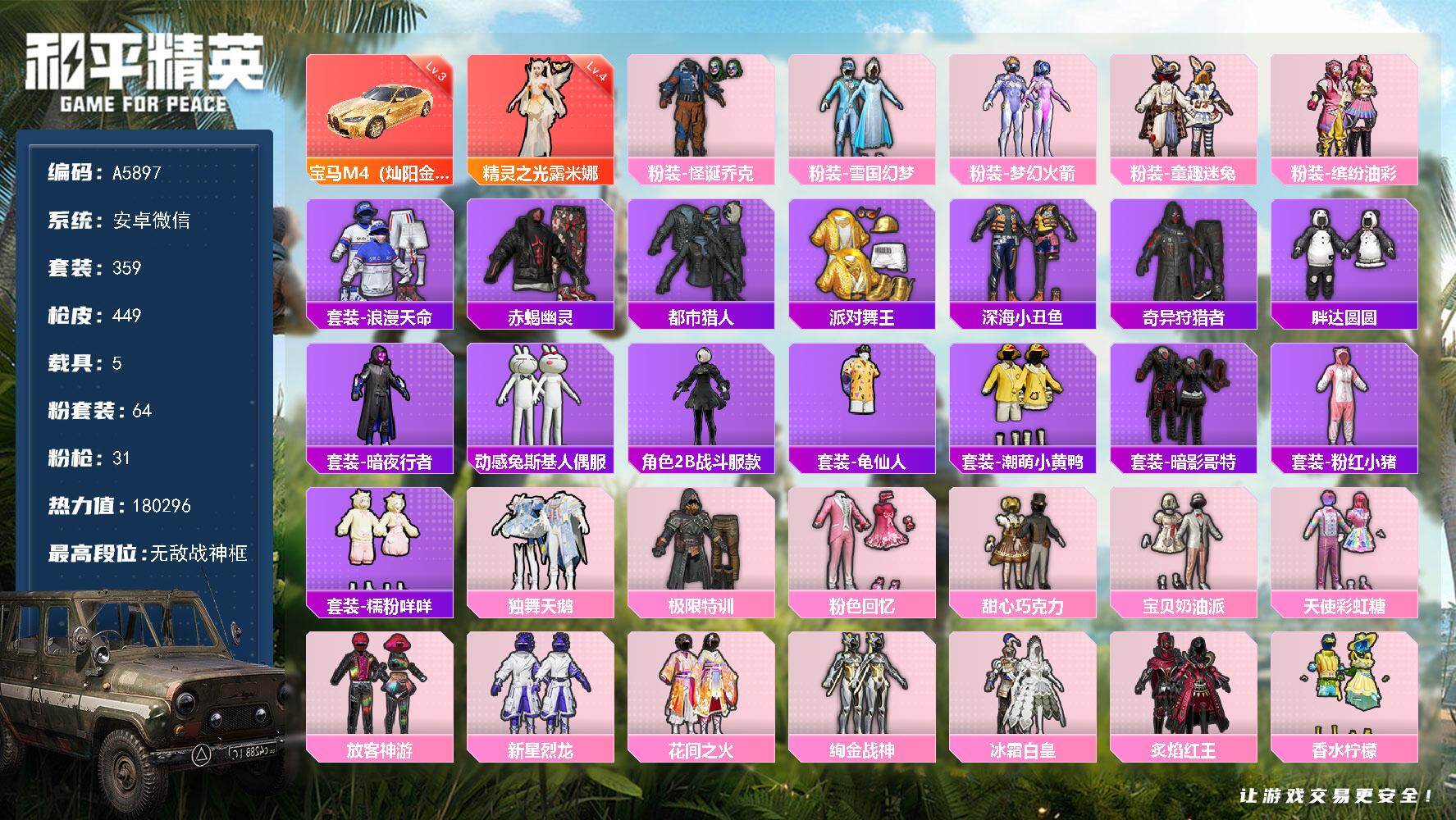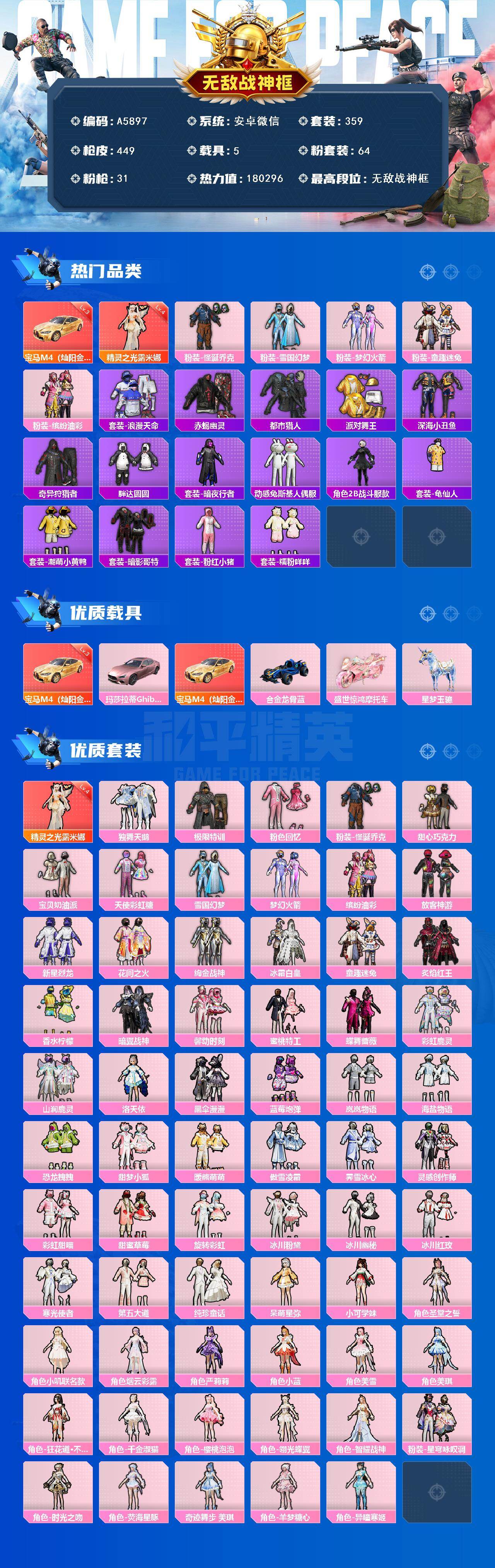 [16316039]安卓 【质量红装公主号/19王牌印记/精灵之光-露米娜四级/粉装-怪诞乔克/粉装-雪国幻梦/粉装-梦幻火箭/粉装-童趣迷兔/粉装-缤纷油彩/套装-浪漫天命/套装-赤蝎幽灵/套装-都市猎人/套装-派对舞王/套装-深海小丑鱼/套装-奇异狩猎者/套装-胖达圆圆/套装-暗夜行者/套装-动感兔斯基人偶服/角色-2b战斗服款/套装-龟仙人/套装-潮萌小黄鸭/套装-暗影哥特/套装-粉红小猪/套装-糯粉咩咩/宝马m4(灿阳金)三级/玛莎拉蒂ghibli(粉)/宝马m4(灿阳金)/合金龙骨(蓝)/盛世惊鸿摩托车/星梦玉骢/1神装-64粉装-31特效呛-5载具-15粉色飞行器-180296热力值】微信-无敌战神框-1神装-64粉装-31特效呛-5载具-15粉色飞行器-180296热力值-19王牌印记-359套装-449呛皮 【红色载具】:宝马m4(灿阳金)三级 【红色神装等级】:精灵之光-露米娜四级 【红色角色神装】:精灵之光-露米娜 【热门品类】:粉装-怪诞乔克,粉装-雪国幻梦,粉装-梦幻火箭,粉装-童趣迷兔,粉装-缤纷油彩,套装-浪漫天命,套装-赤蝎幽灵,套装-都市猎人,套装-派对舞王,套装-深海小丑鱼,套装-奇异狩猎者,套装-胖达圆圆,套装-暗夜行者,套装-动感兔斯基人偶服,角色-2b战斗服款,套装-龟仙人,套装-潮萌小黄鸭,套装-暗影哥特,套装-粉红小猪,套装-糯粉咩咩 【粉色套装】:粉装-独舞天鹅,粉装-极限特训,粉装-粉色回忆,粉装-怪诞乔克,粉装-甜心巧克力,粉装-宝贝奶油派,粉装-天使彩虹糖,粉装-雪国幻梦,粉装-梦幻火箭,粉装-缤纷油彩,粉装-放客神游,粉装-新星烈龙,粉装-花间之火,粉装-绚金战神,粉装-冰霜白皇,粉装-童趣迷兔,粉装-炙焰红王,粉装-香水柠檬,粉装-暗翼战神,粉装-馨动时刻,粉装-蜜桃特工,粉装-蝶舞蔷薇,粉装-彩虹鹿灵,粉装-山涧鹿灵,角色-洛天依,粉装-黑伞漫漫,粉装-蓝莓炮弹,粉装-岚岚物语,粉装-海盐物语,粉装-恐龙拽拽,粉装-甜梦小狐,粉装-暖熊萌萌,粉装-傲雪凌霜,粉装-霁雪冰心,粉装-灵感创作师,粉装-彩虹甜喵,粉装-甜蜜草莓,粉装-旋转彩虹,粉装-冰川粉黛,粉装-冰川幽秘,粉装-冰川红玫,粉装-寒光使者,粉装-第五大道,粉装-纯珍童话,角色-呆萌星弥,角色-小可学妹,角色-圣堂之誓,角色-小叽联名款,角色-烟云彩露