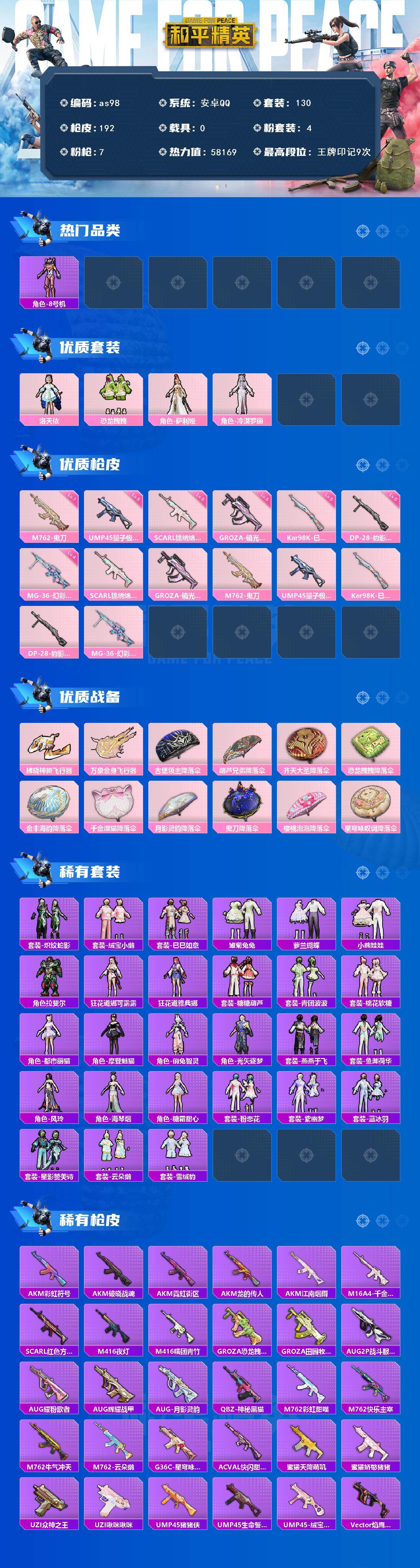 0载具-130套装-192呛皮-安卓 手q-4粉装-7特效呛-0载具-2粉色飞行器-58169热力值-9王牌印记-130套装-192呛皮 【热门品类】:角色-8号机 【粉色套装】:角色-洛天依,粉装-恐龙拽拽,角色-萨利娅,角色-冷漠罗丽 【粉色呛皮等级】:scar-l-锦绣绵绵五级,groza-镜光银凌五级,m762-鬼刀七级,ump45-量子极限五级,kar98k-巳巳如意五级,dp-28-豹影疾电