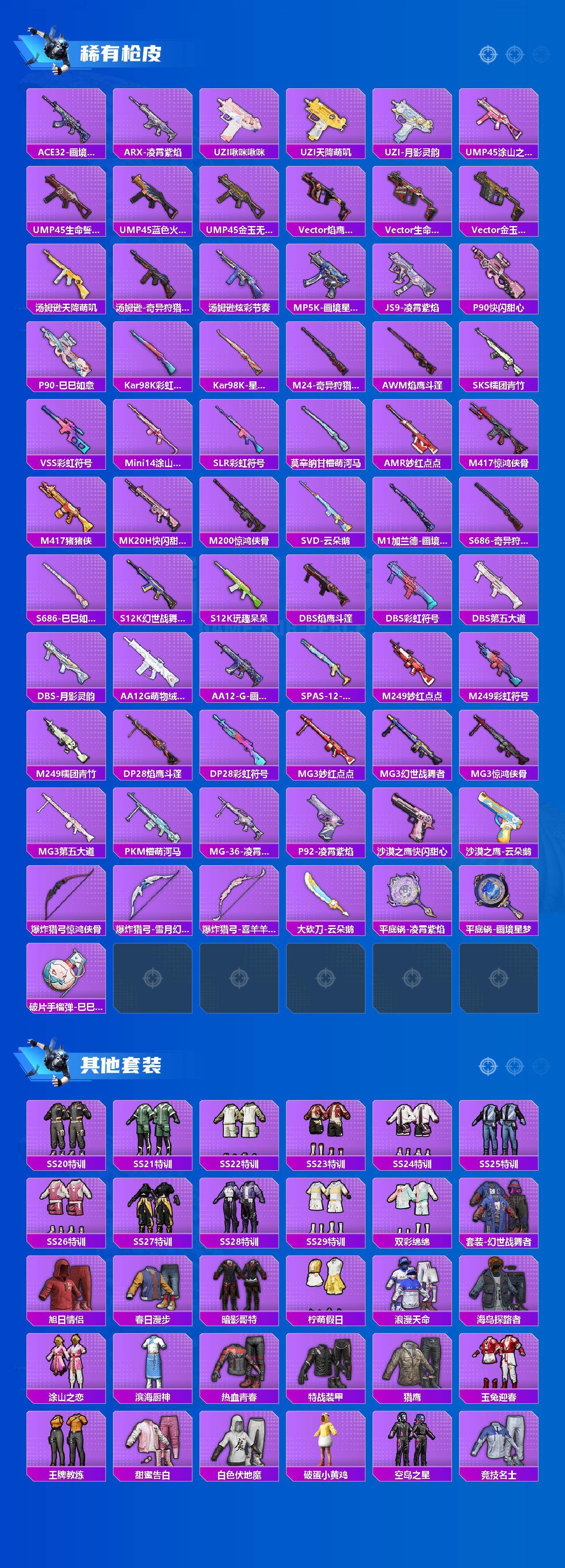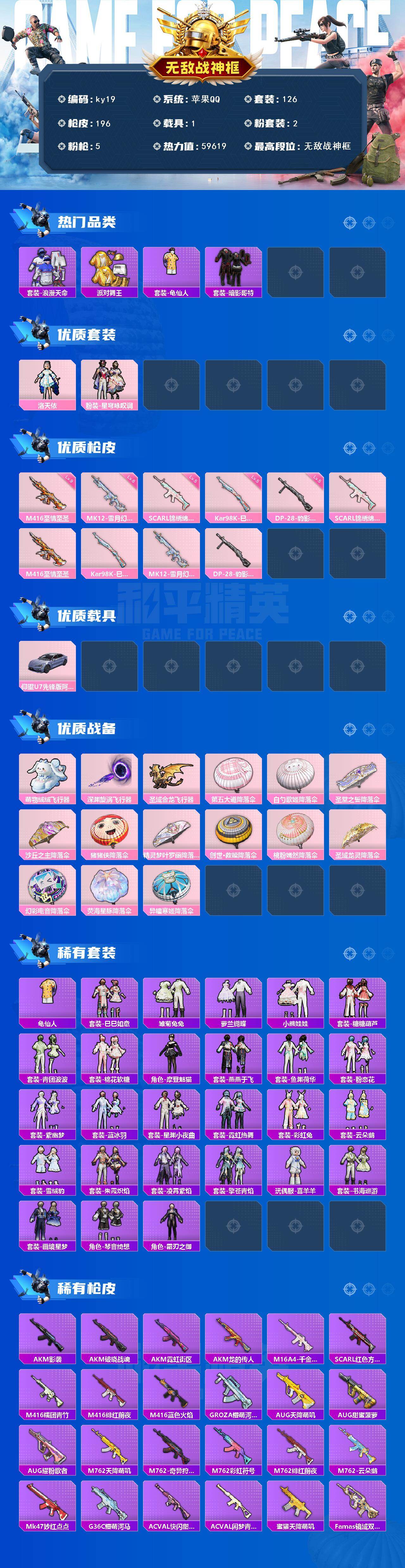 1载具-126套装-196呛皮-苹果 手q-无敌战神框-2粉装-5特效呛-1载具-3粉色飞行器-59619热力值-17王牌印记-126套装-196呛皮 【热门品类】:套装-浪漫天命,套装-派对舞王,套装-龟仙人,套装-暗影哥特 【粉色套装】:角色-洛天依,粉装-星穹咏叹调 【粉色呛皮等级】:scar-l-锦绣绵绵五级,m416-至情至圣九级,kar98k-巳巳如意五级,12-雪月幻音六级,dp-28-豹影