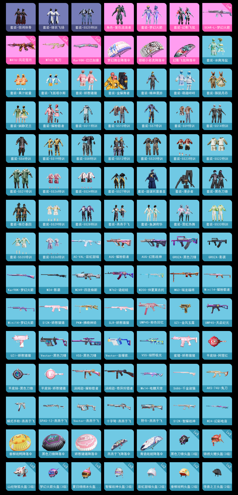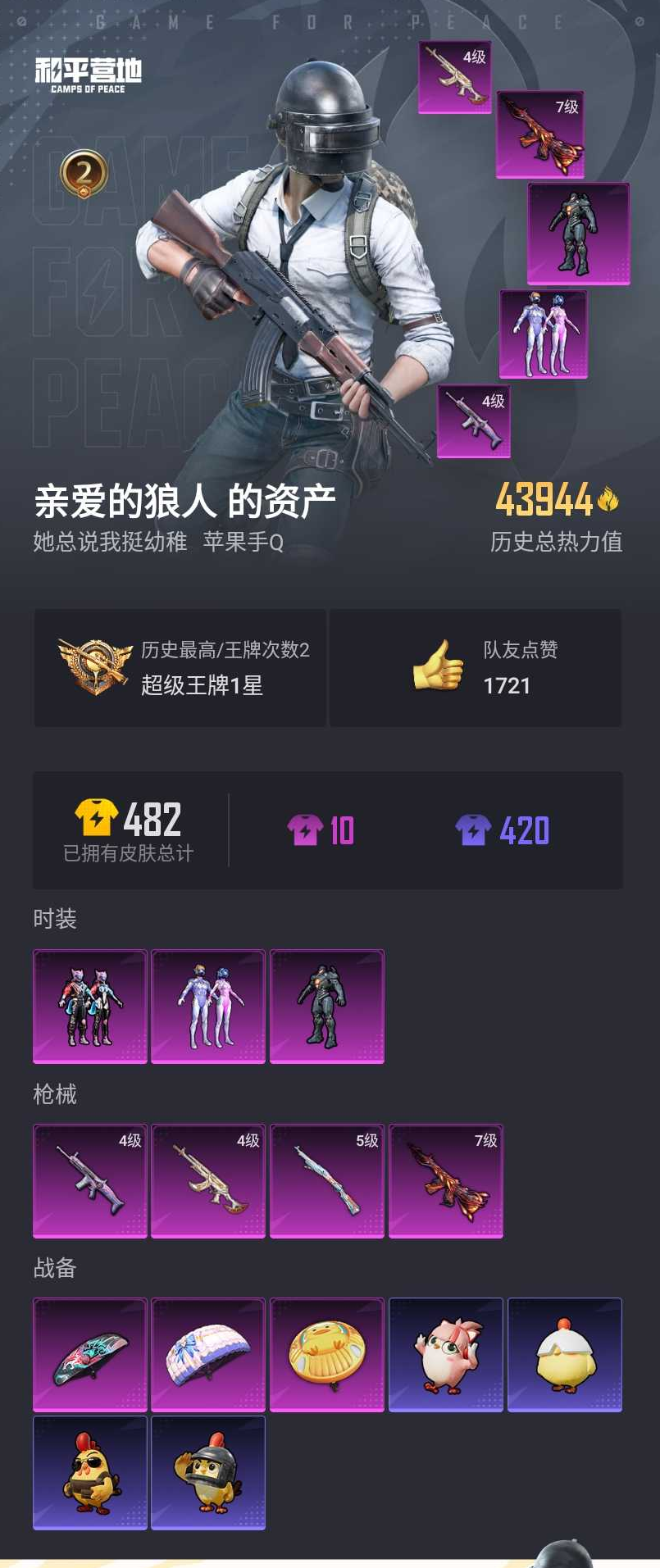 【和平精英】【lyhp21877】3粉装,4特效呛,0载具,历史最高段位:超级王牌1星 王牌印记2次 热力值:43944,125套装,136呛械,124装备,69战备;套装:套装-梦幻火箭,角色-复仇流浪者,套装-幻影飞狐,套装-特训学院,套装-猎鹰,套装-白色伏地魔,套装-黑色伏地魔,套装-骑行爱好者,套装-竞技名士,套装-深蓝色名流,套装-酒红色名流,套装-湖蓝色名流,套装-黄色名流,套装-猛禽,套装-伏击者,套装-长空猛禽,套装-漫步者,套装-竞技勇士朋克,套装-雪鹰学院,套装-冷焰舞者,套装-灼焰舞者,套装-刚毅裁决者,套装-战地菁英,套装-战地督导,套装-特殊使命,套装-甜蜜告白,套装-龙腾端午,套装-完美偶像,套装-人气偶像,套装-幻影武者,套装-特战英豪,套装-街头潮人,套装-蓝彩潮人,套装-怒火燎原,套装-决胜时刻,套装-魅力单车,套装-绮丽涂鸦,套装-耀眼新星,套装-夜莺强袭者,套装-都市漫游者,套装-破晓战魂,套装-森林游猎者,套装-都市魅力,套装-热血青春,套装-沙漠兵团,套装-丛林猎人,套装-雪山精英,套装-幻世战舞者,套装-金耀舞者,套装-夏日倾情,套装-缤纷果语,套装-冰川特警,套装-极速红龙,套装-麻辣教官,套装-破蛋小黄鸡,套装-疯狂小兔子,套装-ss5特训,套装-圣诞大吉,套装-金鼠迎春,套装-军械专家,套装-北国孤狼,套装-ss6特训,套装-跃动心情,套装-ss7特训,套装-黑色刀锋,套装-核芯基因,套装-精神漫游,套装-鹤鸣,套装-霓虹街区,套装-ss10特训,套装-ss8特训,套装-萌黄之夏,套装-夏日音浪,套装-ss9特训,套装-牛气满满,套装-ss11特训,套装-诡谋托雷基亚,套装-娴静芝兰,套装-战术大师,套装-ss12特训,套装-牛气冲天,套装-耀粉歌者,套装-冰爽海盐,套装-ss14特训,套装-吉莉礼服,套装-豚鼠丹丹,套装-ss19特训,套装-ss20特训,套装-ss21特训,套装-萌趣咩咩,套装-娇憨猪猪,套装-玉兔迎春,套装-ss22特训,套装-ss23特训,套装-飞狐塔尔斯,套装-柠萌假日,套装-ss24特训,套装-龟仙人,套装-ss25特训,套装-惊鸿侠骨,套装-锦衣飞扬,套装-果汁能量,套装-龙的传人,套装-ss26特训,套装-ss27特训,套装-恋语绒绒,套装-ss28特训,套装-海盐绵绵冰,套装-蝶变,套装-ss29特训,套装-星途旅人,套装-ss30特训,套装-ss31特训,套装-鱼渊荷华,套装-燕燕于飞,套装-智谋强哥,套装-ss33特训,套装-巳巳如意,套装-ss32特训,套装-顶瓜瓜,套装-大橘大利,套装-霓虹热舞,套装-ss34特训,套装-ss35特训,套装-ss36特训;呛皮:4级scar-l-梦幻火箭,scar-l-红色方程式,scar-l-黄金龙骨,scar-l-炫彩节奏,scar-l-玉兔迎春,4级m762-鬼刀,m762-诡娃娃,m762-牛气冲天,m762-天降萌叽,m762-乌木金纹,7级m416-风花雪月,m416-夜灯,m416-蓝色火焰,m416-糯团青竹,akm-灼热熔岩,akm-破晓战魂,akm-霓虹街区,akm-夜灯,akm-龙的传人,akm-霓彩脉冲,akm-乌木金纹,m16a4-红色方程式,m16a4-幻世战舞者,q-彩虹符号,q-乌木金纹,aug-幻影战神,aug-耀粉歌者,aug-天降萌叽,aug-异域银装,aug-乌木金纹,famas-霓彩脉冲,famas-乌木金纹,groza-影袭,groza-生命誓言,groza-黑色刀锋,groza-乌木金纹,ac-val-乌木金纹,ac-val-彩虹甜喵,ac-val-天降萌叽,蜜獾-娇憨猪猪,蜜獾-乌木金纹,mk47-乌木金纹,amr-乌木金纹,5级kar98k-巳巳如意,kar98k-王子的夏天,kar98k-梦幻火箭,kar98k-炫彩节奏,win94-乌木金纹,m24-影袭,m24-幻彩电音,m24-乌木金纹,m200-仲夏莫吉托,m200-惊鸿侠骨,m200-乌木金纹,莫辛纳甘-乌木金纹,awm-乌木金纹,m417-惊鸿侠骨,mk14-乌木金纹,mk14-冰河战士,mk14-电糖天使,mini14-金鼠迎春,mini14-梦幻火箭,mini14-炫彩节奏,mini14-耀粉歌者,mini14-香桃花海,mini14-乌木金纹,sks-夜灯,sks-炫彩节奏,vss-黑色刀锋,vss-绿野极光,vss-乌木金纹,slr-娇憨猪猪,mk20-h-乌木金纹,p90-巳巳如意,p90-乌木金纹,vect-生命誓言,vect-黑色刀锋,vect-彩虹符号,vect-音爆索尼克,vect-燕燕于飞,vect-乌木金纹,aks-74u-鬼刀,aks-74u-乌木金纹,uzi-红色方程式,uzi-金风玉露,uzi-娇憨猪猪,uzi-天降萌叽,uzi-冰河战士,mp5k-乌木金纹,ump45-夜灯,ump45-生命誓言,ump45-粉色回忆,ump45-天启纪元,野牛-燕燕于飞,汤姆逊-奇异狩猎者,汤姆逊-耀粉歌者,汤姆逊-天降萌叽,汤姆逊-乌木金纹,s12k-娇憨猪猪,s12k-幻世战舞者,s12k-智耀战神,s12k-乌木金纹,s686-红色方程式,s686-生命誓言,s686-千金淑猫,s1897-炫彩节奏,s1897-糯团青竹,dbs-彩虹符号,dbs-乌木金纹,spas-12-燕燕于飞,spas-12-乌木金纹,mg-36-薄荷星砂,m249-破晓战魂,m249-四圣焕新,m249-糯团青竹,m249-乌木金纹,pkm-拂晓神骑,mg3-瑞龙福将,mg3-幻世战舞者,mg3-乌木金纹,mg3-惊鸿侠骨,蝎式手呛-燕燕于飞,p18c-黄金龙骨,平底锅-黑色刀锋,平底锅-缤纷糖果,平底锅-阿狸红,平底锅-娇憨猪猪,平底锅-惊鸿侠骨,平底锅-空岛之星,撬棍-幻世战舞者,破片手留单-呆爆全场,破片手留单-拽到爆炸,破片手留单-巳巳如意,爆炸猎弓-惊鸿侠骨,十子怒-燕燕于飞,十子怒-异域银装;降落伞:粉色滑翔尾迹; 详情看图3粉装4特效呛 梦幻火箭 复仇流浪者 满级m4风花血月 4级死噶梦幻火箭 4级m762鬼刀