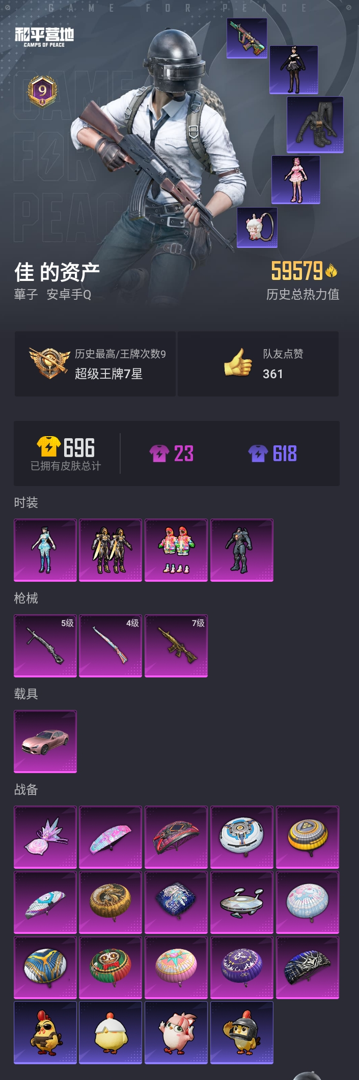 【和平精英】【lyhp21886】4粉装,3特效呛,1载具,历史最高段位:超级王牌7星 王牌印记9次 热力值:59579,143套装,192呛械,214装备,119战备;套装:角色-复仇流浪者,套装-炫光之旅,套装-创世·救赎,角色-异瞳寒姬,套装-骑行爱好者,套装-冰川格斗者,套装-深海格斗者,套装-帅气教官,套装-竞技名士,套装-黄色名流,套装-长空猛禽,套装-沙漠雄狮,套装-漫步者,套装-蓝色守护者,套装-灰色守护者,套装-海岛探路者,套装-特战装甲,套装-突袭者,套装-迎春赐吉,套装-潮流先锋,套装-龙腾端午,套装-燃烧卡路里,套装-鹰眼刺客,套装-冰冻风暴,套装-幻影武者,套装-怒火燎原,套装-朋克治安官,套装-夜莺强袭者,套装-都市漫游者,套装-都市魅力,套装-荣耀,套装-风行保卫者,套装-热血青春,套装-极地朋克,套装-幻世战舞者,套装-奇异狩猎者,套装-血色贵族,套装-呆萌铁蟹,套装-缤纷果语,套装-龙魂突击队,套装-冰川特警,套装-格斗先锋,套装-海上生明月,套装-麻辣教官,套装-梦魇先生,套装-深蓝冒险家,套装-迷域探索者,套装-精神漫游,套装-霓虹街区,套装-暗夜契约,套装-ss10特训,套装-ss8特训,套装-众神之王,套装-智慧之神,套装-软萌银虎,套装-白熊同盟,套装-萌黄之夏,套装-夏日音浪,套装-ss9特训,套装-探宝勇士,套装-辉星之火,套装-牛气满满,套装-韶华初心,套装-ss11特训,套装-青龙圣者,套装-原初圣火,套装-逆风勇士,套装-特种颜团子,套装-战术大师,套装-ss12特训,套装-牛气冲天,套装-ss18特训,套装-银白舞王,套装-ss13特训,套装-曼妙人鱼,套装-热情海星,套装-纯真浪花,套装-ss14特训,套装-快乐星愿,套装-星梦畅游,套装-暗夜傀儡,套装-ss17特训,套装-瑞龙福将,套装-团圆交子,套装-福星高照,套装-虎虎生威吉莉,套装-空投萌叽,套装-ss19特训,套装-ss20特训,套装-猎梦纪元,套装-甜心亚梦,套装-虚音幻奏,套装-ss21特训,套装-萌趣咩咩,套装-娇憨猪猪,套装-梦幻奶油,套装-玉兔迎春,套装-ss22特训,套装-轻风白浪,套装-绯格组合,套装-ss23特训,套装-甜梦熊熊,套装-神气柴柴,套装-懵萌河马,套装-ss24特训,套装-银松藏云,套装-涂山之恋,套装-ss25特训,套装-惊鸿侠骨,套装-锦衣飞扬,套装-香桃花海,套装-果汁能量,套装-龙的传人,套装-冰河战士,套装-ss26特训,套装-快闪甜心,套装-春光漫游,套装-空岛之星,套装-无暇誓言,套装-ss27特训,套装-老实芭蕉,套装-ss28特训,角色-拉斐尔,角色-情公主,套装-海盐绵绵冰,套装-创世·幻影,套装-创世·追猎,套装-ss29特训,角色-摩登魅猫,套装-星途旅人,套装-ss30特训,套装-ss31特训,套装-ss33特训,套装-巳巳如意,套装-ss32特训,套装-炫彩糖果,玩偶服-美羊羊,套装-ss34特训,套装-薄荷星砂,套装-ss35特训,套装-ss36特训,套装-雪国风尚,套装-萌鸡速递;呛皮:g36c-暗夜玫瑰,g36c-懵萌河马,g36c-乌木金纹,ac-val-甜心亚梦,ac-val-乌木金纹,ac-val-快闪甜心,mk47-乌木金纹,akm-生命誓言,akm-破晓战魂,akm-夜灯,akm-星之彼岸,akm-虎虎生威,akm-霓彩脉冲,akm-乌木金纹,7级m416-五爪金龙,m416-夜灯,m416-糯团青竹,m416-乌木金纹,scar-l-繁花小夜曲,scar-l-炫彩节奏,scar-l-彩虹符号,scar-l-玉兔迎春,scar-l-星途旅人,scar-l-海盐豹豹,scar-l-乌木金纹,m762-深海曼妙,m762-牛气冲天,m762-镭射皇者,m762-瑞龙福将,m762-彩虹符号,m762-彩虹甜喵,m762-乌木金纹,q-原初圣火,q-萌萌彩虹球,q-纯真浪花,q-乌木金纹,aug-耀粉歌者,aug-怪笑疯兔,蜜獾-娇憨猪猪,蜜獾-垂柳戏鸭,m16a4-快乐主宰,m16a4-夜灯,m16a4-甜心亚梦,m16a4-幻世战舞者,m16a4-冰河战士,m16a4-千金淑猫,ace32-冰晶雪宝,groza-影袭,groza-生命誓言,groza-懵萌河马,groza-海盐豹豹,groza-乌木金纹,famas-突变脉冲,莫辛纳甘-乌木金纹,莫辛纳甘-懵萌河马,awm-纯真浪花,awm-乌木金纹,4级kar98k-巳巳如意,kar98k-梦幻火箭,kar98k-勇闯险境,kar98k-马卡龙,kar98k-彩虹符号,kar98k-乌木金纹,svd-霓彩脉冲,m24-影袭,m24-众神之王,m24-乌木金纹,win94-瑞龙福将,win94-乌木金纹,amr-乌木金纹,m200-惊鸿侠骨,m200-乌木金纹,sks-迅猛狂鲨,sks-勇闯险境,sks-心之恋语,sks-炫彩节奏,slr-众神之王,slr-四圣焕新,slr-娇憨猪猪,slr-守护天翼,vss-镭射皇者,vss-星之彼岸,vss-香桃花海,vss-乌木金纹,mk20-h-快闪甜心,mk20-h-星途旅人,mk20-h-乌木金纹,mini14-金鼠迎春,mini14-原初圣火,mini14-炫彩节奏,mini14-涂山之恋,mk14-乌木金纹,mk14-冰河战士,m417-惊鸿侠骨,ump45-生命誓言,ump45-涂山之恋,ump45-猪猪侠,ump45-极意拳锋,aks-74u-乌木金纹,汤姆逊-勇闯险境,汤姆逊-炫彩节奏,汤姆逊-天降萌叽,汤姆逊-纯真浪花,汤姆逊-乌木金纹,uzi-影袭,uzi-众神之王,uzi-逆行者qq,uzi-匠心至美oppo,uzi-炫彩节奏,uzi-娇憨猪猪,uzi-冰河战士,uzi-梦海之灵,uzi-炫彩糖果,uzi-乌木金纹,vect-生命誓言,vect-创世·救赎,vect-乌木金纹,mp5k-众神之王,mp5k-蓝莓炮弹,mp5k-乌木金纹,野牛-乌木金纹,p90-快闪甜心,p90-巳巳如意,p90-乌木金纹,s12k-夜灯,s12k-pel轰鸣竞梦者,s12k-香水柠檬,s12k-瑞龙福将,s12k-娇憨猪猪,s12k-垂柳戏鸭,s12k-幻世战舞者,s12k-玩趣呆呆,s12k-守护天翼,s12k-霓彩脉冲,s12k-乌木金纹,s686-生命誓言,s686-彩虹符号,s686-乌木金纹,s1897-勇闯险境,s1897-炫彩节奏,dbs-甜心亚梦,dbs-创世·救赎,dbs-乌木金纹,aa12-g-纯真浪花,spas-12-狂鲨锋刃,spas-12-乌木金纹,mg-36-薄荷星砂,m249-四圣焕新,m249-星之彼岸,m249-彩虹符号,m249-乌木金纹,mg3-瑞龙福将,mg3-幻世战舞者,mg3-乌木金纹,mg3-惊鸿侠骨,5级dp-28-豹影疾电,dp-28-原初圣火,dp-28-锦绣火鲤,dp-28-齐天大圣,dp-28-甜心亚梦,dp-28-乌木金