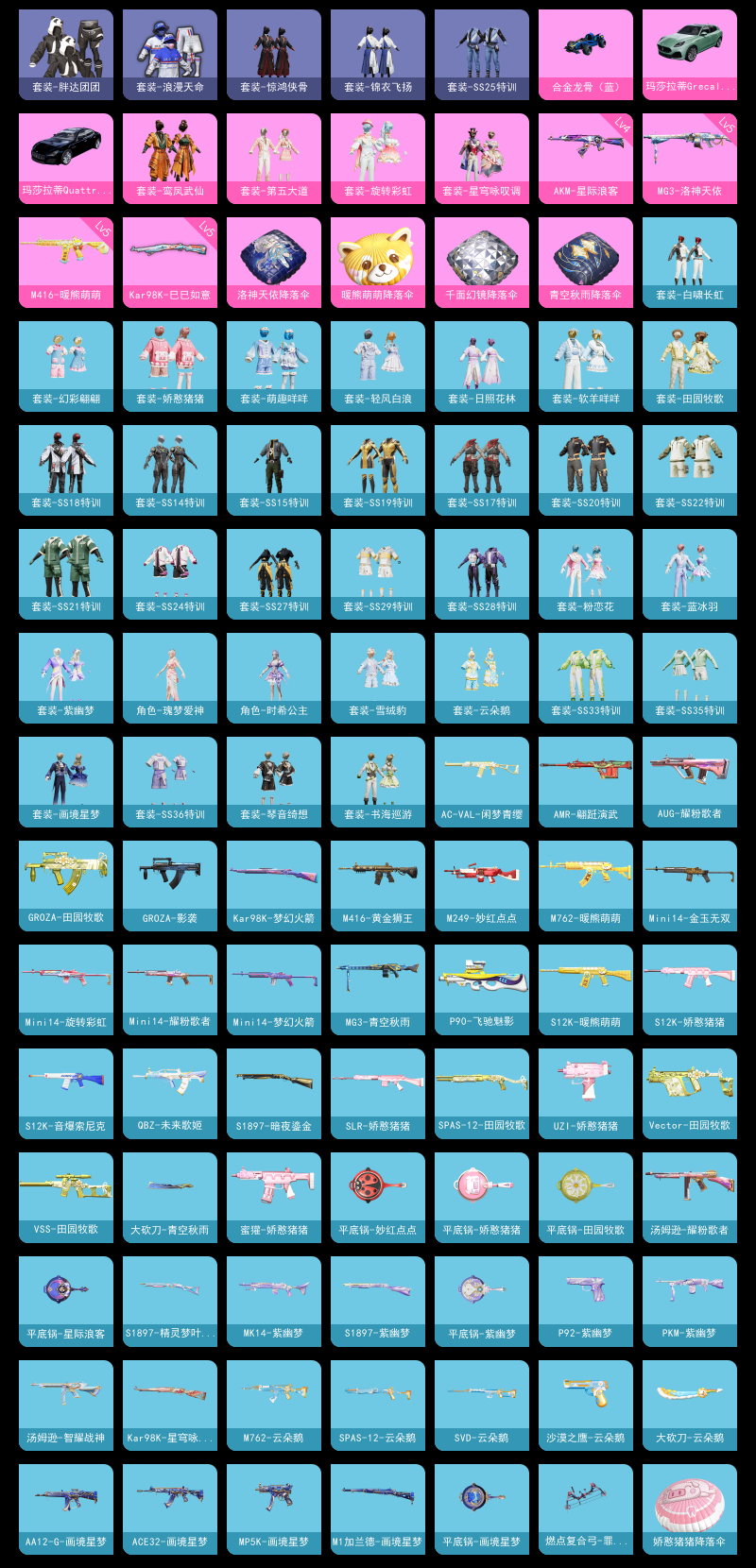【和平精英】【lyhp21849】4粉装,5特效呛,3载具,历史最高段位:传奇王牌18星 王牌印记3次 热力值:42595,96套装,134呛械,133装备,59战备;套装:套装-旋转彩虹,套装-鸾凤武仙,套装-第五大道,套装-星穹咏叹调,套装-红色运动,套装-黄色运动,套装-蓝色运动,套装-黄色伏地魔,套装-白色伏地魔,套装-黑色伏地魔,套装-冰川格斗者,套装-竞技名士,套装-深蓝色名流,套装-湖蓝色名流,套装-黄色名流,套装-长空猛禽,套装-海岛探路者,套装-旭日情侣,套装-冷焰舞者,套装-浪漫天命,套装-甜蜜告白,套装-蓝彩潮人,套装-怒火燎原,套装-魅力单车,套装-绮丽涂鸦,套装-耀眼新星,套装-都市漫游者,套装-荣耀,套装-幻世战舞者,套装-缤纷果语,套装-龙魂突击队,套装-胖达团团,套装-鹤鸣,套装-萌黄之夏,套装-战术大师,套装-ss18特训,套装-飞行日记,套装-ss14特训,套装-吉莉礼服,套装-ss15特训,套装-ss17特训,套装-福星高照,套装-虎虎生威吉莉,套装-ss19特训,套装-ss20特训,套装-软羊咩咩,套装-ss21特训,套装-萌趣咩咩,套装-娇憨猪猪,套装-ss22特训,套装-田园牧歌,套装-轻风白浪,套装-白啸长虹,套装-光之冒险,套装-绯格组合,套装-幻彩翩翩,套装-柠萌假日,套装-青玉碎影,套装-ss24特训,套装-日照花林,套装-龟仙人,套装-涂山之恋,套装-ss25特训,套装-惊鸿侠骨,套装-锦衣飞扬,套装-龙的传人,套装-冰河战士,套装-ss27特训,套装-老实芭蕉,套装-ss28特训,套装-街头风暴,套装-海盐绵绵冰,套装-蝶变,套装-ss29特训,角色-瑰梦爱神,套装-紫幽梦,套装-粉恋花,套装-ss33特训,套装-云朵鹅,套装-ss32特训,套装-青翼流星,套装-蓝冰羽,套装-顶瓜瓜,套装-雪绒豹,套装-大橘大利,角色-时希公主,套装-ss34特训,套装-ss35特训,套装-琴音绮想,套装-画境星梦,套装-书海巡游,套装-阳光菠萝,套装-ss37特训,套装-ss36特训,套装-雪国风尚,套装-萌鸡速递;呛皮:g36c-乌木金纹,ac-val-乌木金纹,ac-val-闲梦青缨,ace32-画境星梦,ace32-冰晶雪宝,scar-l-红色方程式,scar-l-炫彩节奏,scar-l-玉兔迎春,scar-l-海盐豹豹,scar-l-绿洲时空,groza-影袭,groza-田园牧歌,mk47-乌木金纹,aug-耀粉歌者,aug-天降萌叽,aug-异域银装,5级m416-暖熊萌萌,m416-蓝色火焰,m416-红色方程式,m416-黄金狮王,m16a4-幻世战舞者,m16a4-冰河战士,4级akm-星际浪客,akm-夜灯,akm-虎虎生威,akm-龙的传人,蜜獾-娇憨猪猪,蜜獾-天降萌叽,蜜獾-鸡智如我,蜜獾-乌木金纹,m762-暖熊萌萌,m762-天降萌叽,m762-云朵鹅,famas-乌木金纹,q-彩虹符号,q-未来歌姬,5级kar98k-巳巳如意,kar98k-梦幻火箭,kar98k-彩虹符号,kar98k-星穹咏叹调,svd-云朵鹅,amr-翩跹演武,awm-天降萌叽,m200-惊鸿侠骨,m24-乌木金纹,slr-娇憨猪猪,slr-乌木金纹,mini14-金玉无双,mini14-梦幻火箭,mini14-炫彩节奏,mini14-耀粉歌者,mini14-旋转彩虹,mini14-涂山之恋,5级mk14-甜梦熊击,mk14-乌木金纹,mk14-冰河战士,mk14-紫幽梦,vss-田园牧歌,vss-彩虹符号,m1加兰德-画境星梦,m417-惊鸿侠骨,m417-玩趣呆呆,mk12-乌木金纹,mk20-h-乌木金纹,p90-飞驰魅影,p90-乌木金纹,ump45-夜灯,ump45-蓝色火焰,ump45-涂山之恋,ump45-海盐豹豹,mp5k-画境星梦,mp5k-乌木金纹,vect-生命誓言,vect-彩虹符号,vect-田园牧歌,uzi-炫彩节奏,uzi-娇憨猪猪,uzi-天降萌叽,uzi-冰河战士,汤姆逊-耀粉歌者,汤姆逊-智耀战神,野牛-乌木金纹,s12k-破晓战魂,s12k-暖熊萌萌,s12k-娇憨猪猪,s12k-音爆索尼克,s12k-玩趣呆呆,spas-12-田园牧歌,spas-12-狂鲨锋刃,spas-12-云朵鹅,s686-红色方程式,s686-生命誓言,s1897-炫彩节奏,s1897-暗夜鎏金,s1897-精灵梦叶罗丽,s1897-紫幽梦,s1897-乌木金纹,dbs-彩虹符号,dbs-乌木金纹,aa12-g-画境星梦,5级mg3-洛神天依,mg3-乌木金纹,mg3-青空秋雨,mg3-惊鸿侠骨,mg3-霓彩脉冲,pkm-紫幽梦,m249-妙红点点,m249-冰晶雪宝,m249-乌木金纹,dp-28-彩虹符号,mg-36-薄荷星砂,蝎式手呛-欢乐香蕉,沙墨之鹦-云朵鹅,p92-紫幽梦,平底锅-星际浪客,平底锅-娇憨猪猪,平底锅-田园牧歌,平底锅-光之冒险,平底锅-妙红点点,平底锅-惊鸿侠骨,平底锅-紫幽梦,平底锅-属我最6,平底锅-画境星梦,大砍刀-青空秋雨,大砍刀-云朵鹅,撬棍-冰晶雪宝,破片手留单-海盐豹豹,破片手留单-拽到爆炸,破片手留单-巳巳如意,破片手留单-爆破雪人,燃点复合弓-罪夜之冕,爆炸猎弓-惊鸿侠骨,燃烧瓶-福马献瑞,十子怒-异域银装;载具:合金龙骨(蓝),玛莎拉蒂grecale薄荷绿,玛莎拉蒂quattropte夜幕蓝;降落伞:粉色滑翔尾迹,破刃行动尾迹,登顶巅峰飞行器,马上有福飞行器; 详情看图4粉装5特效呛3载具 第五大道 胖达团团 浪漫天命 5级m4暖熊萌萌 4级akm星际浪客 5级mg3洛天神依 玛莎拉蒂 合金龙骨地铁满天赋