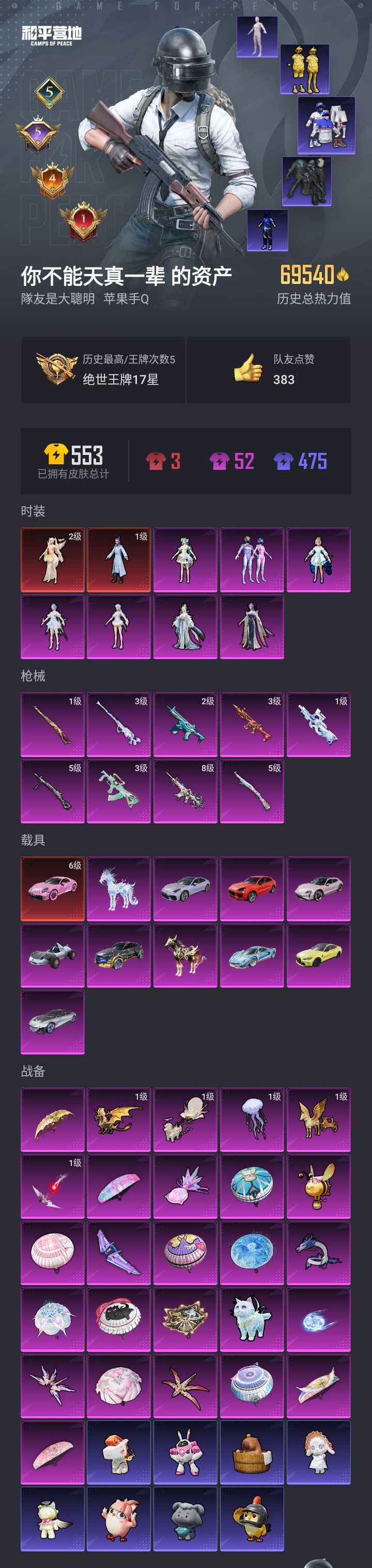【和平精英】【lyhp21885】7粉装,9特效呛,11载具,历史最高段位:绝世王牌17星 王牌印记5次 热力值:69540,85套装,144呛械,213装备,84战备;套装:精灵之光-露米娜,魔童闹海-敖丙,套装-梦幻火箭,角色-洛天依,角色-霁蓝缠春,角色-天穹,角色-宁雨蝶,角色-荧海星豚,角色-冰魄,套装-黄色运动,套装-漫步者,套装-都市猎人,套装-浪漫天命,套装-春日漫步,套装-沙漠毒蛇,套装-鹰眼刺客,套装-冰冻风暴,套装-魅力单车,套装-超能勇士,套装-迅捷狂鲨,套装-夏日倾情,套装-缤纷果语,套装-元素星魂,套装-沙暴袭击者,套装-小丑鱼,套装-冥河战士,套装-破蛋小黄鸡,套装-战术大师,套装-天籁歌者,套装-快乐星愿,套装-tt战队服,套装-香桃花海,套装-漫游都市,角色-绯色魅影,角色-紫俏灵猫,套装-异域银装,角色-都市丽猫,套装-ss30特训,套装-青团波波,角色-夜瞳黯灵,套装-糖糖葫芦,套装-ss31特训,套装-鱼渊荷华,套装-燕燕于飞,角色-风玲,套装-ss33特训,套装-烈焰独狼,套装-云朵鹅,套装-巳巳如意,套装-ss32特训,套装-彩虹兔,套装-青翼流星,套装-荒原牛仔,套装-雪绒豹,套装-狂鲨锋刃,角色-蛇蝎美人,角色-灵公主,套装-炫彩糖果,角色-乐音,玩偶服-懒羊羊,套装-蓝海鲸歌,套装-绯夜呢喃,套装-元气之梦,套装-ss34特训,套装-擎苍青焰,套装-极光猎影,套装-朱霞炽焰,角色-申公豹,套装-游乐,套装-凌霄紫焰,套装-薄荷星砂,套装-ss35特训,套装-午间小调,套装-秘语星愿,套装-风迹短诗,套装-琴音绮想,套装-粉黛兰香,套装-画境星梦,套装-书海巡游,套装-阳光菠萝,套装-ss36特训,角色-霜刃之御,套装-红釉青花,套装-雪国风尚,套装-萌鸡速递;呛皮:3级groza-无垠阁,groza-影袭,groza-暮色玫影,groza-福马献瑞,2级蜜獾-异瞳寒姬,蜜獾-糖糖葫芦,蜜獾-绯穹魔姬,蜜獾-风迹短诗,蜜獾-冰澜龙吟,akm-影袭,akm-涂鸦街区,akm-极光猎影,akm-玄冥寒域,akm-灵猫魔法师,akm-霓彩脉冲,3级scar-l-魔童闹海 哪吒,scar-l-红色方程式,scar-l-彩虹符号,scar-l-冷漠罗丽,aug-异域银装,aug-月影灵韵,g36c-蛇蝎美人,m762-彩虹符号,m762-云朵鹅,8级m416-灵猫魔法师,m416-蓝色火焰,m416-红色方程式,ace32-画境星梦,ace32-冰晶雪宝,m16a4-冥河战士,m16a4-最终圣卫者,famas-霓彩脉冲,famas-乌木金纹,arx-凌霄紫焰,mk47-风迹短诗,q-彩虹符号,3级m200-梦海之灵,m200-次元竞界,m200-乌木金纹,svd-冷漠罗丽,svd-云朵鹅,awm-黄金龙骨,awm-天降萌叽,amr-喜羊羊与灰太狼,amr-雨过天青,1级kar98k-圣域龙灵,5级kar98k-巳巳如意,kar98k-影袭,kar98k-梦幻火箭,莫辛纳甘-风迹短诗,win94-乌木金纹,m24-影袭,mini14-香桃花海,mini14-绯穹魔姬,mini14-鸡智如我,m417-玩趣呆呆,m1加兰德-画境星梦,mk20-h-糖糖葫芦,mk20-h-狂鲨锋刃,mk20-h-蛇蝎美人,slr-霓彩脉冲,slr-乌木金纹,vss-香桃花海,mk12-风迹短诗,mk12-乌木金纹,sks-迅猛狂鲨,sks-圣域龙灵,mk14-薄荷星砂,汤姆逊-灵猫魔法师,mp5k-画境星梦,1级p90-魔童闹海 敖丙,p90-巳巳如意,p90-宁雨蝶,uzi-影袭,uzi-炫彩节奏,uzi-炫彩糖果,ump45-炫光之旅,ump45-糖糖葫芦,野牛-燕燕于飞,vect-燕燕于飞,aks-74u-极光猎影,aks-74u-鸡智如我,aks-74u-乌木金纹,js9-凌霄紫焰,js9-辉云木星,spas-12-燕燕于飞,spas-12-狂鲨锋刃,spas-12-云朵鹅,spas-12-乌木金纹,aa12-g-精灵之光,aa12-g-画境星梦,aa12-g-雨过天青,dbs-荧海星豚,dbs-风迹短诗,s686-巳巳如意,s12k-霓彩脉冲,m249-星之彼岸,m249-沙丘之主,m249-绯穹魔姬,m249-冰晶雪宝,pkm-啾咪啾咪,pkm-雨过天青,mg3-幻世战舞者,mg3-梦海之灵,mg-36-凌霄紫焰,mg-36-薄荷星砂,5级dp-28-豹影疾电,短管霰弹-圣域龙灵,p18c-糖糖葫芦,蝎式手呛-欢乐香蕉,蝎式手呛-燕燕于飞,蝎式手呛-蛇蝎美人,电击呛-喜羊羊与灰太狼,电击呛-辉云木星,信号呛-异瞳寒姬,p92-凌霄紫焰,沙墨之鹦-羲和光序,沙墨之鹦-云朵鹅,沙墨之鹦-雨过天青,大砍刀-云朵鹅,大砍刀-冰澜龙吟,撬棍-冥河战士,撬棍-沙丘之主权杖,撬棍-冷漠罗丽,撬棍-灵猫魔法师,撬棍-冰晶雪宝,平底锅-时空协奏,平底锅-糖糖葫芦,平底锅-凌霄紫焰,平底锅-画境星梦,铝热弹-炫彩糖果,爆炸猎弓-精灵之光,爆炸猎弓-圣斗士星矢,爆炸猎弓-喜羊羊与灰太狼,燃点复合弓-火尖莲影,盐雾蛋-冰氧夏日,盐雾蛋-冰澜龙吟,十子怒-异瞳寒姬,十子怒-燕燕于飞,十子怒-异域银装,破片手留单-拽到爆炸,破片手留单-巳巳如意,破片手留单-火尖莲影,燃烧瓶-福马献瑞;载具:星河领航磐石银,宝马m4圣保罗黄,保时捷panamera星辰紫,霜龙神御云雾蓝,保时捷taycan 旅行版冰莓粉,炽龙极锋暗夜黑,保时捷cayenne激情红,6级保时捷911 敞篷版小暴龙,黑曜夜骑,冰绡玉鳞,灵鼠银迹;降落伞:梦幻火箭飞行器,祥瑞起舞飞行器,终晖之翼飞行器,宁雨蝶飞行器,灵猫魔法师飞行器,提桶跑路飞行器,炫彩糖果飞行器,灵珠游龙飞行器,沙丘之主天马,幻海精灵飞行器,圣域金龙飞行器,暮色之舞飞行器,香车宝马飞行器,异域银装飞行器,狂鲨锋刃飞行器; 详情看图2红装7粉装9特效呛11载具 2级露米娜 1级敖丙 霁蓝缠春 梦幻火箭 洛天依 冰魄 荧海星豚 冥河战士 都市猎人 阳光菠萝 浪漫天命 3级狗杂无垠阁 3级死噶魔童闹海 8级m4灵猫魔法师 p90魔童闹海 满级保时捷911 黑曜夜骑 霜龙神御